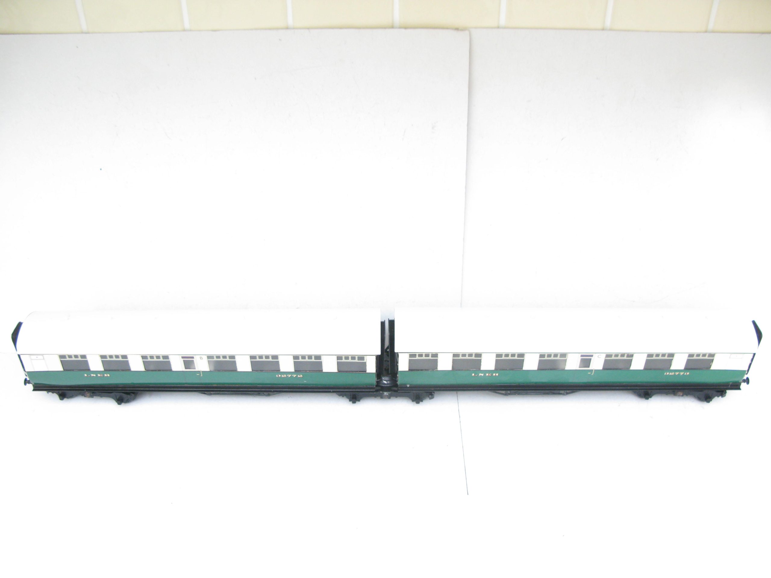 Ace 0 Gauge Modern issue C/10 series tourist Excursion set LNER Tourist stock 6-car set – Boxed – Produced by Ace Trains is this 6-car tourist Excursion set which includes a Coach F Buffer Car, coach A Brake Passenger coach, D & E Articulated coaches and B & C Articulated coaches all in LNER Tourist stock Cream and Green finish. The coaches are fitted with lighting but there are no 3rd rail pick-ups to light the coaches and there no interiors have been fitted. The set has seen little use in Near Mint to Mint condition and boxed with the outer mailer box. A great opportunity to add this to your vintage and modern course scale collection.