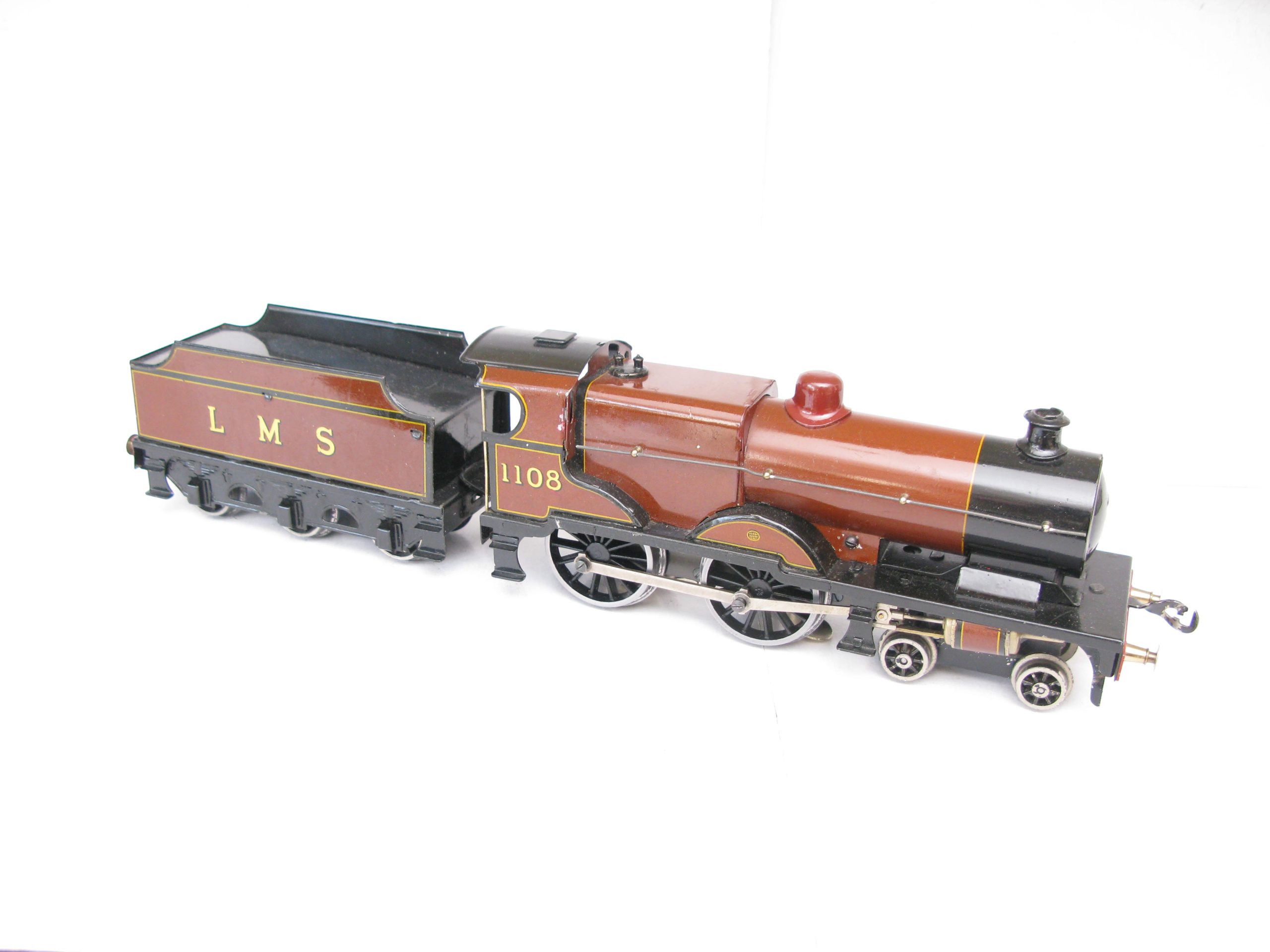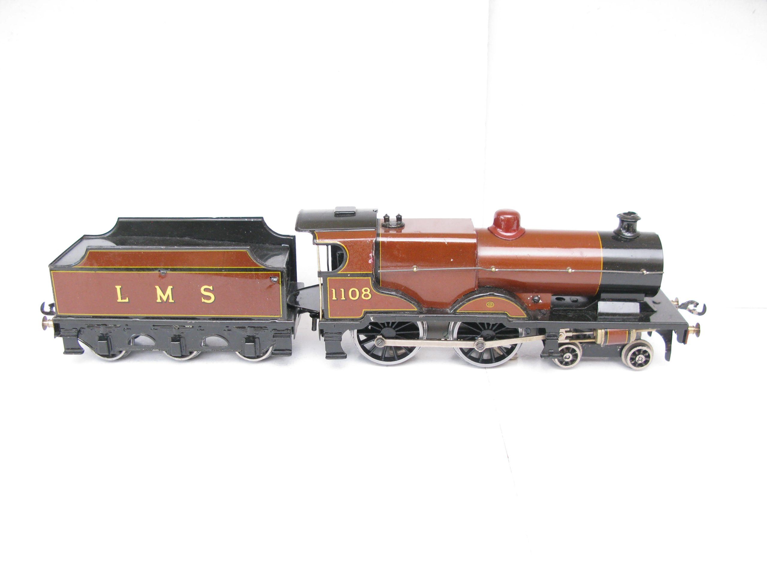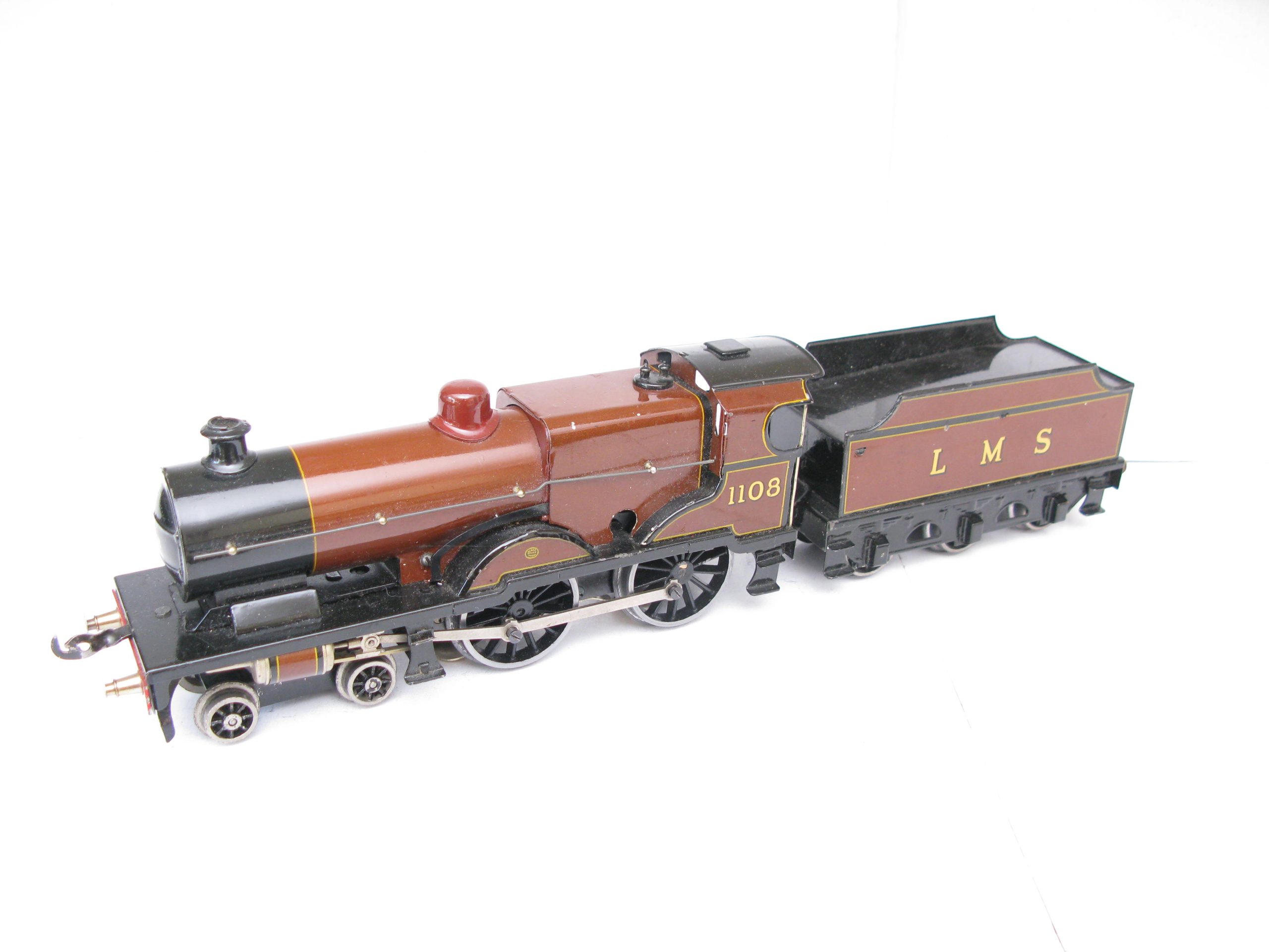 Bassett Lowke 0 Gauge 4-4-0 Loco & Tender LMS Brown Compound No.1108, 3-rail electric – unboxed – From the range of 4-coupled Locomotive produced by Bassett lowke were a number of different Compound locomotives this example is in brown and black with running number 1108 to cab sides and LMS lettering to the Tender sides sides. The Loco has been fitted with a Modern Can type 3-rail electric motor in Excellent running condition a great opportunity to add to any Bassett Lowke/Vintage 0 Gauge collection.