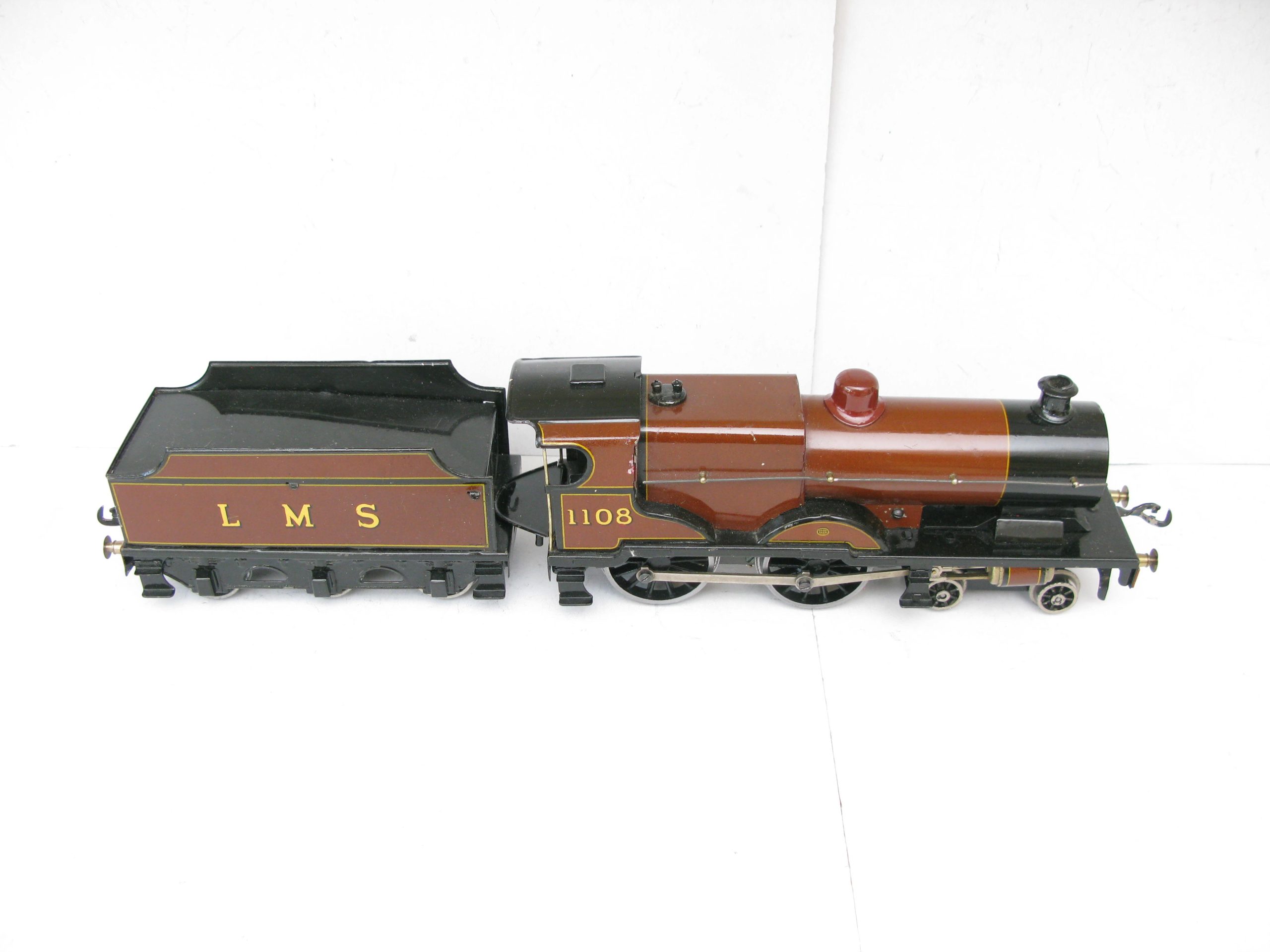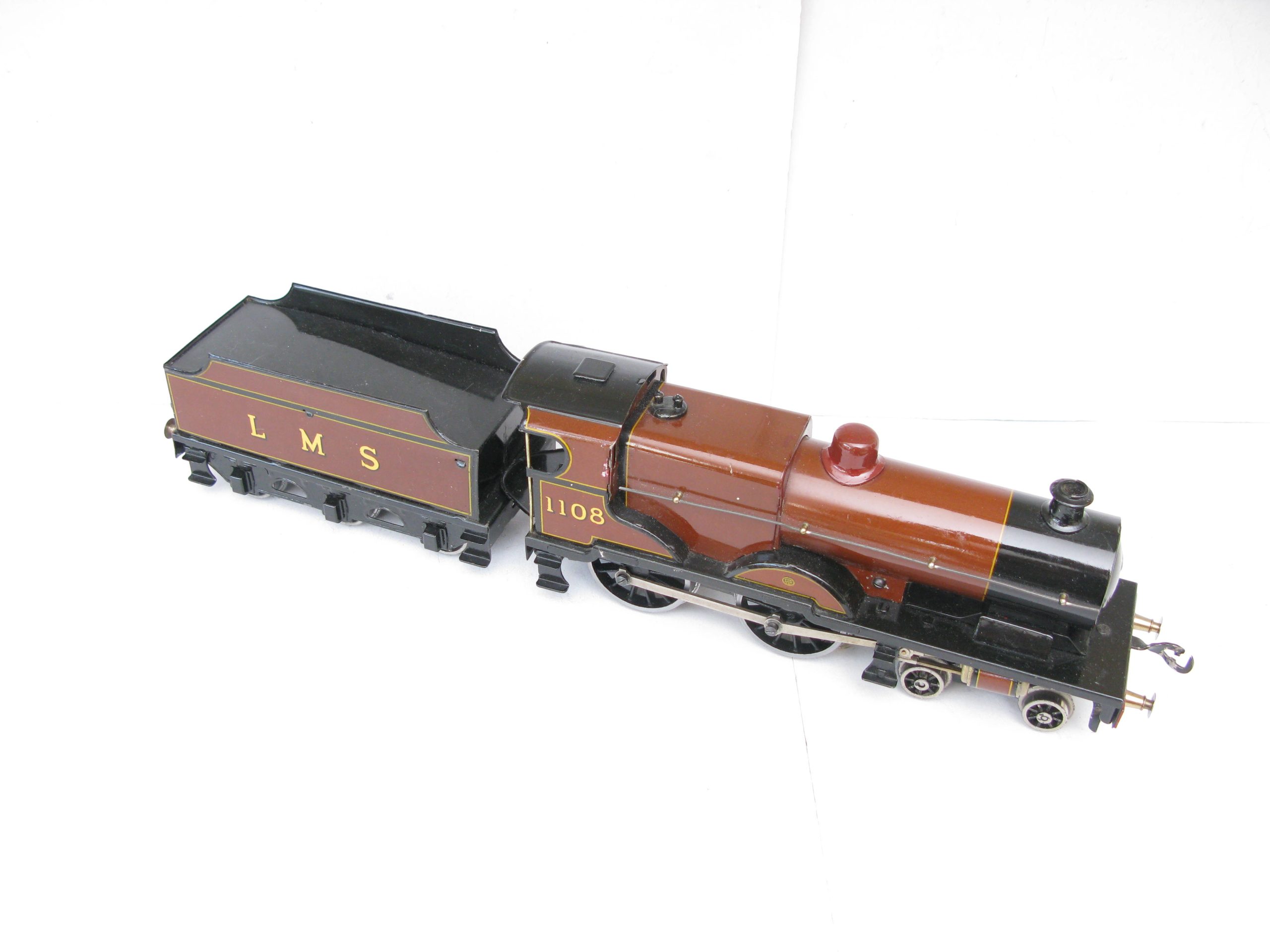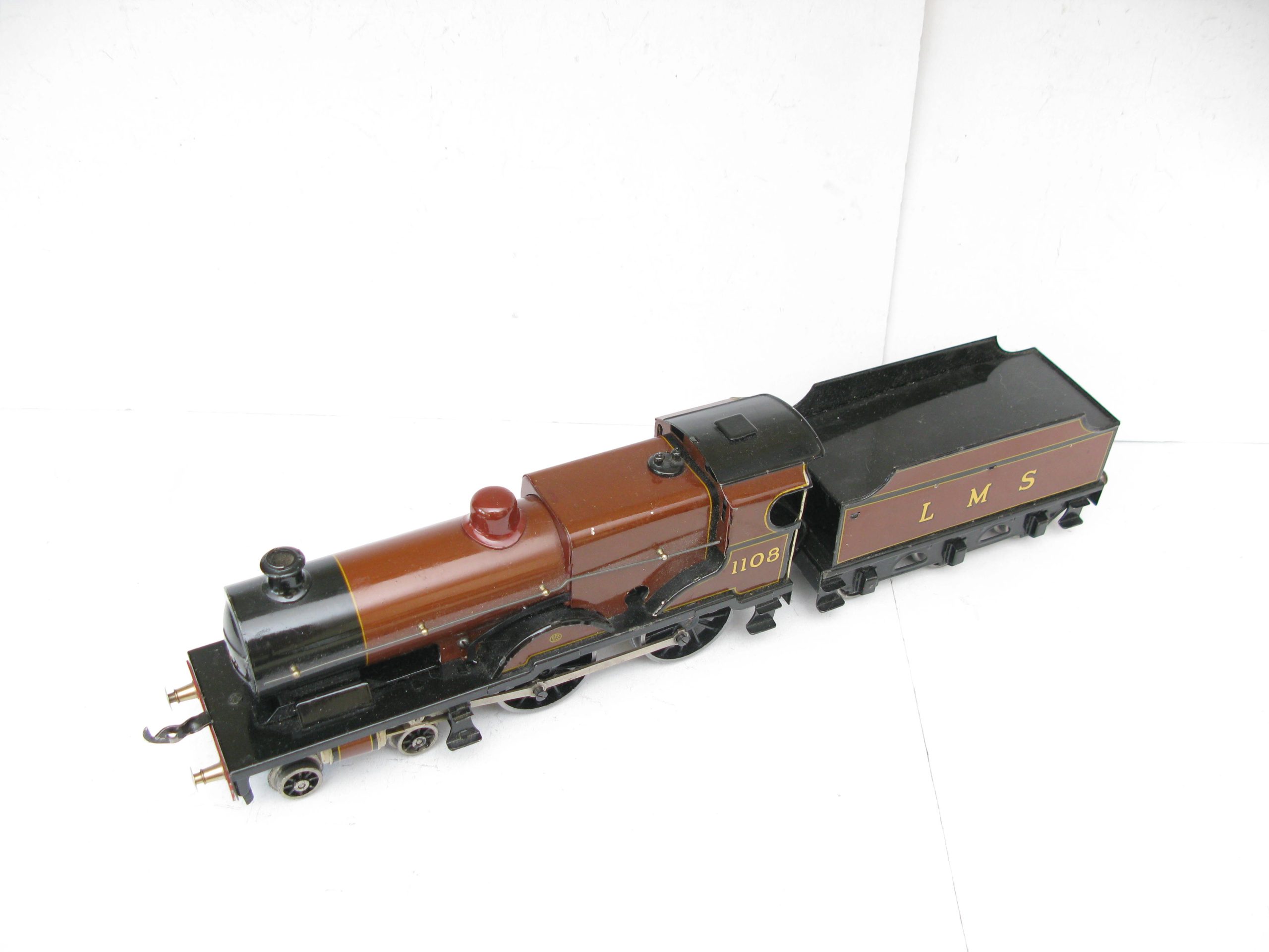 Bassett Lowke 0 Gauge 4-4-0 Loco & Tender LMS Brown Compound No.1108, 3-rail electric – unboxed – From the range of 4-coupled Locomotive produced by Bassett lowke were a number of different Compound locomotives this example is in brown and black with running number 1108 to cab sides and LMS lettering to the Tender sides sides. The Loco has been fitted with a Modern Can type 3-rail electric motor in Excellent running condition a great opportunity to add to any Bassett Lowke/Vintage 0 Gauge collection.