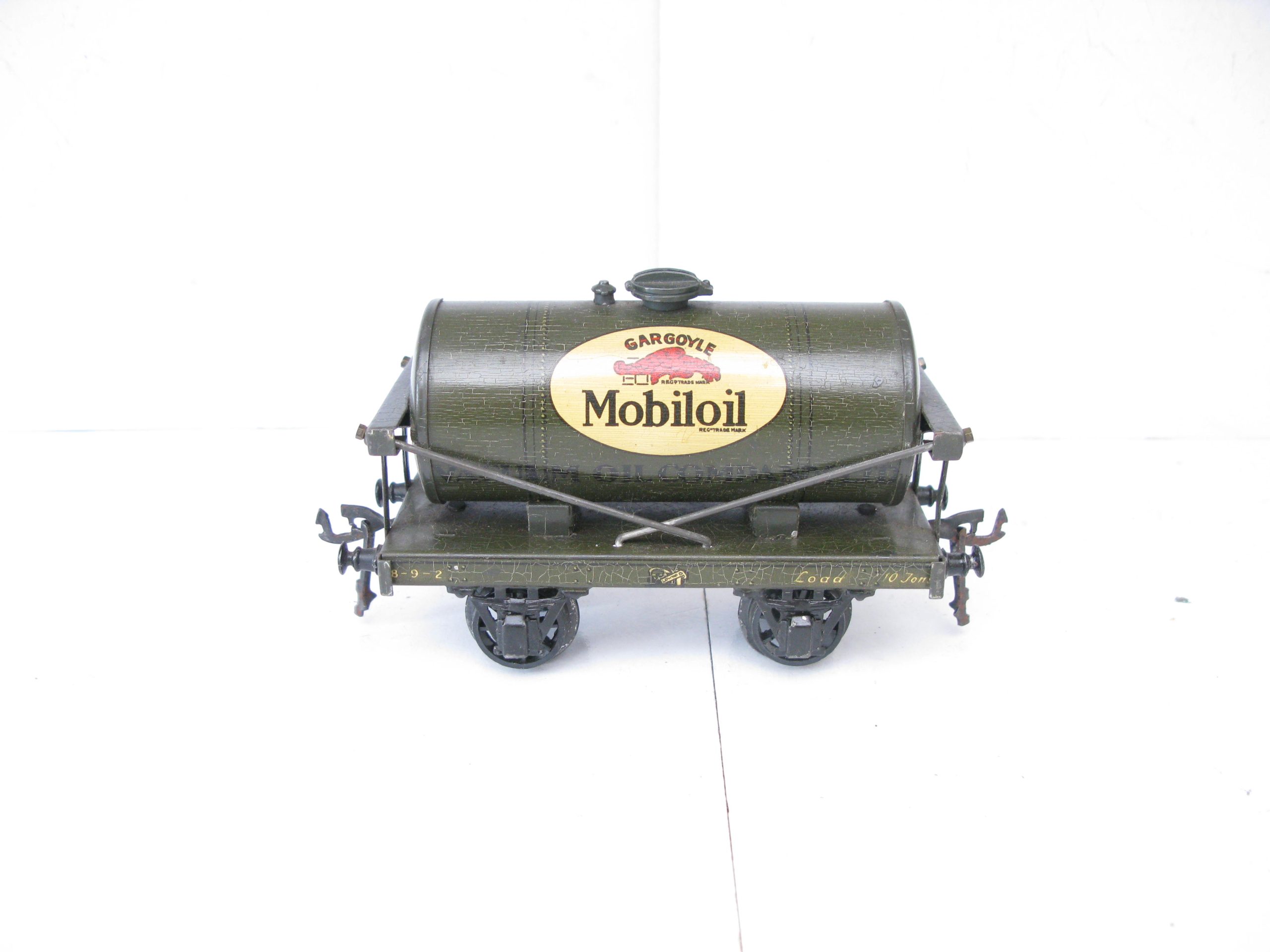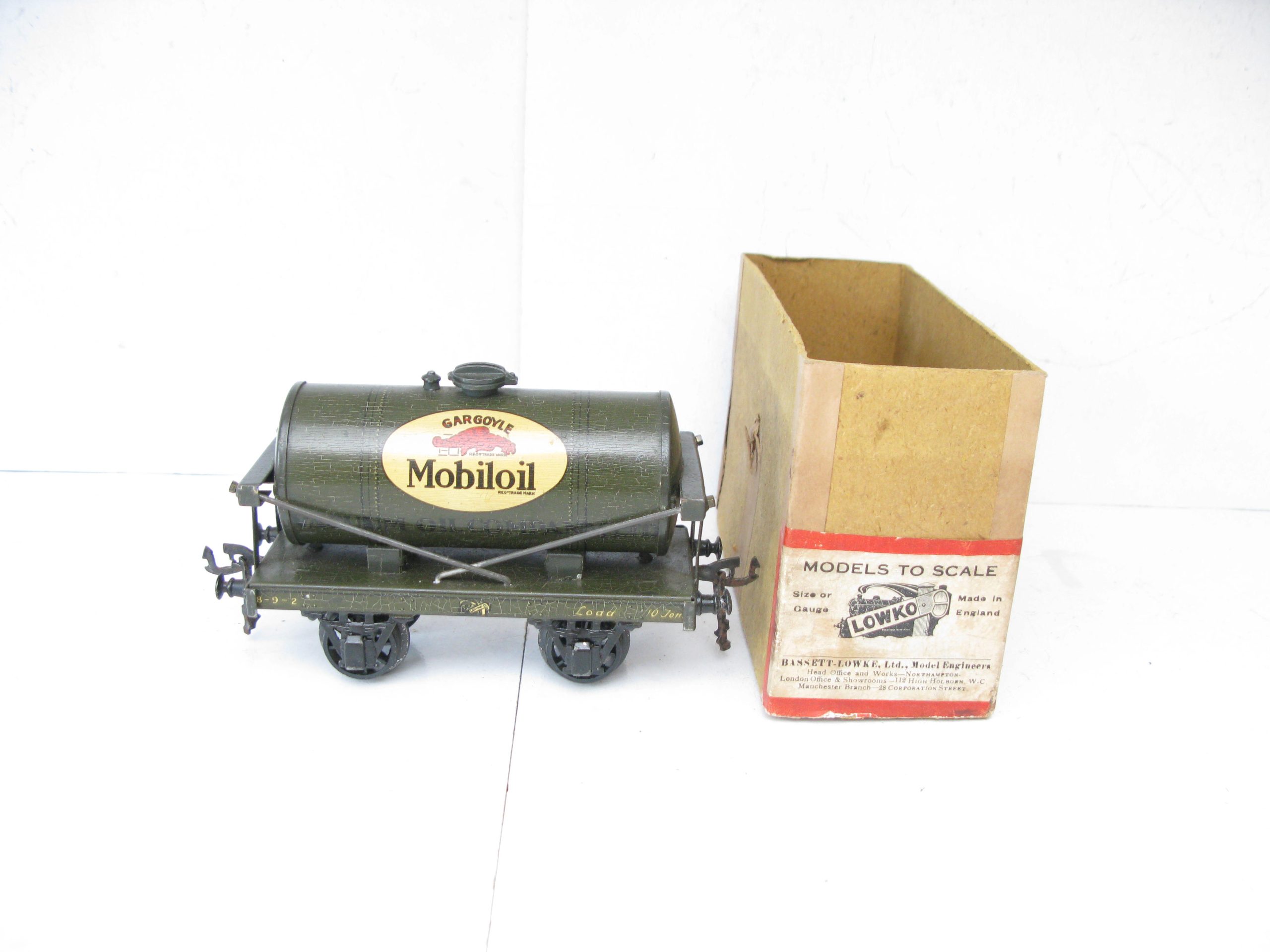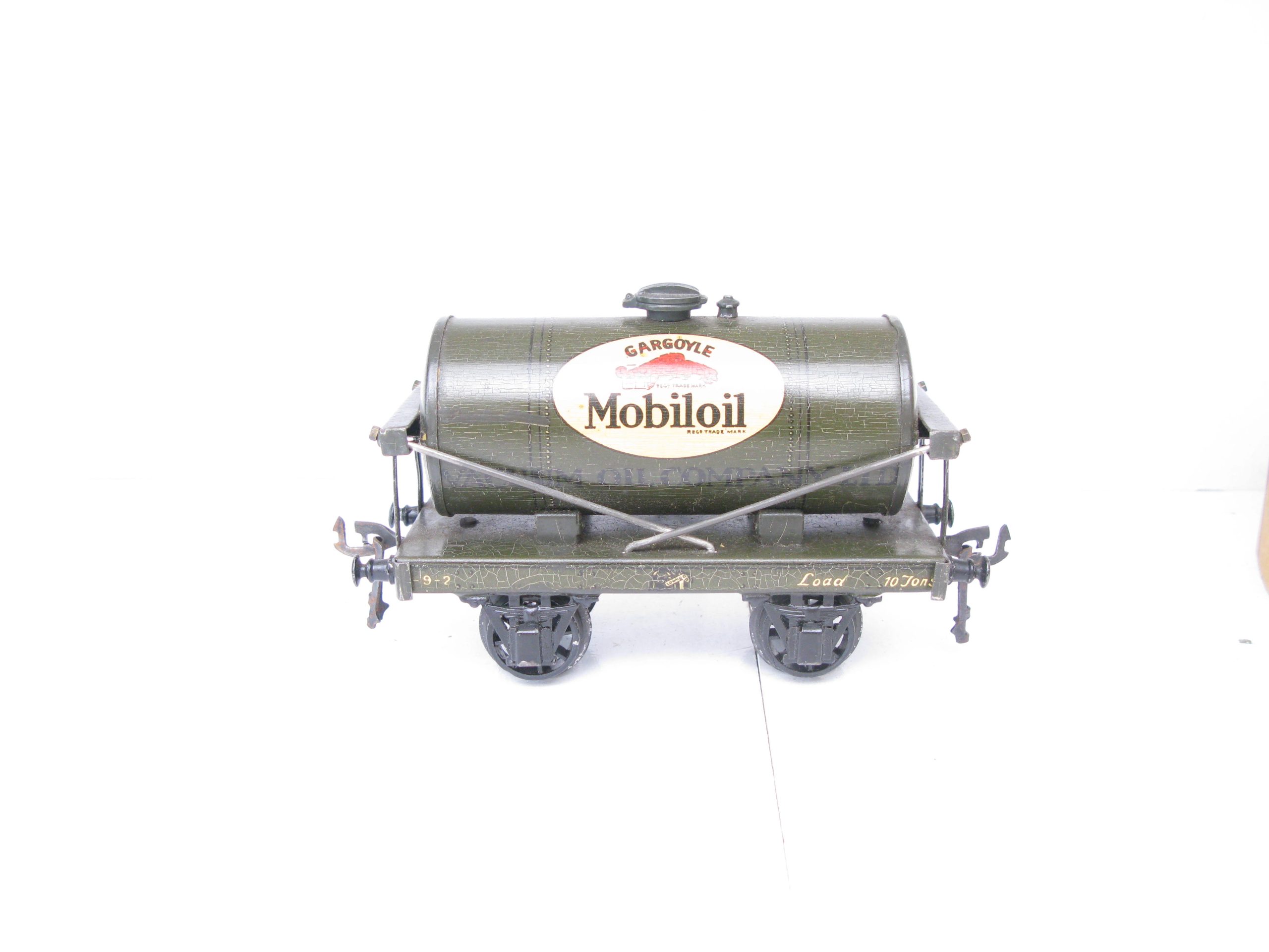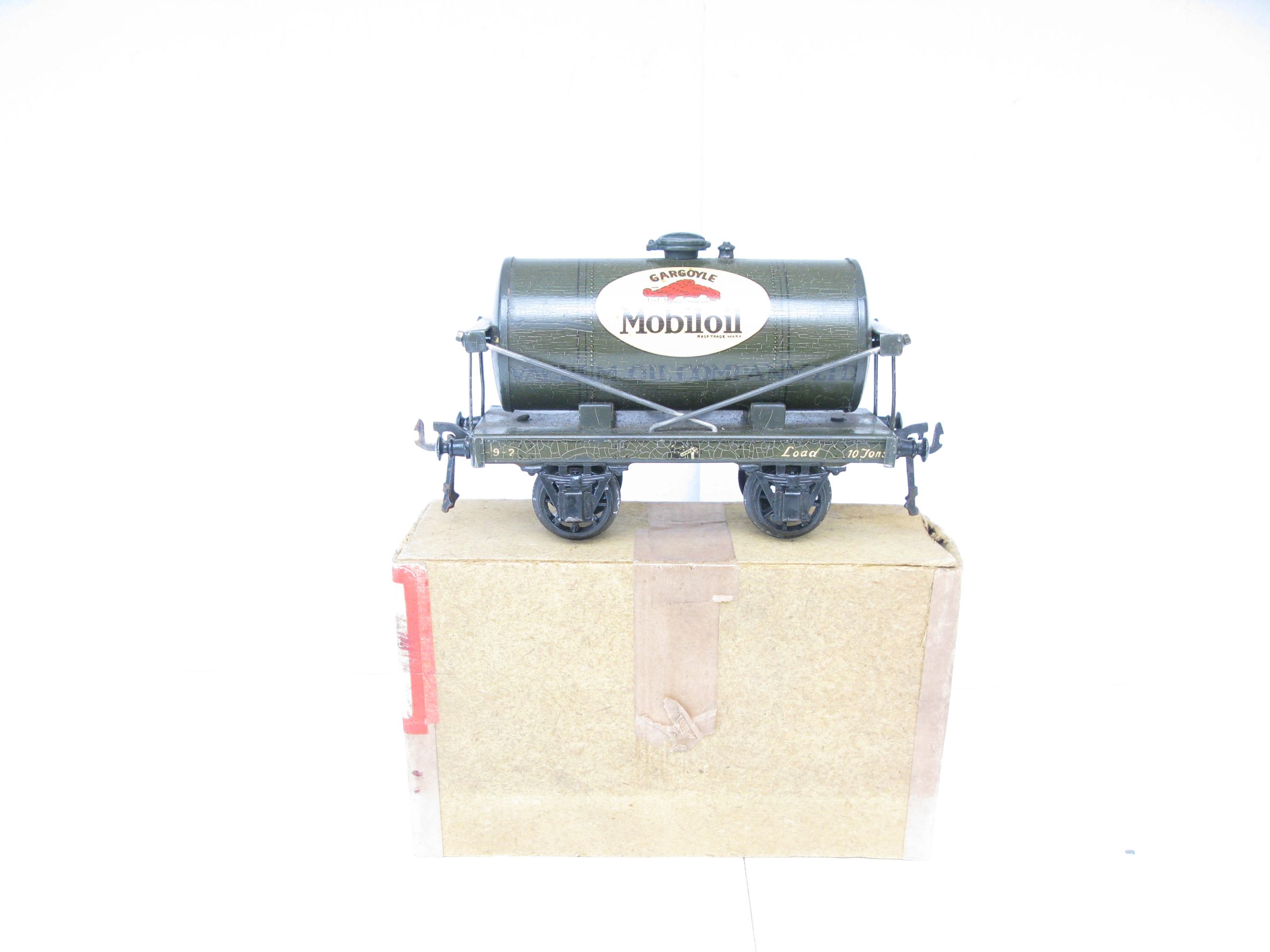 Bassett Lowke (Winteringham) 0 Gauge MOBILOIL Tanker Part Boxed – Here is a Winteringham produced for Bassett Lowke Tin printed ‘MOBILOIL’ Tanker in dark Grey color with the ‘MOBILOIL’ logo to the centre of both sides of the Tank, overall Excellent in the box base. Bassett Lowke produced 4 different version of this Tanker and here is the ‘MOBILOIL’ in Dark Grey. A great addition to your Bassett Lowke Vintage collection