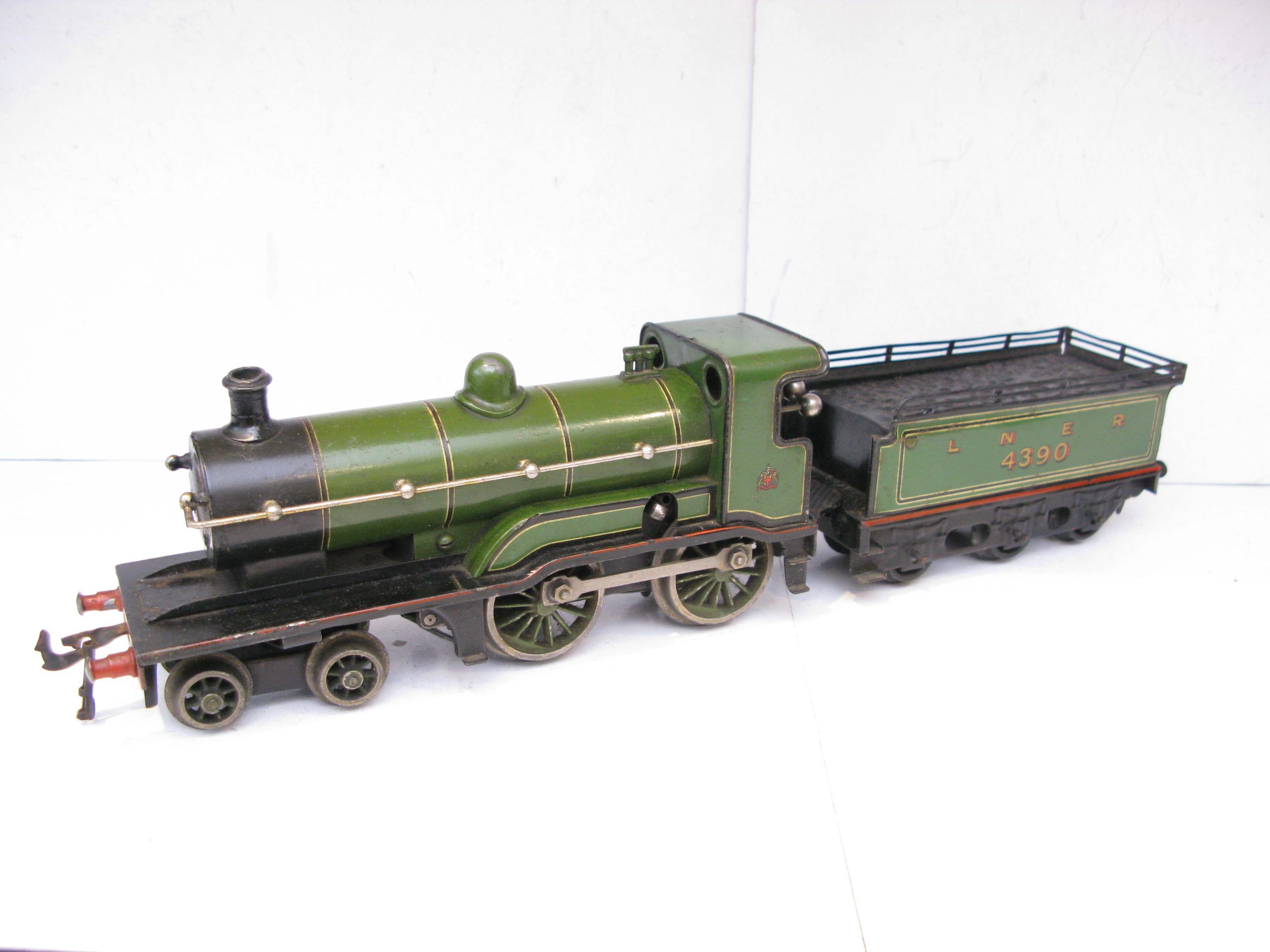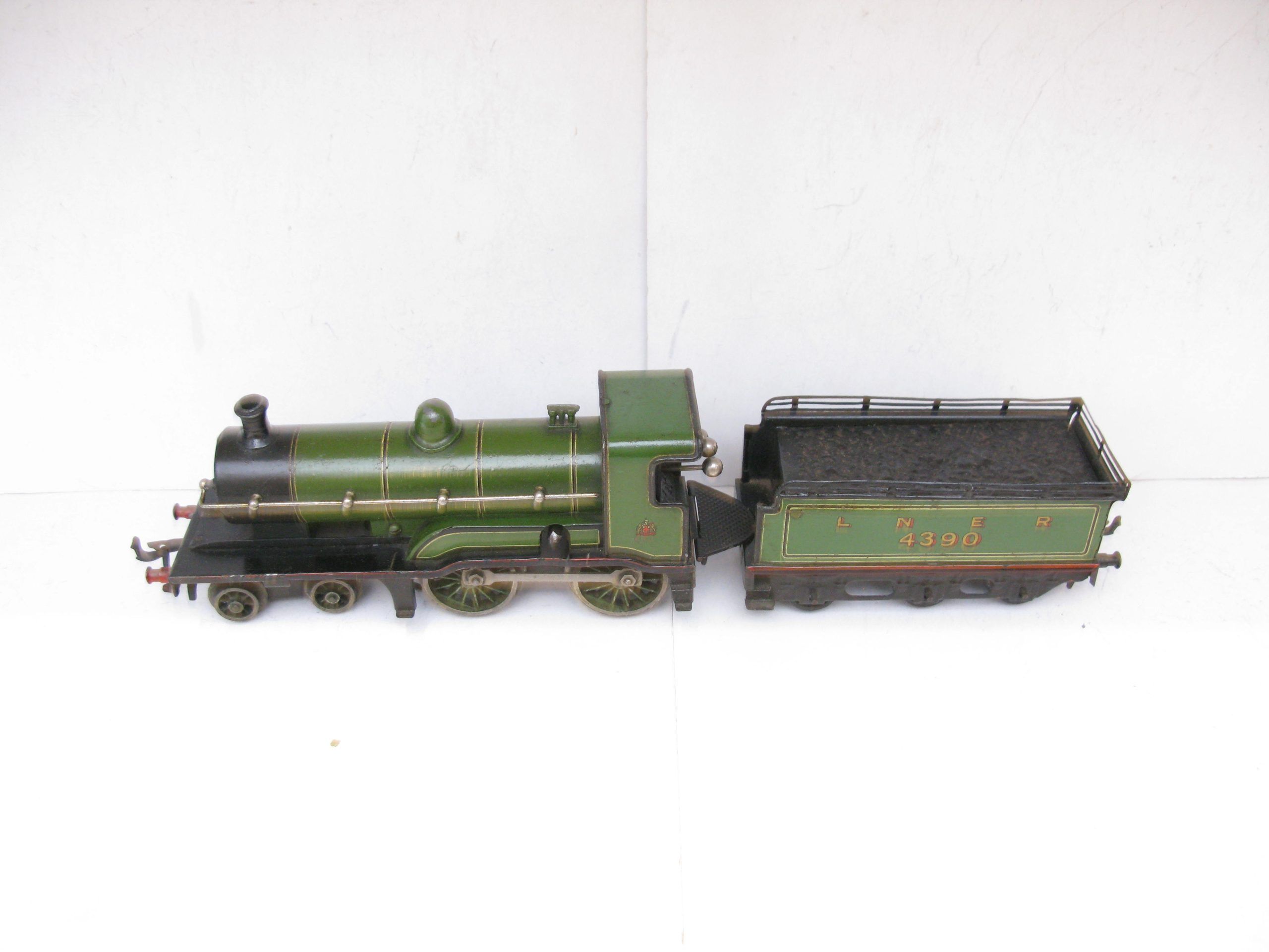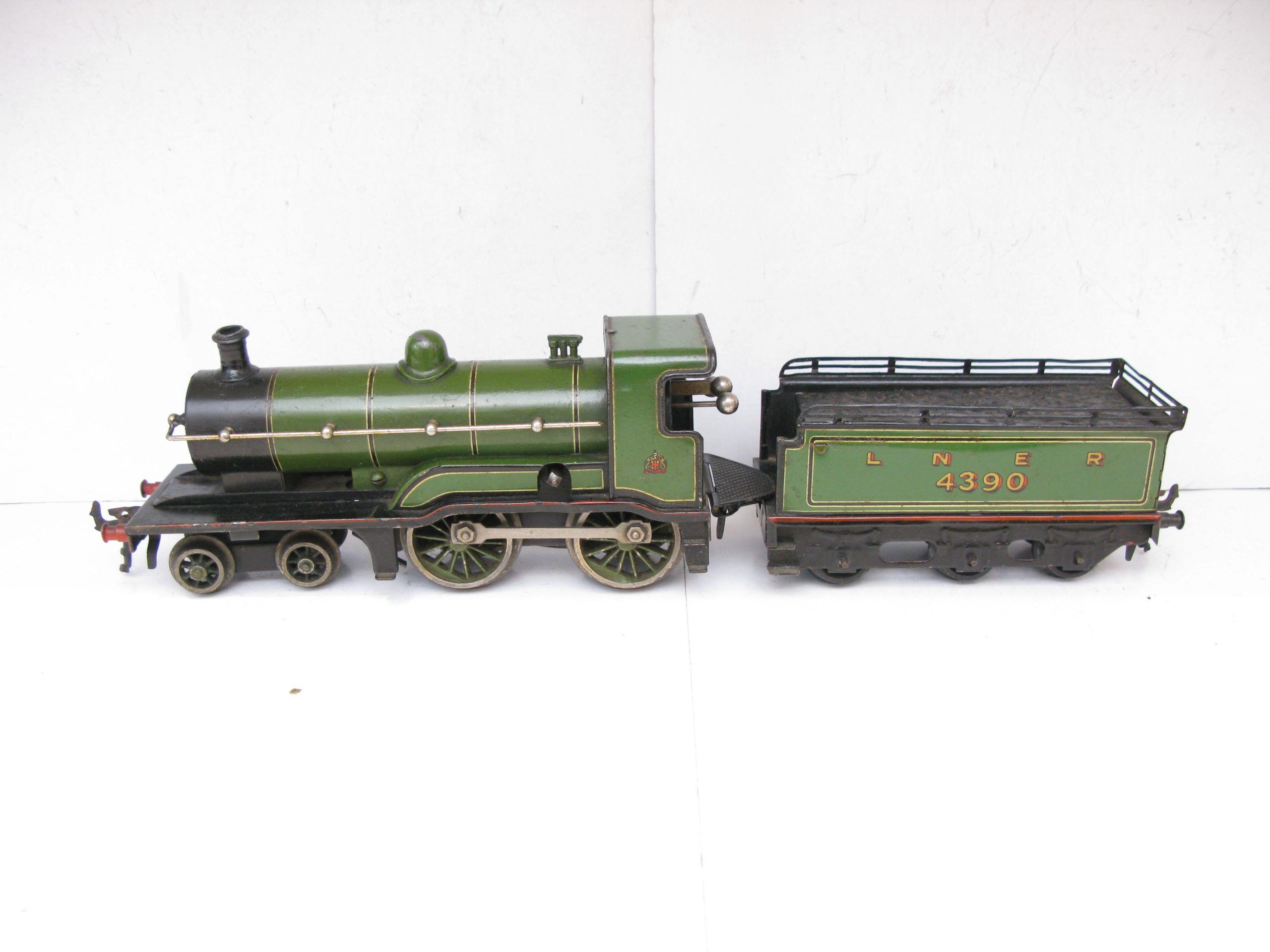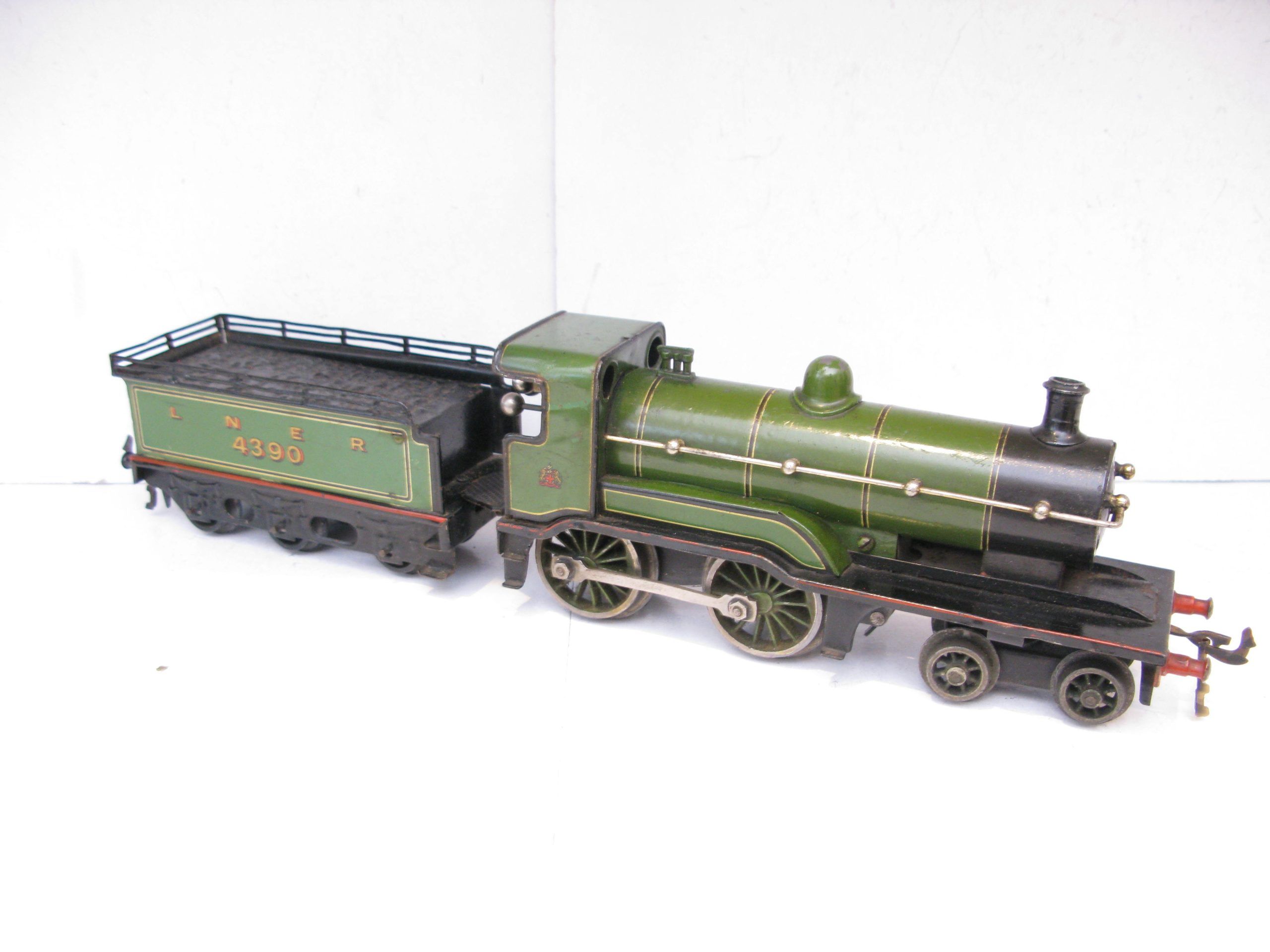 Bing 0 Gauge 4-4-0 Loco & Tender LNER grenn No.4390, Clockwork – unboxed – Good/plus to Excellent – Bing produced a number of Locomotives for the english market and with this 4-4-0 Loco & Tender in lined green from the mid 1920’s. This example is Clockwork, with the LNER lettering and the Running number 4390 to the Tender sides. Overall Good/plus to Excellent unboxed. A great addition to any Vintage toy train collection –