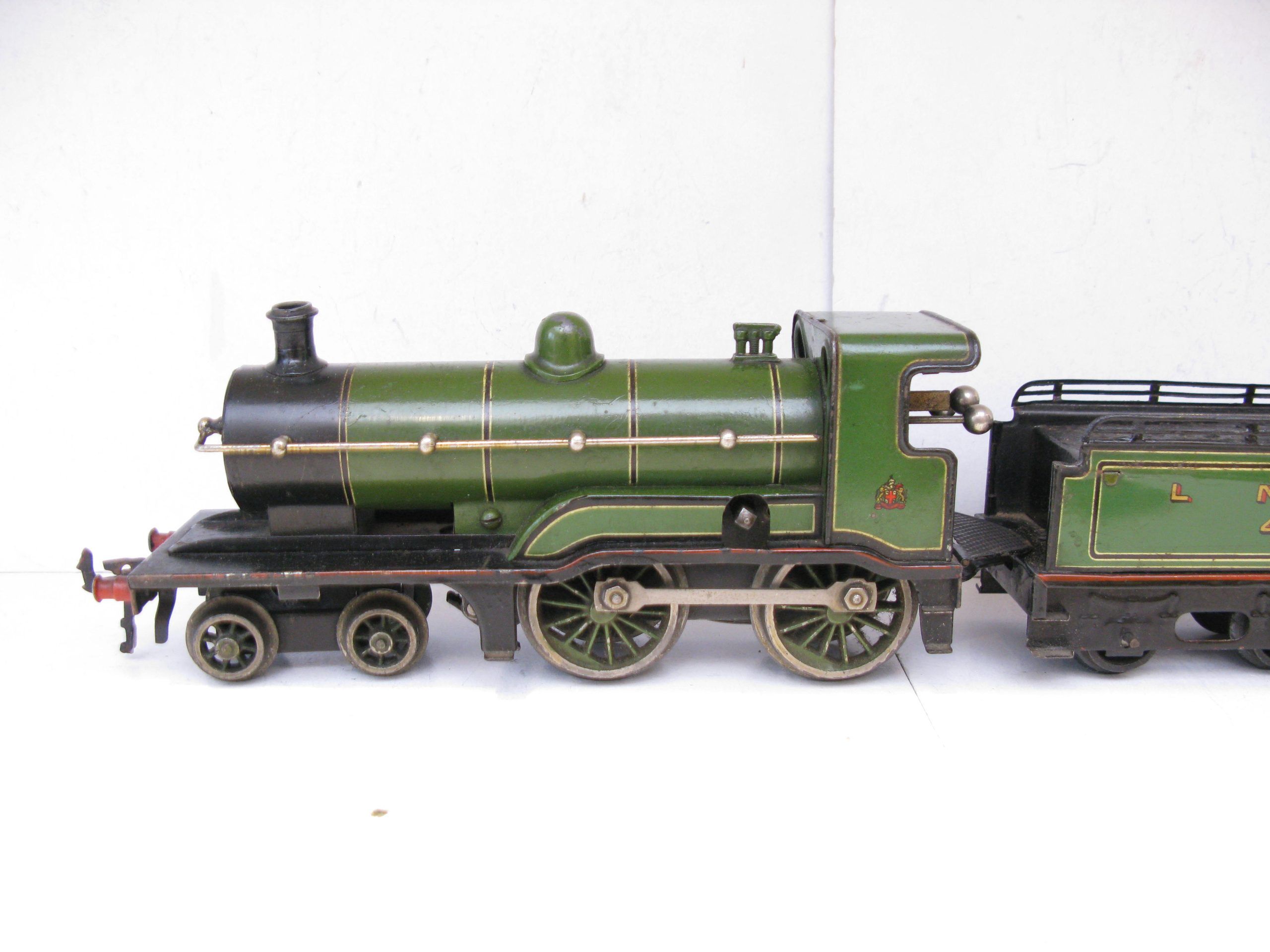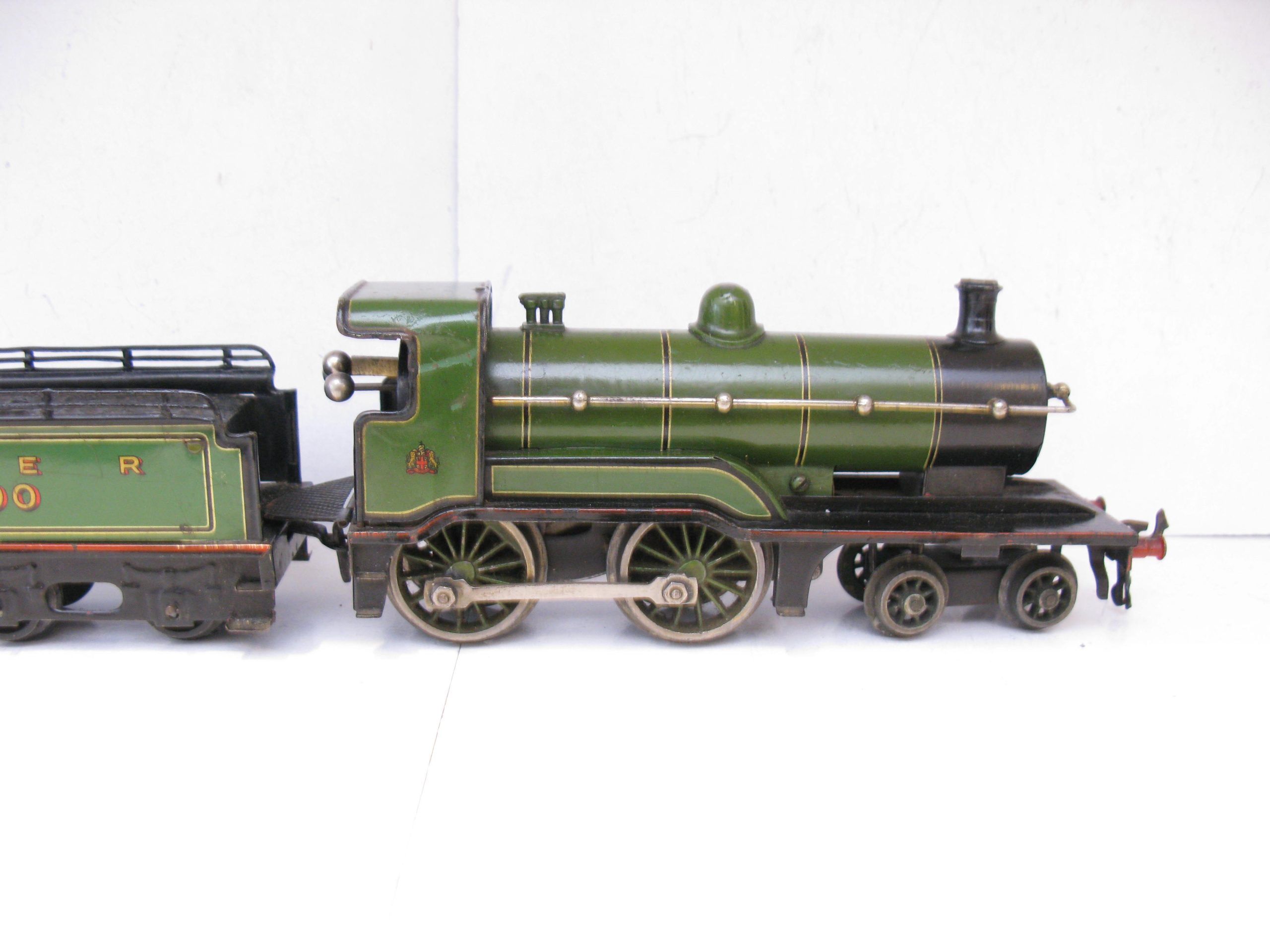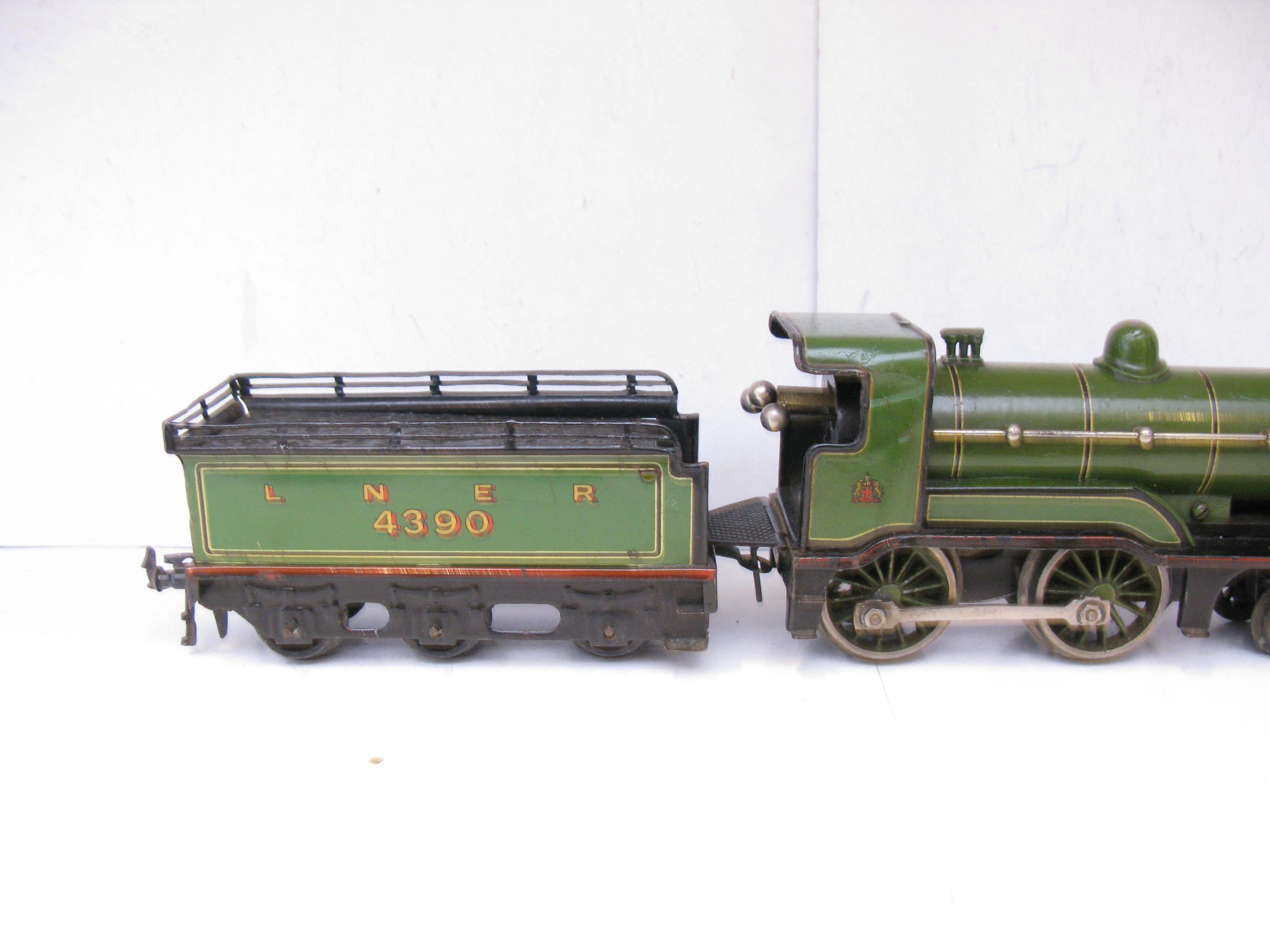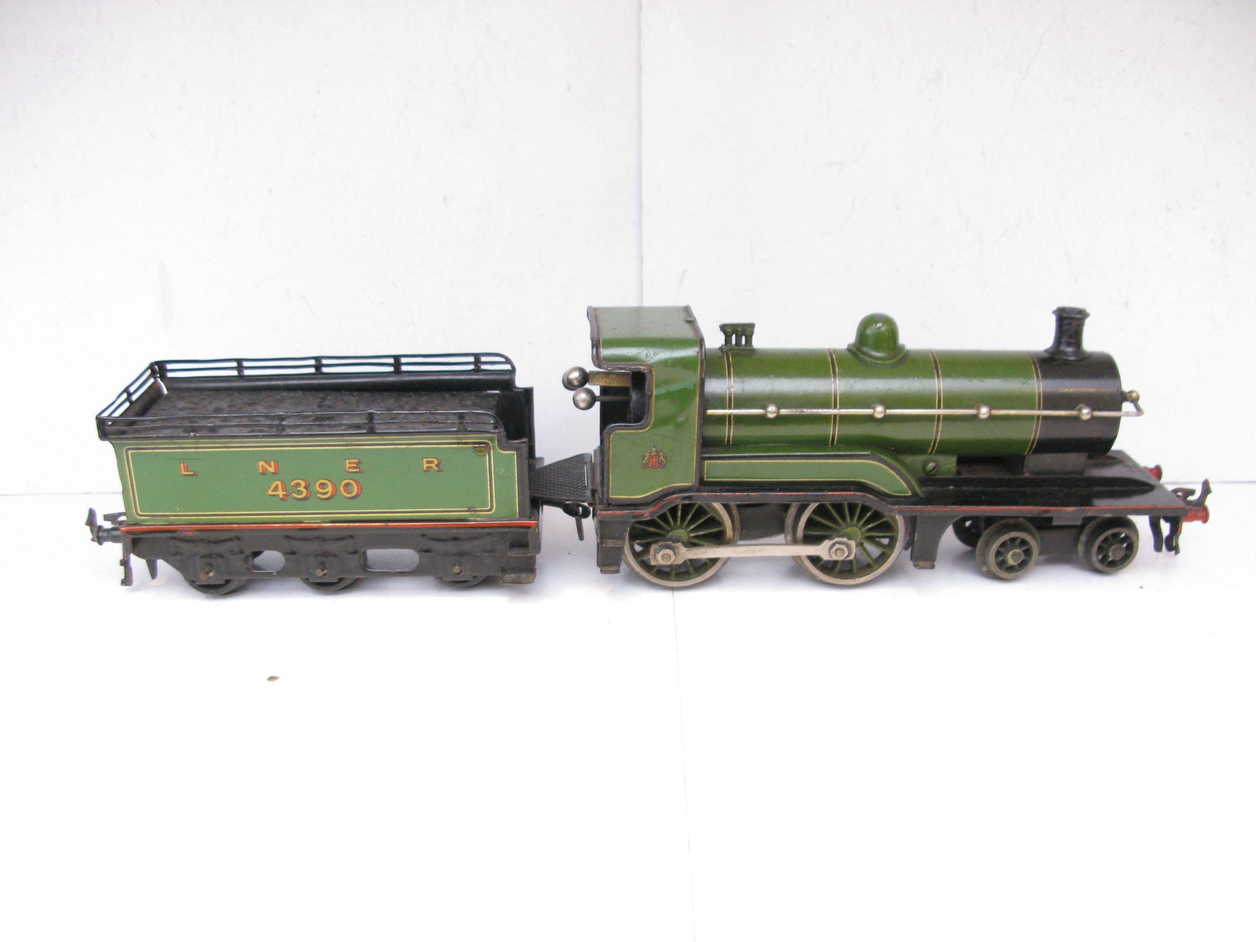 Bing 0 Gauge 4-4-0 Loco & Tender LNER grenn No.4390, Clockwork – unboxed – Good/plus to Excellent – Bing produced a number of Locomotives for the english market and with this 4-4-0 Loco & Tender in lined green from the mid 1920’s. This example is Clockwork, with the LNER lettering and the Running number 4390 to the Tender sides. Overall Good/plus to Excellent unboxed. A great addition to any Vintage toy train collection –