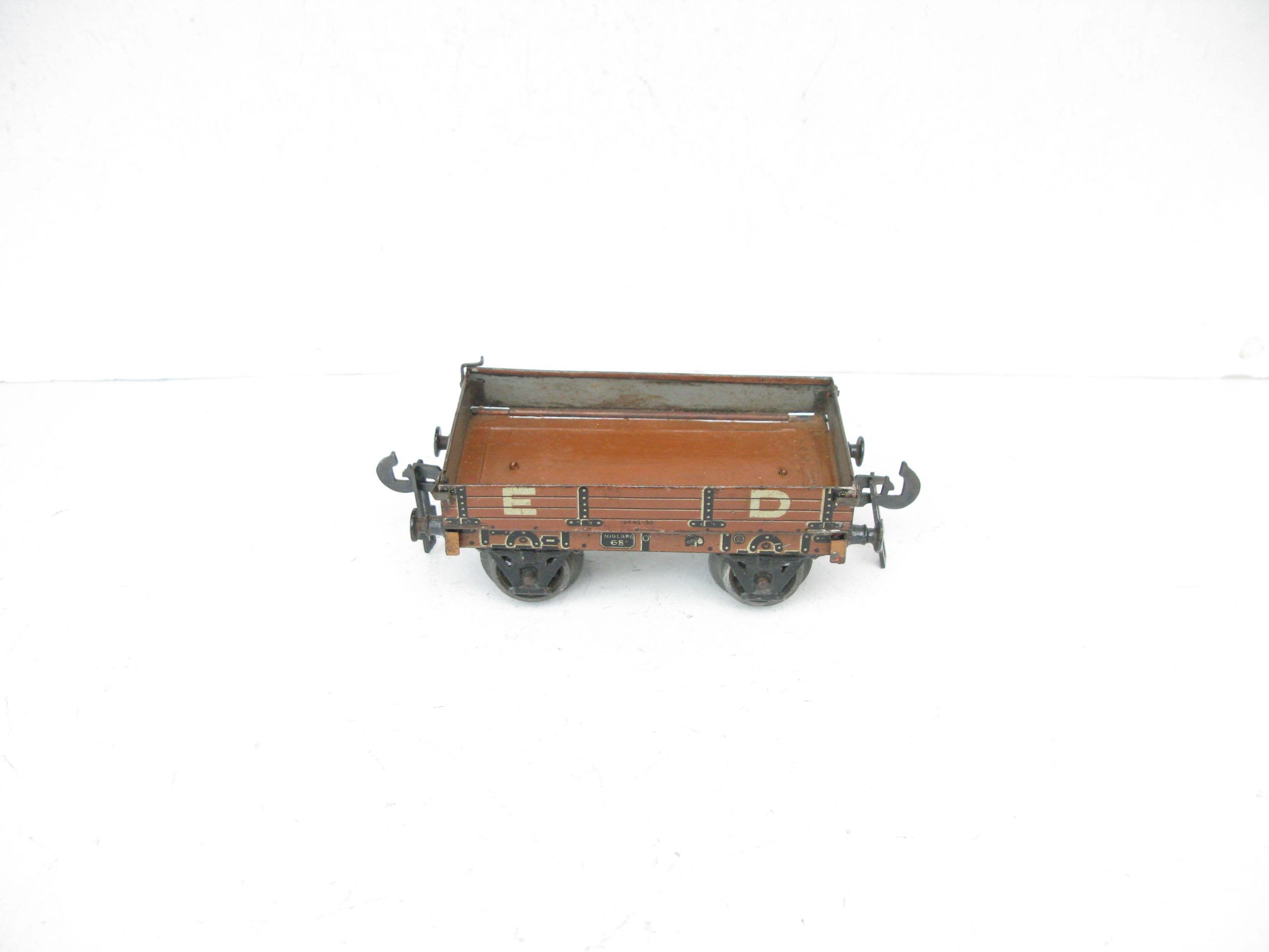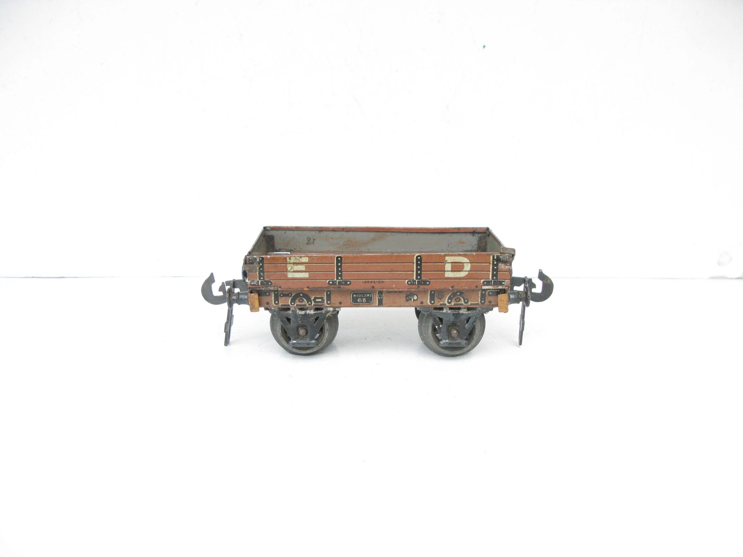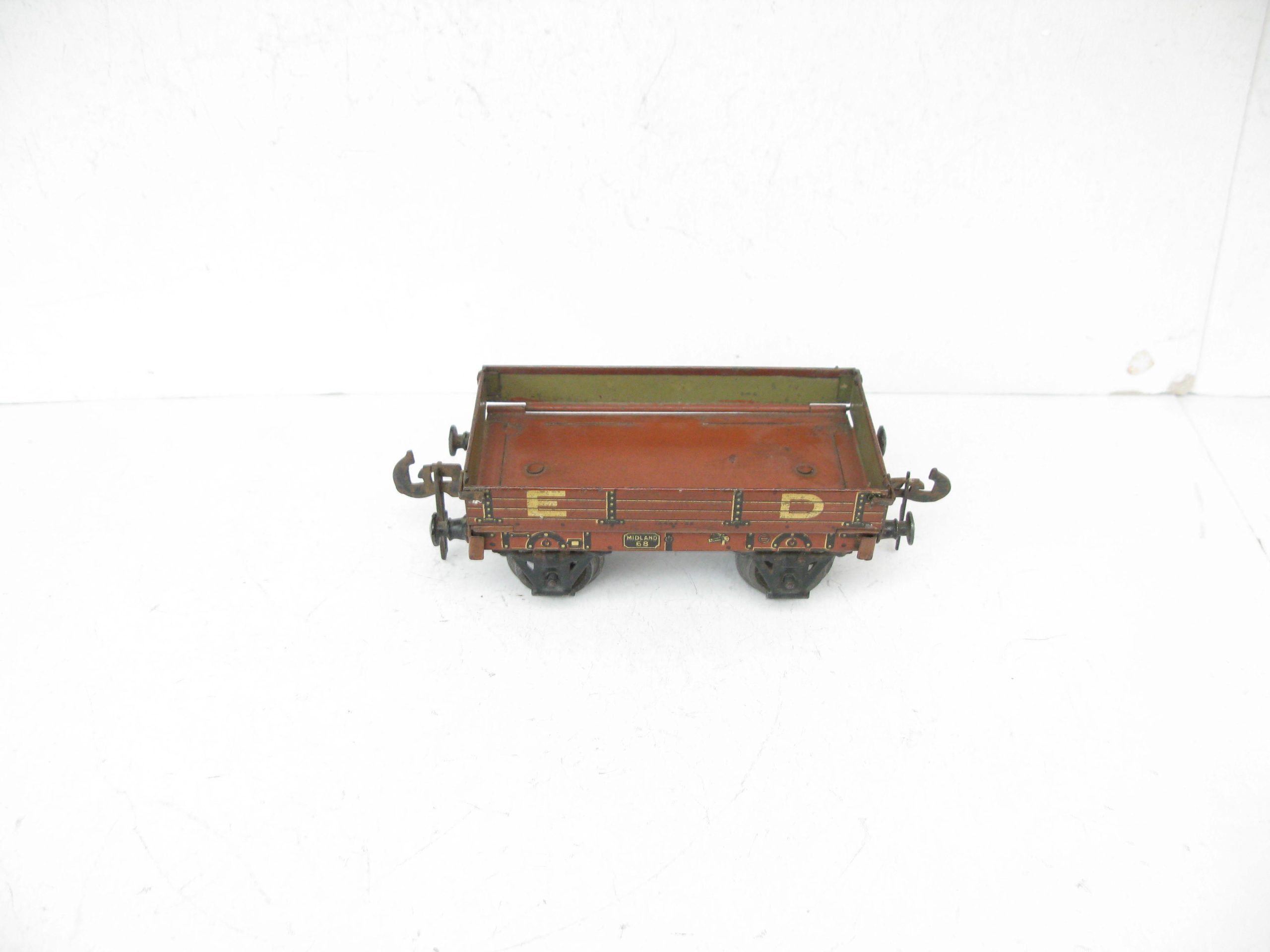 Carette 0 Gauge Midland ED (Engineering Department) Low sided wagon- unboxed – Good/plus – Here is a Carette Engineering Departement open Low sided wagon with drop sides, fitted with cast wheel sets, overall Good to Good/plus unboxed. A great addition to any Vintage toy train collection. Priced each at £35 each