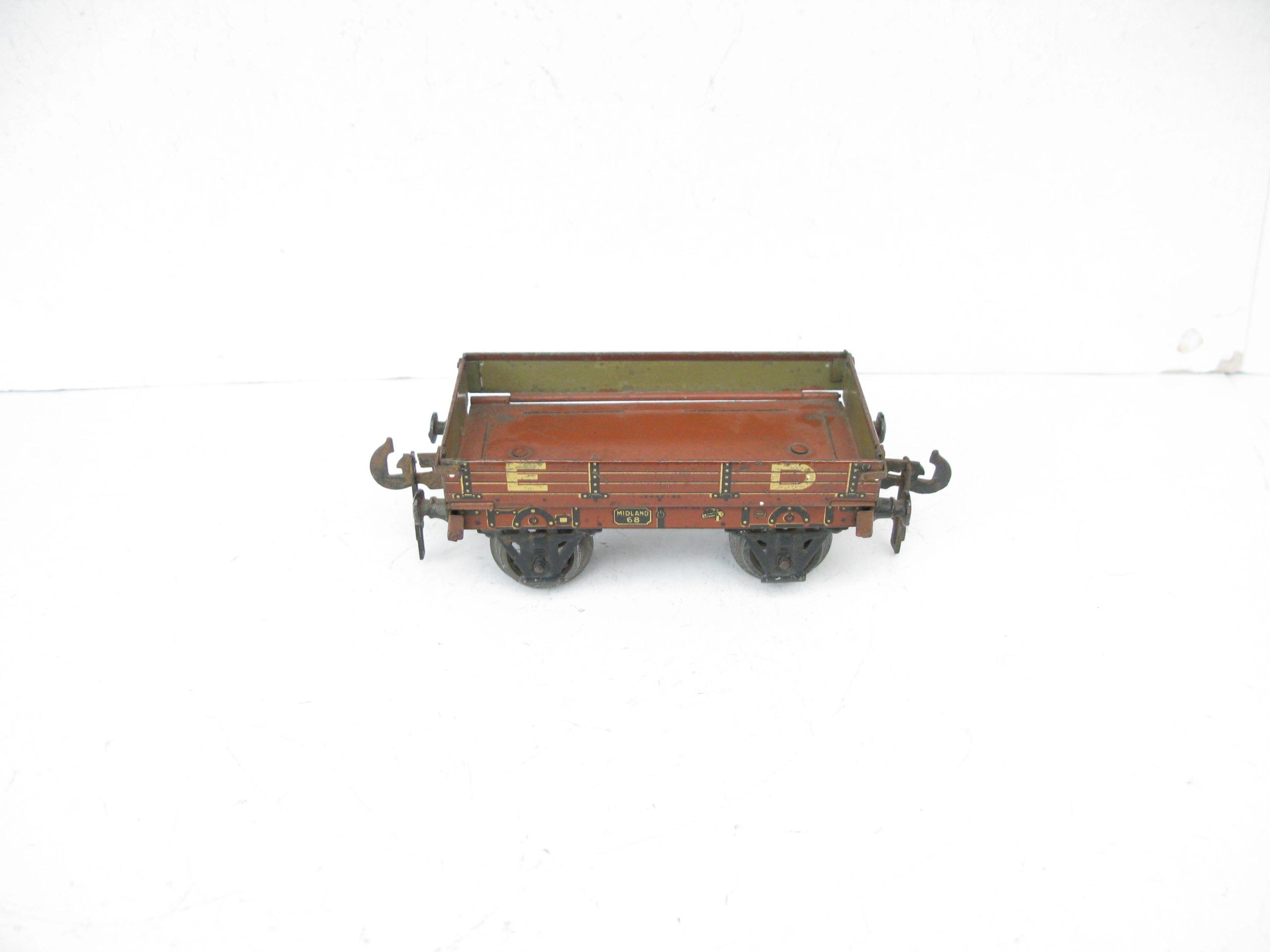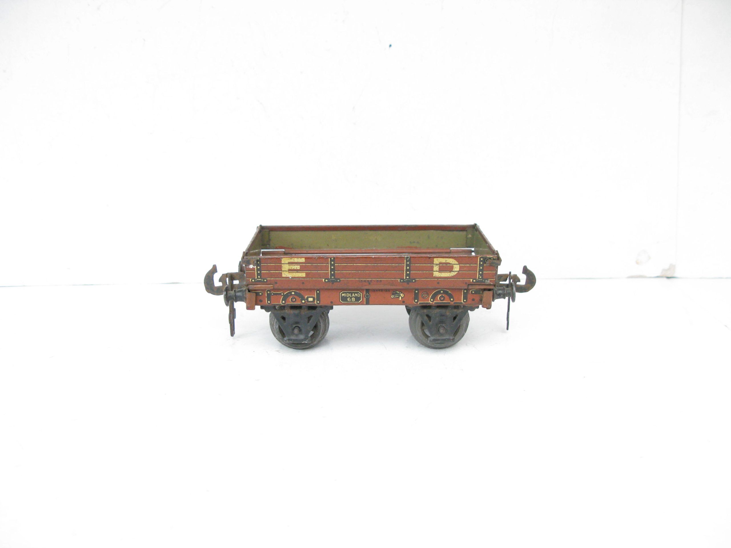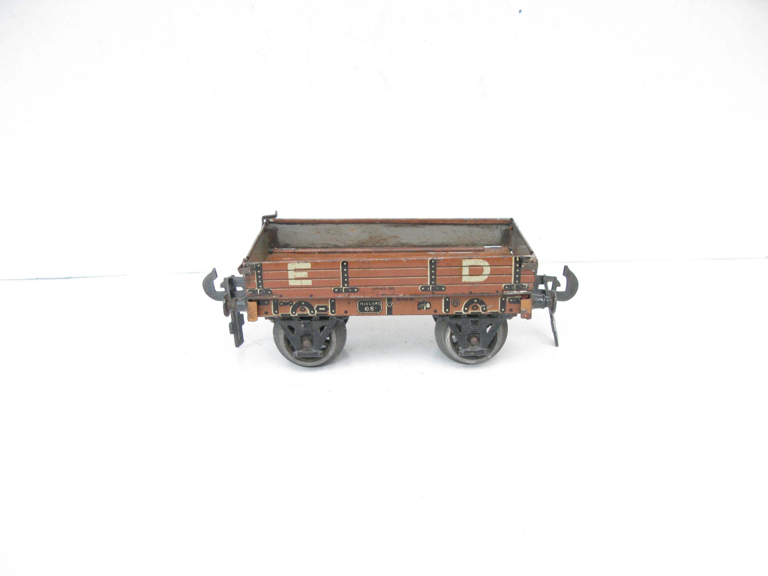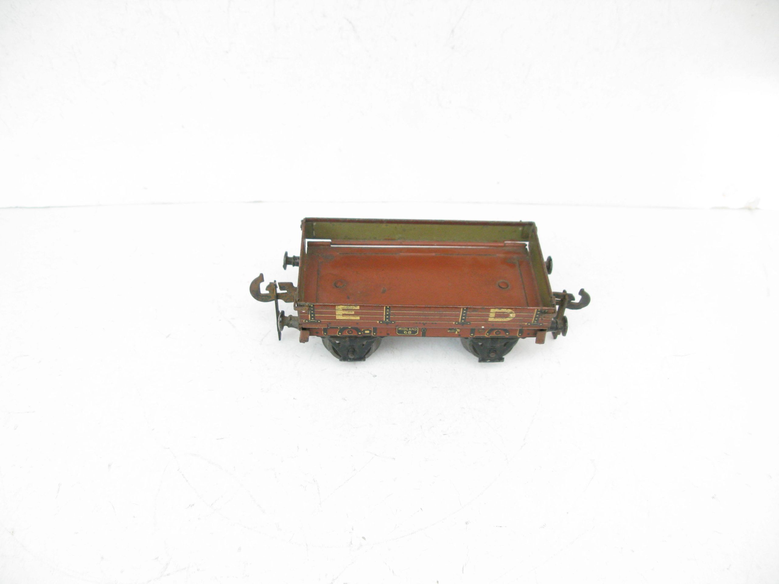 Carette 0 Gauge Midland ED (Engineering Department) Low sided wagon- unboxed – Good/plus – Here is a Carette Engineering Departement open Low sided wagon with drop sides, fitted with cast wheel sets, overall Good to Good/plus unboxed. A great addition to any Vintage toy train collection. Priced each at £35 each