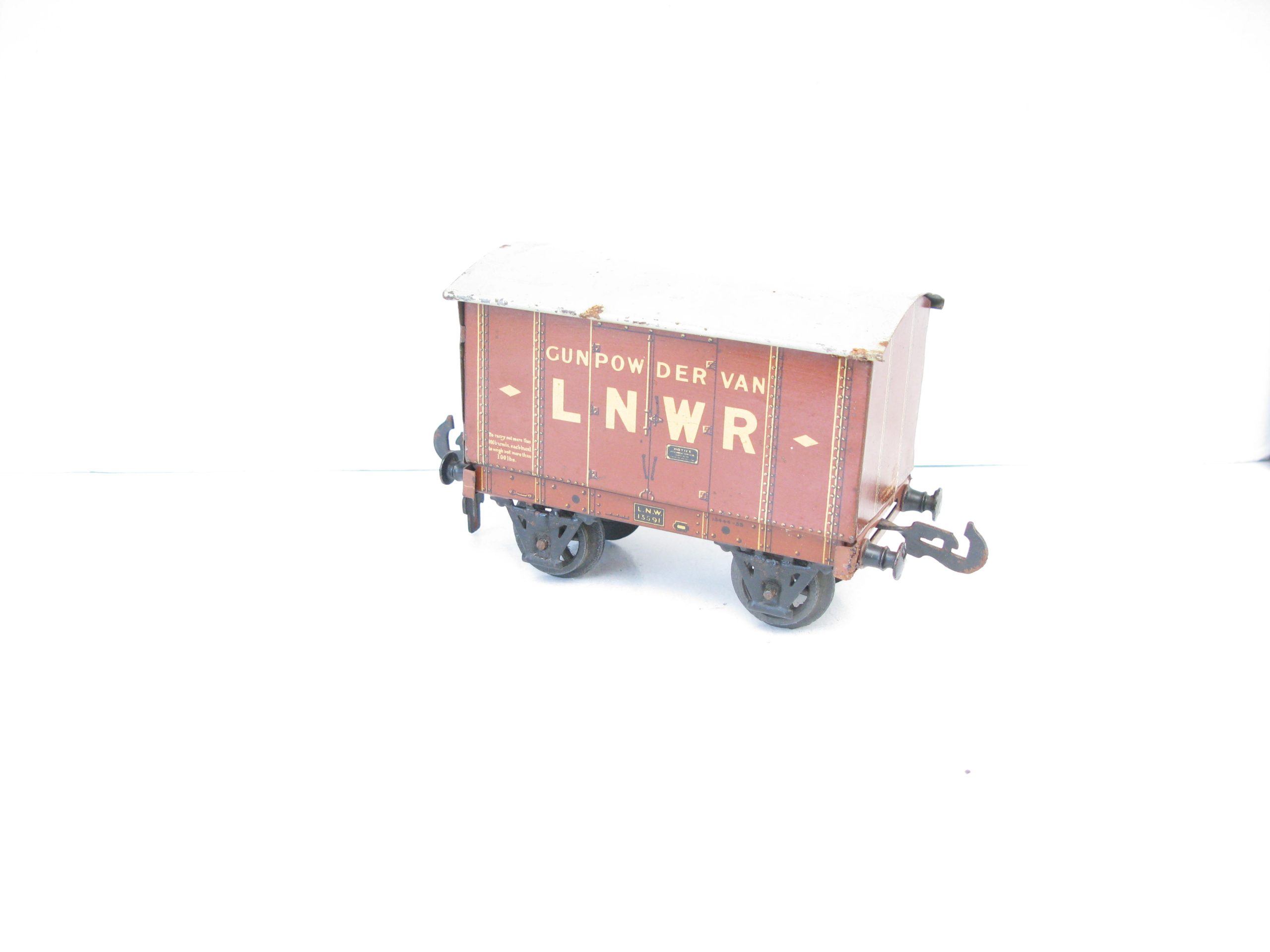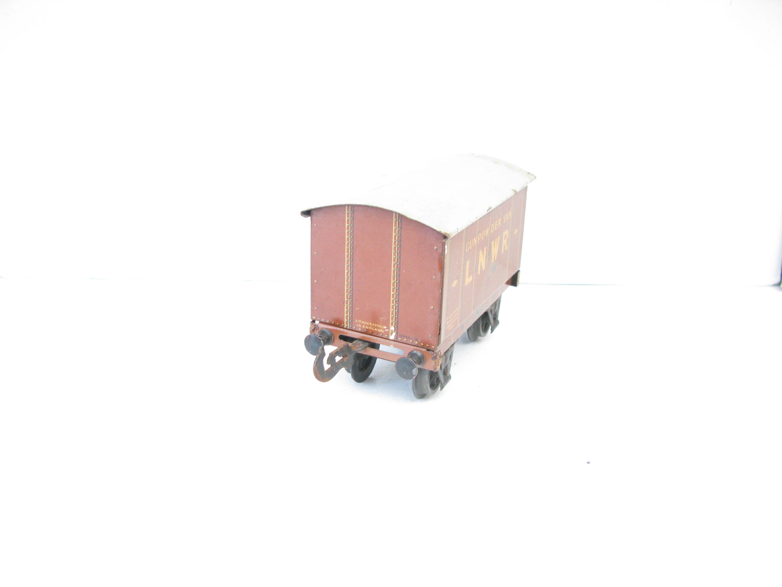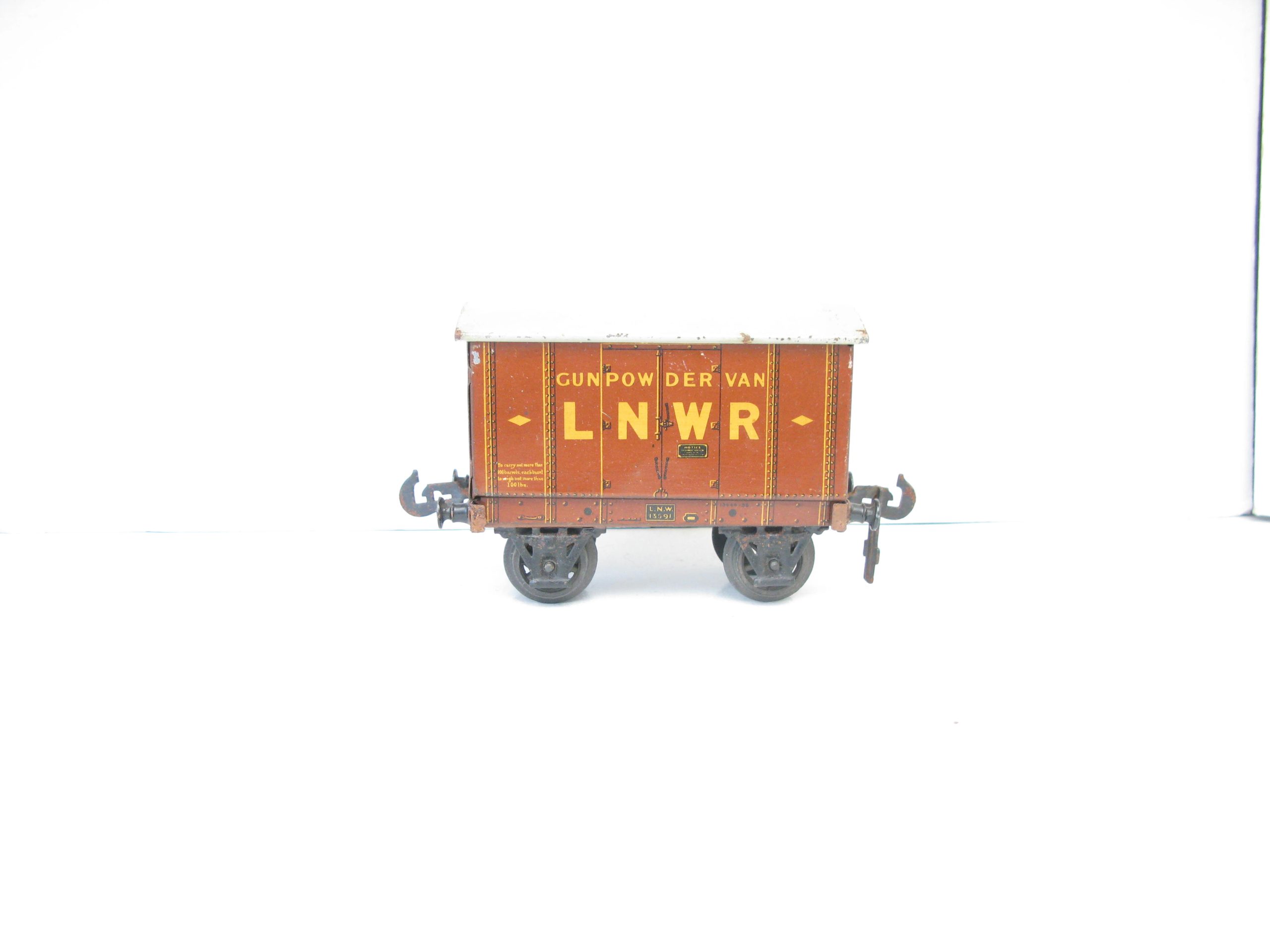 Carette 0 Gauge LNWR ‘GUNPOWDER’ Van – unboxed – Here we have from the range of Carette wagon for the British market the pre 1st world war LNWR Tin Printed ‘GUNPOWDER’ van. Brown body with off white lettering to the sides, A hard to find wagon in this condition, overall Excellent, unboxed, a great addition to any Vintage toy train collection