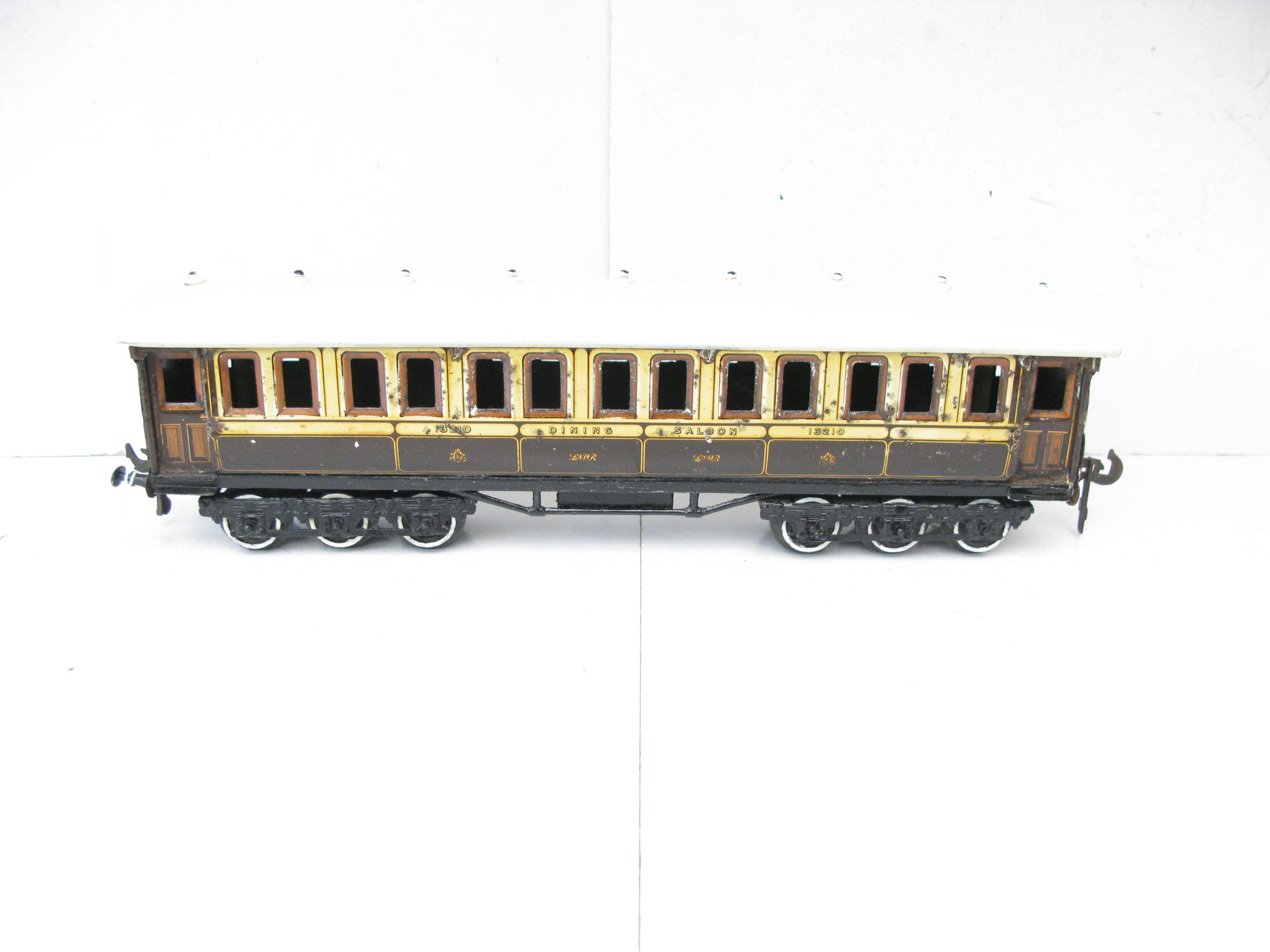 Carette – Bassett Lowke 0 Gauge 12 wheel LNWR Dining car – unboxed – Good to Good/plus priced ast £60 each – Bassett Lowke produced 2 versions of this coach this is the LNWR version. Tinprinted in the LNWR lined livery these longer coaches and fitted with 6 wheel bogies, some general wear marks overall. Good to Good/plus. A great addition to any Vintage toy train collection.