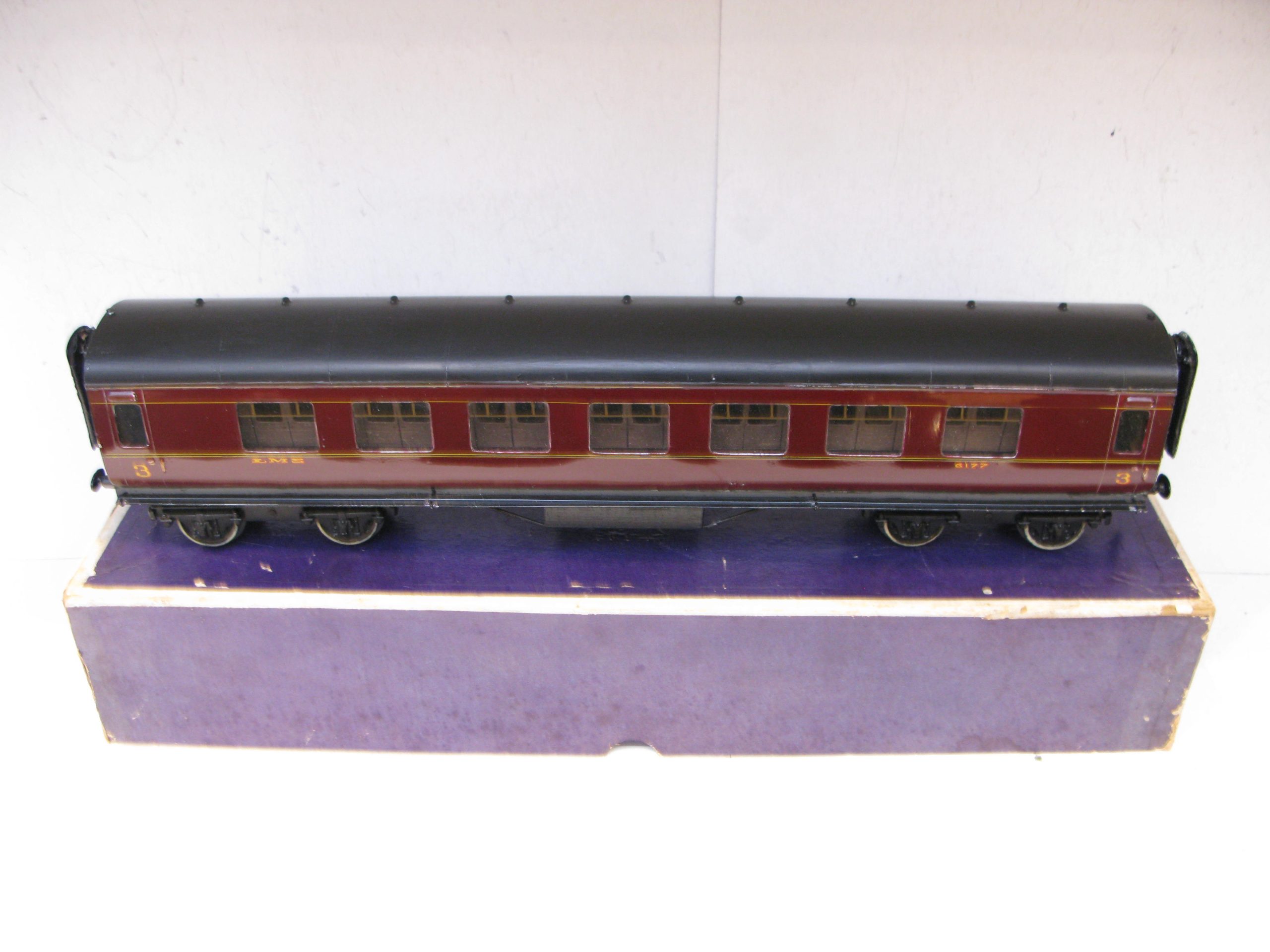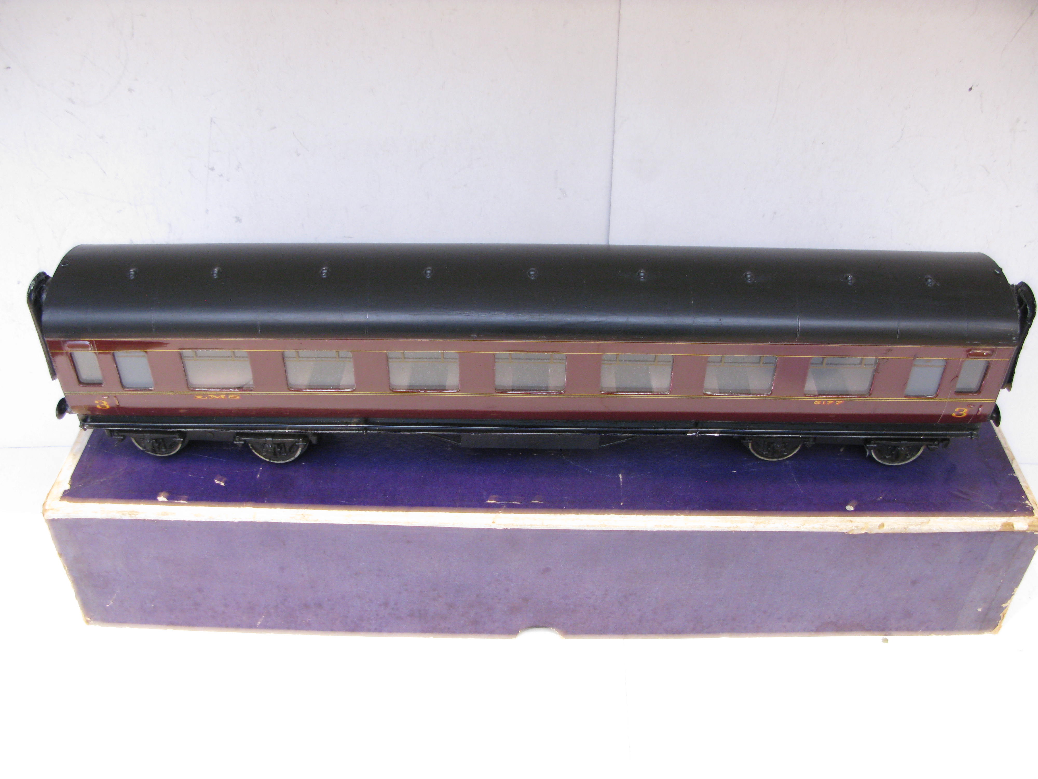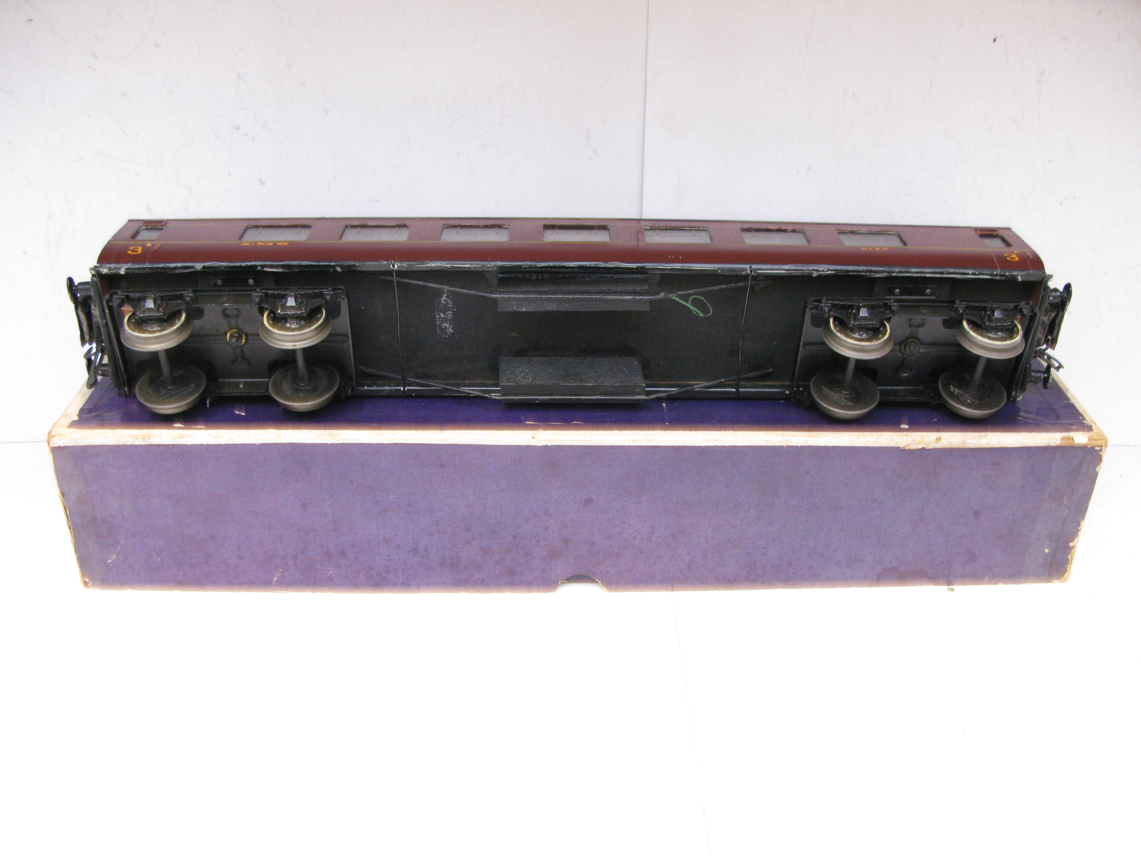 Exley / Bassett lowke 0 Gauge K5 LMS All 3rd Side Corridor Coach No.6177 – in a Bassett Lowke box – Good – Here is a K5 Exley LMS All 3rd Side Corridor Coach, some retouching to sides, roof repainted, fitted with Bassett Lowke Bogies all contained in a Bassett Lowke Box. A great addition to any Bassett Lowke or Vintage 0 Gauge collection – Watch out for more Exley coach I will be listing