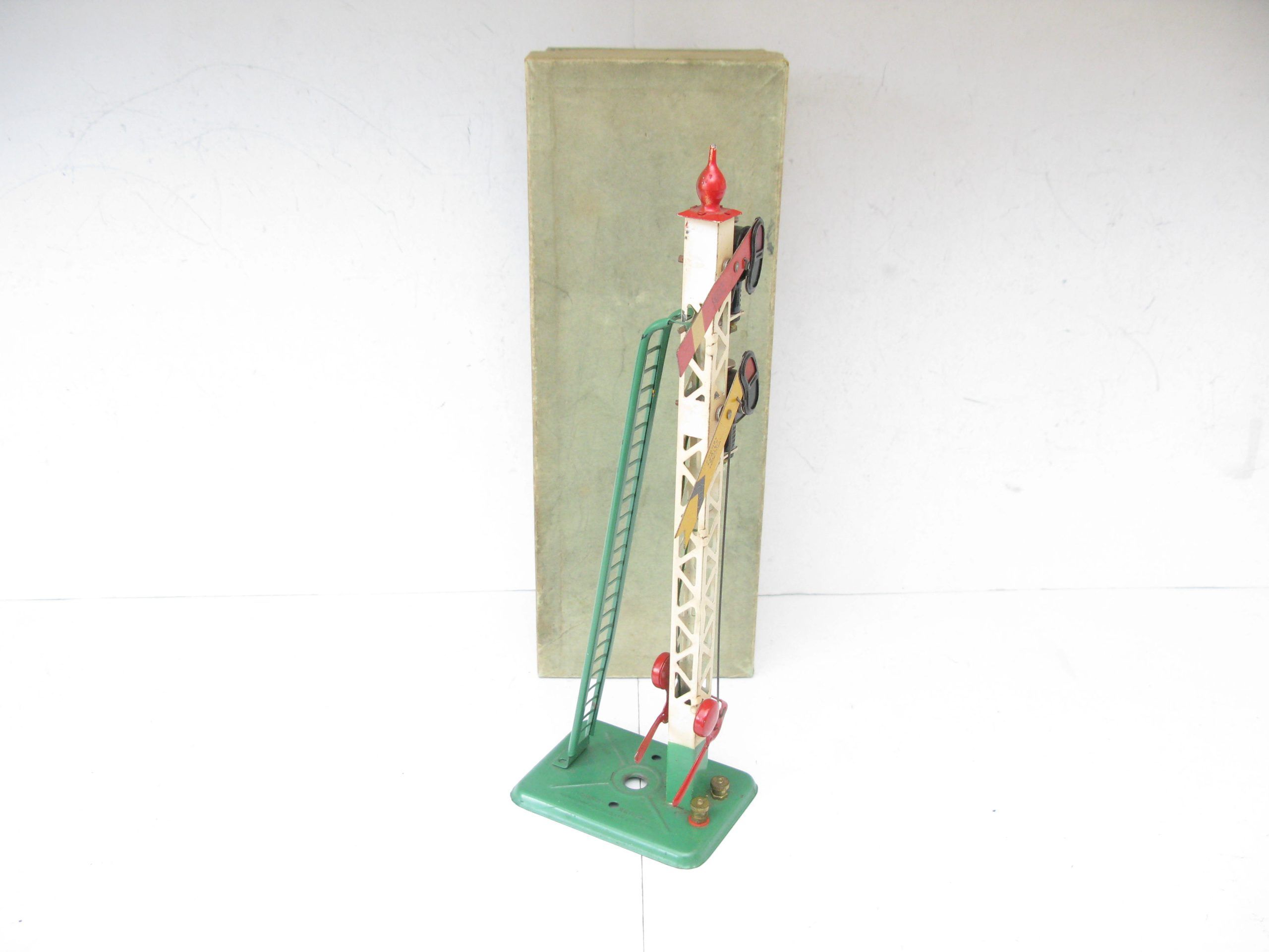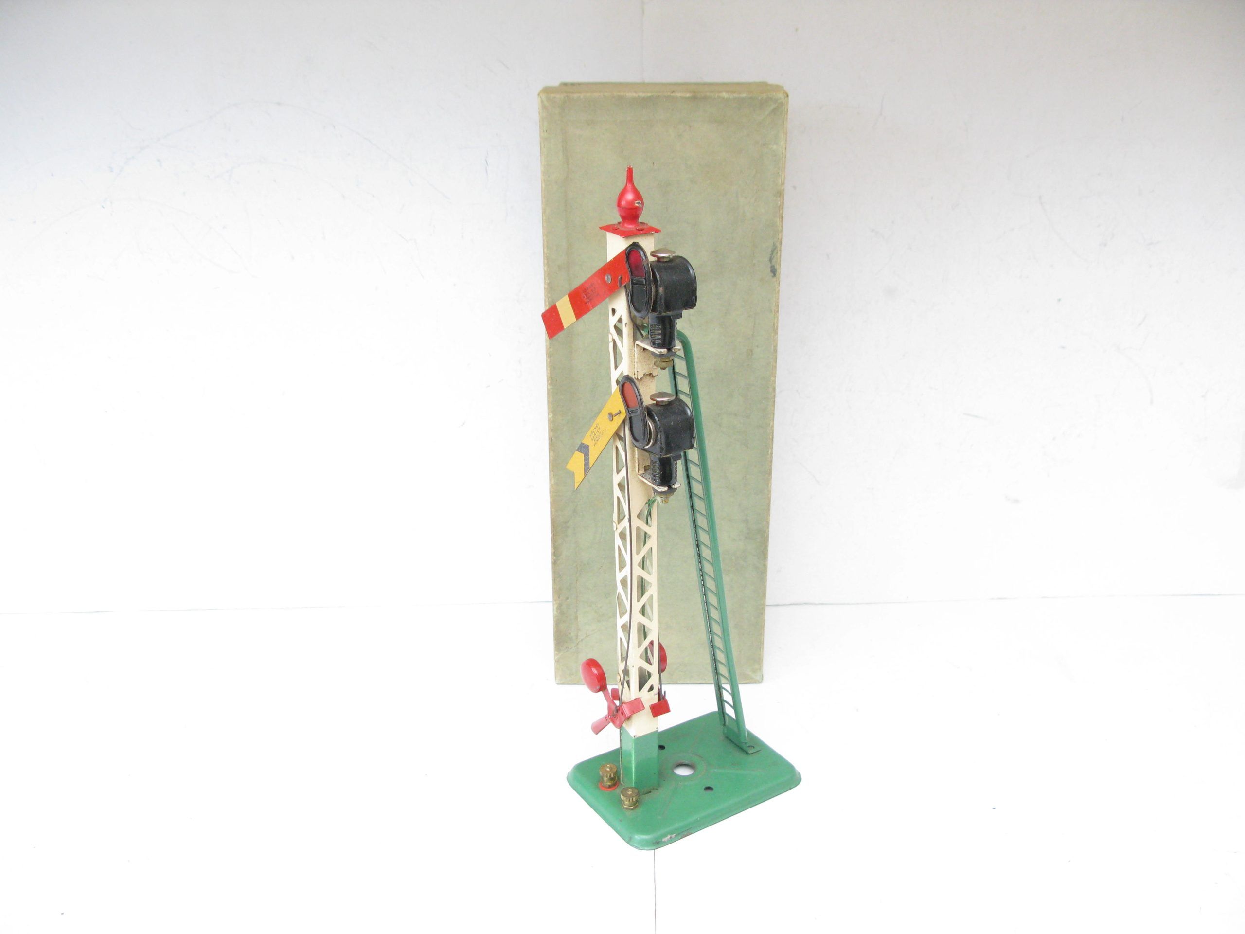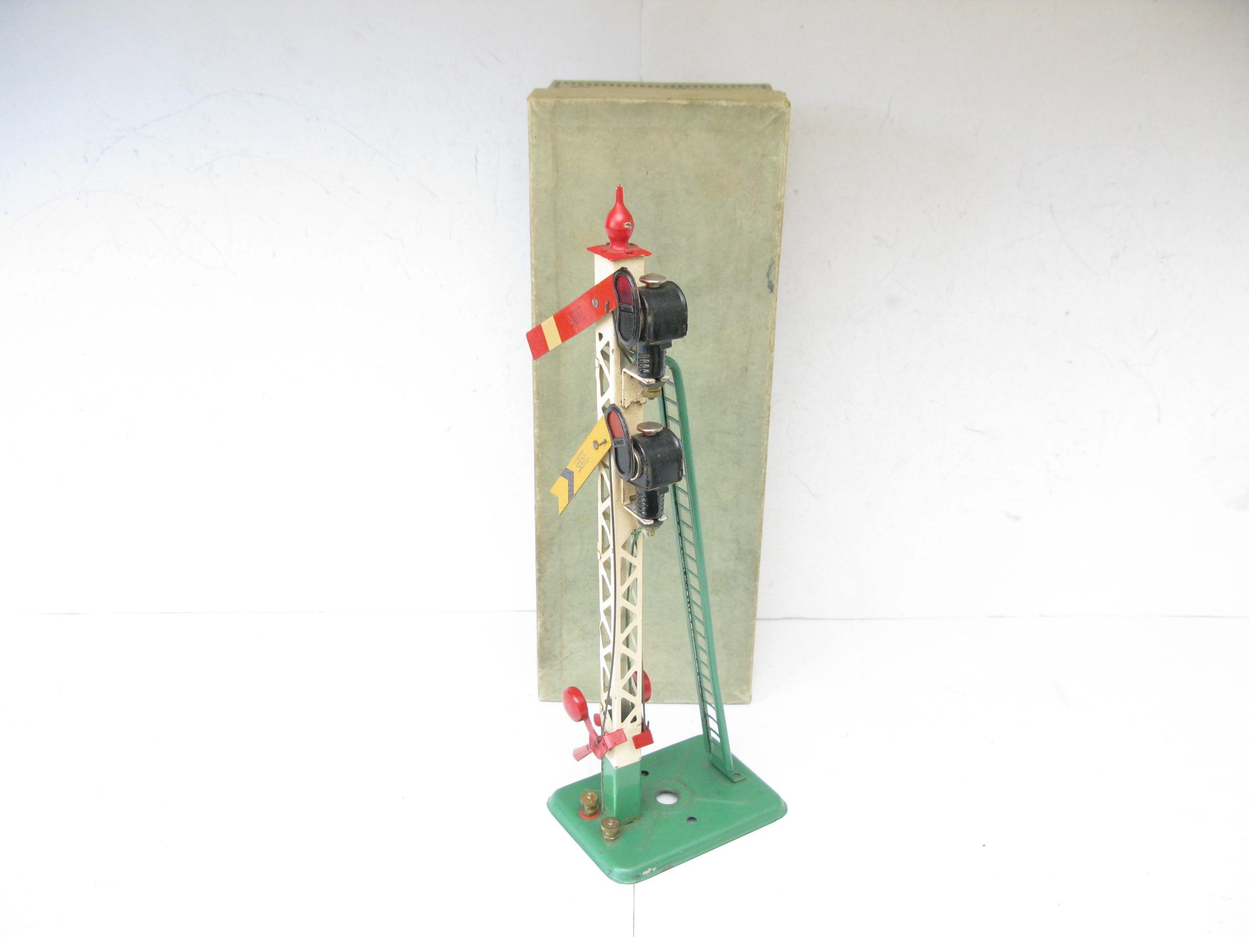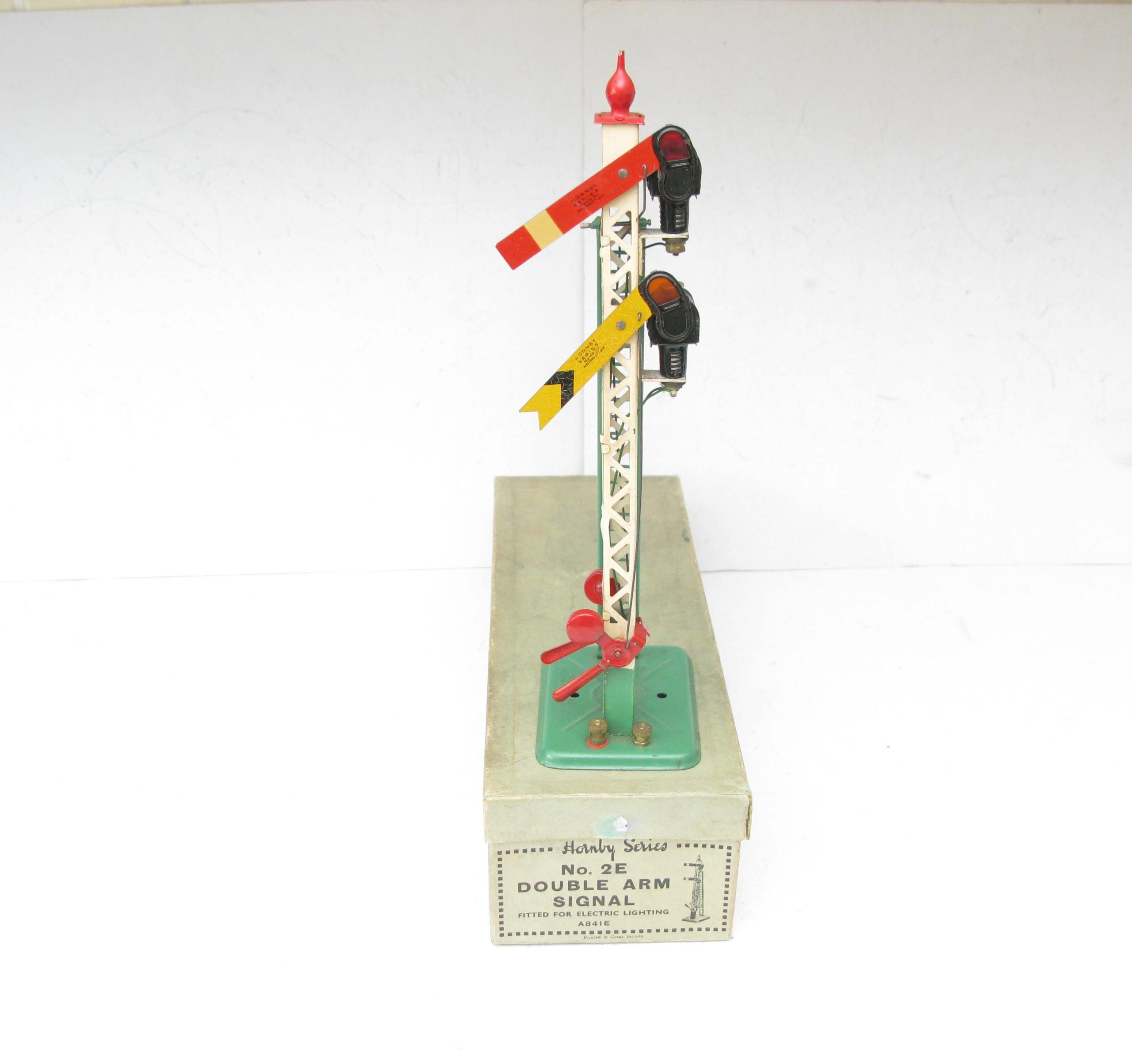 Hornby 0 Gauge 2E Double Arm Signal with screw fittings Circa 1938 – Boxed – From the pre-war range of electric accessories is this No.2E Double arm Signal with Green base and ladder with a Red finial, overall Excellent in an Excellent box, a great addition to any Hornby 0 Gauge collection.