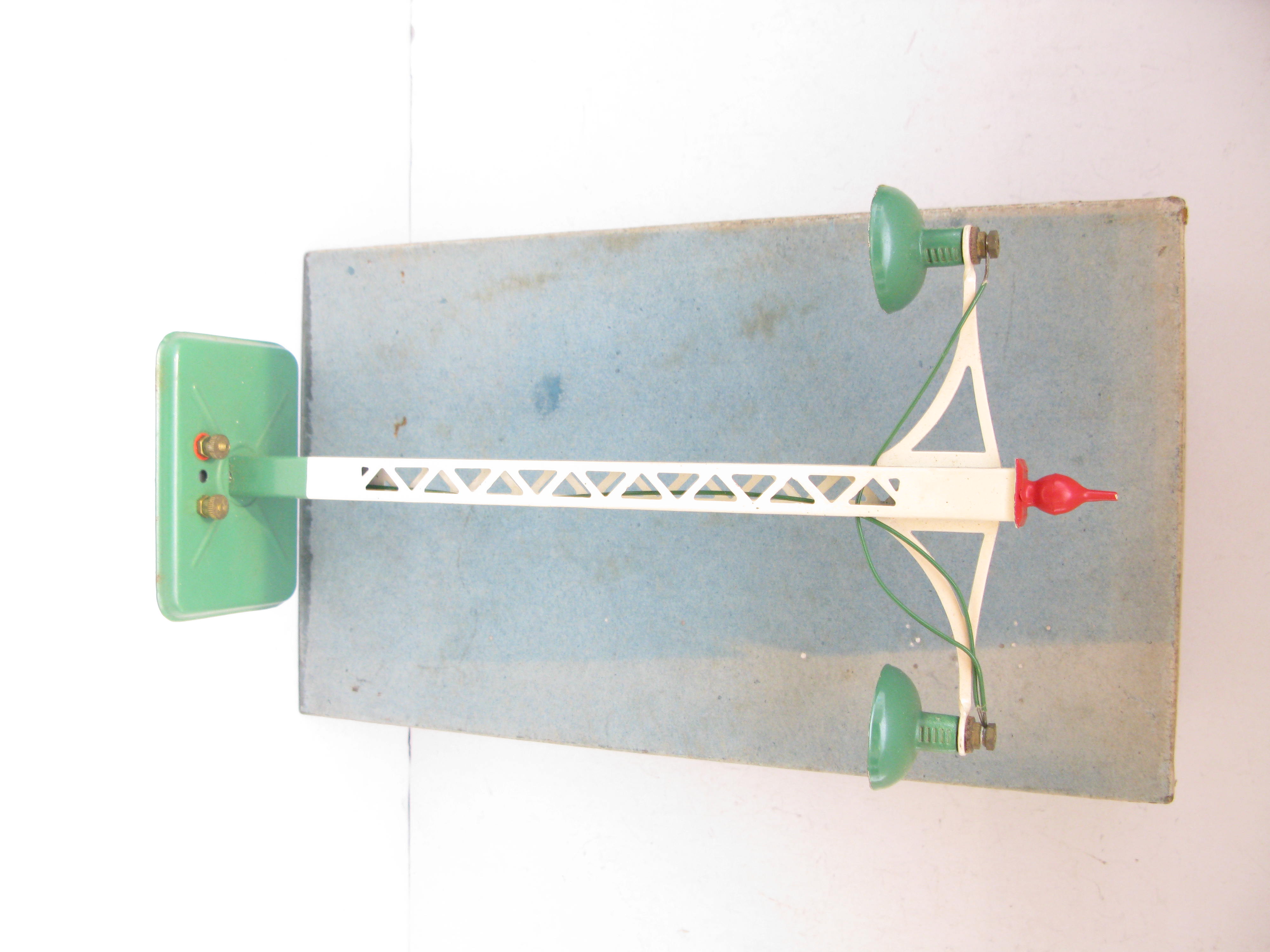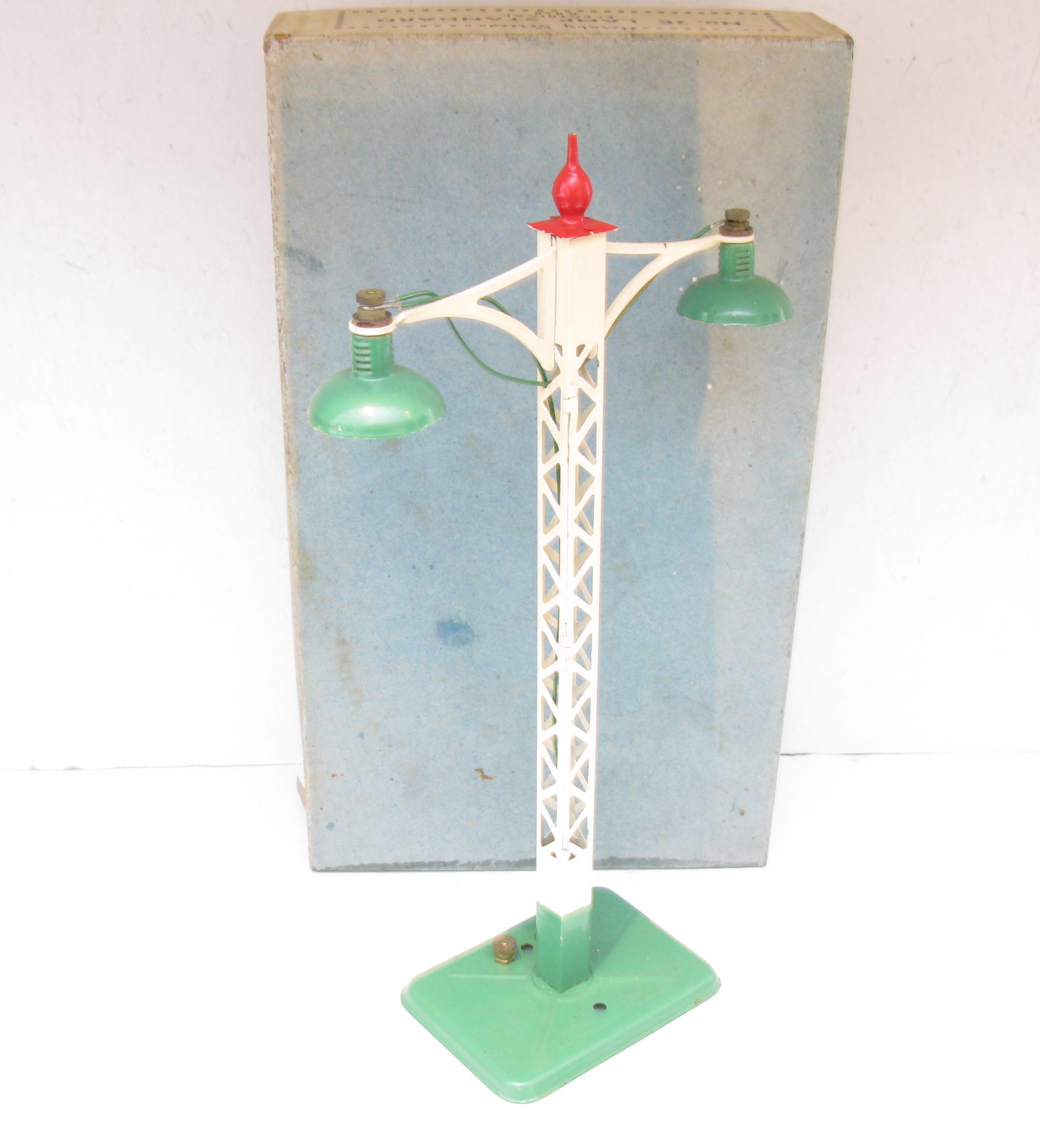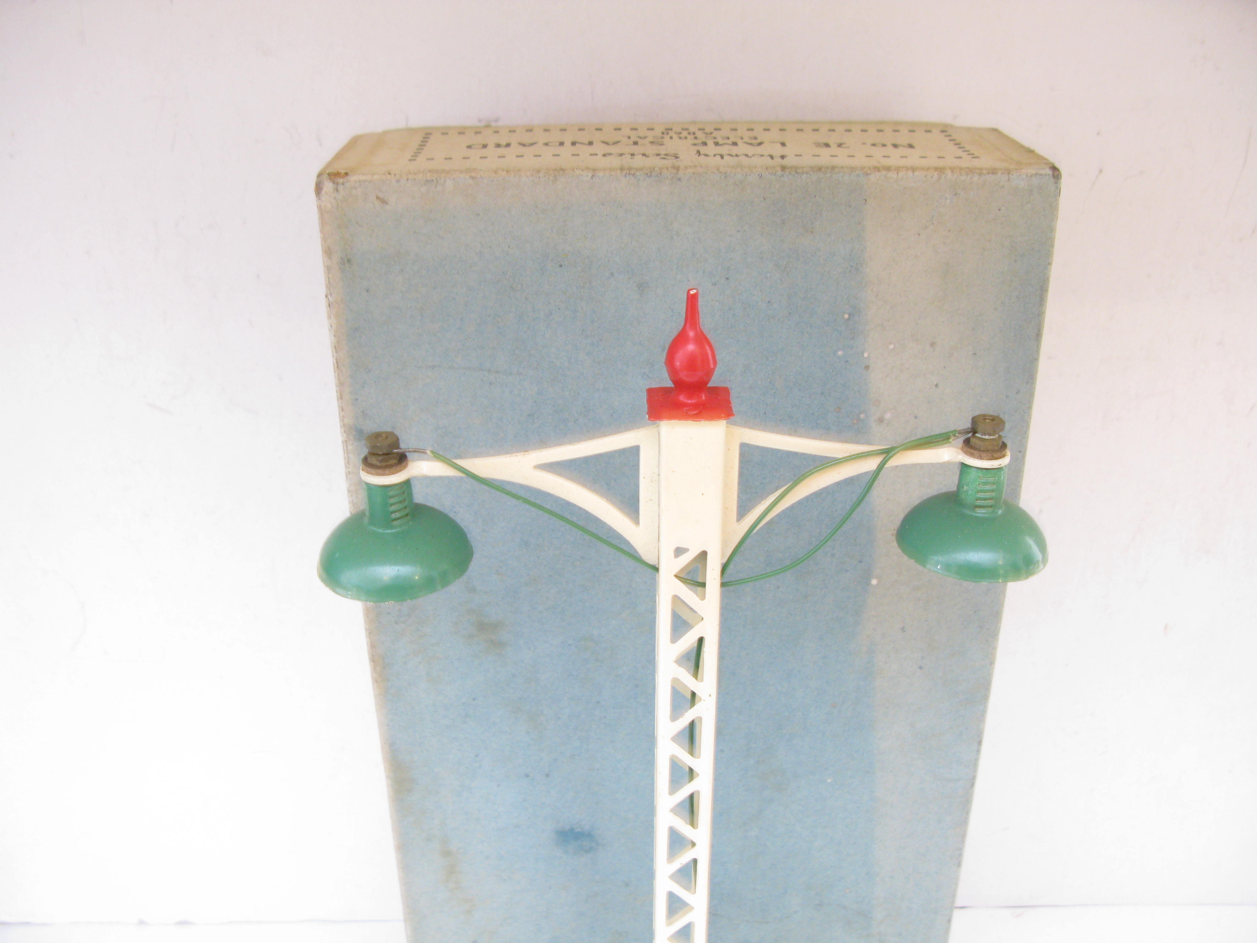 Hornby 0 Gauge 2E Lamp Standard version with screw fittings Circa 1938 – Boxed – From the pre-war range of electric accessories  is this No.12E Lamp Standard with green base and shapdes with red Finial, overall Near mint in a Good/plus box dated coded 12/1938, a great addition to any Hornby 0 Gauge collection./