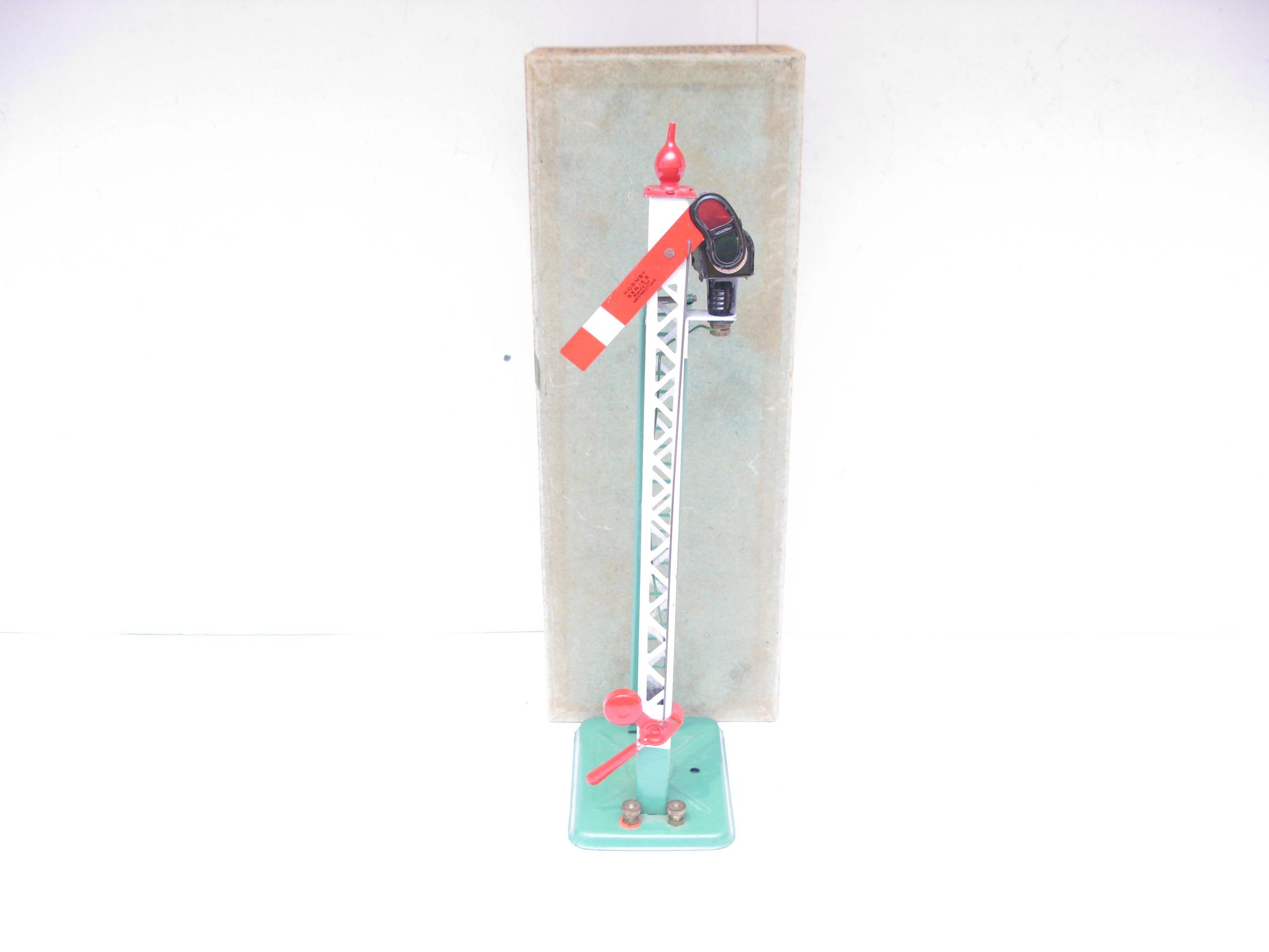 Hornby 0 Gauge 2E Single arm signal Standard Screw fittings circa 1938 – Boxed – From the pre-war range of electric accessories is this No.2E single arm Signal with Green base and ladder with a Red finial, overall Excellent/plus to near Mint in an Excellent box with Home label and old price 2/6 to one end, a great addition to any Hornby 0 Gauge collection.
