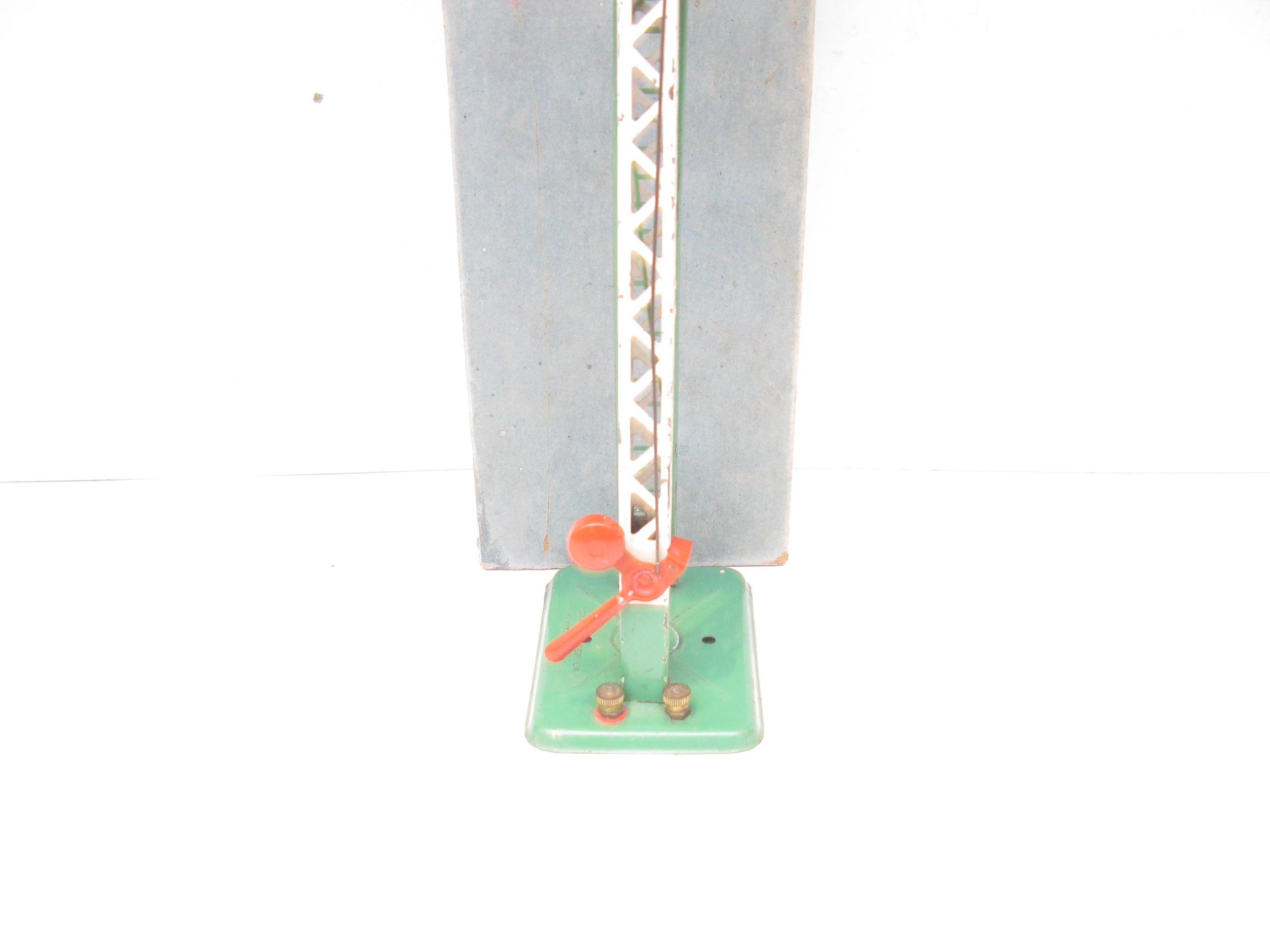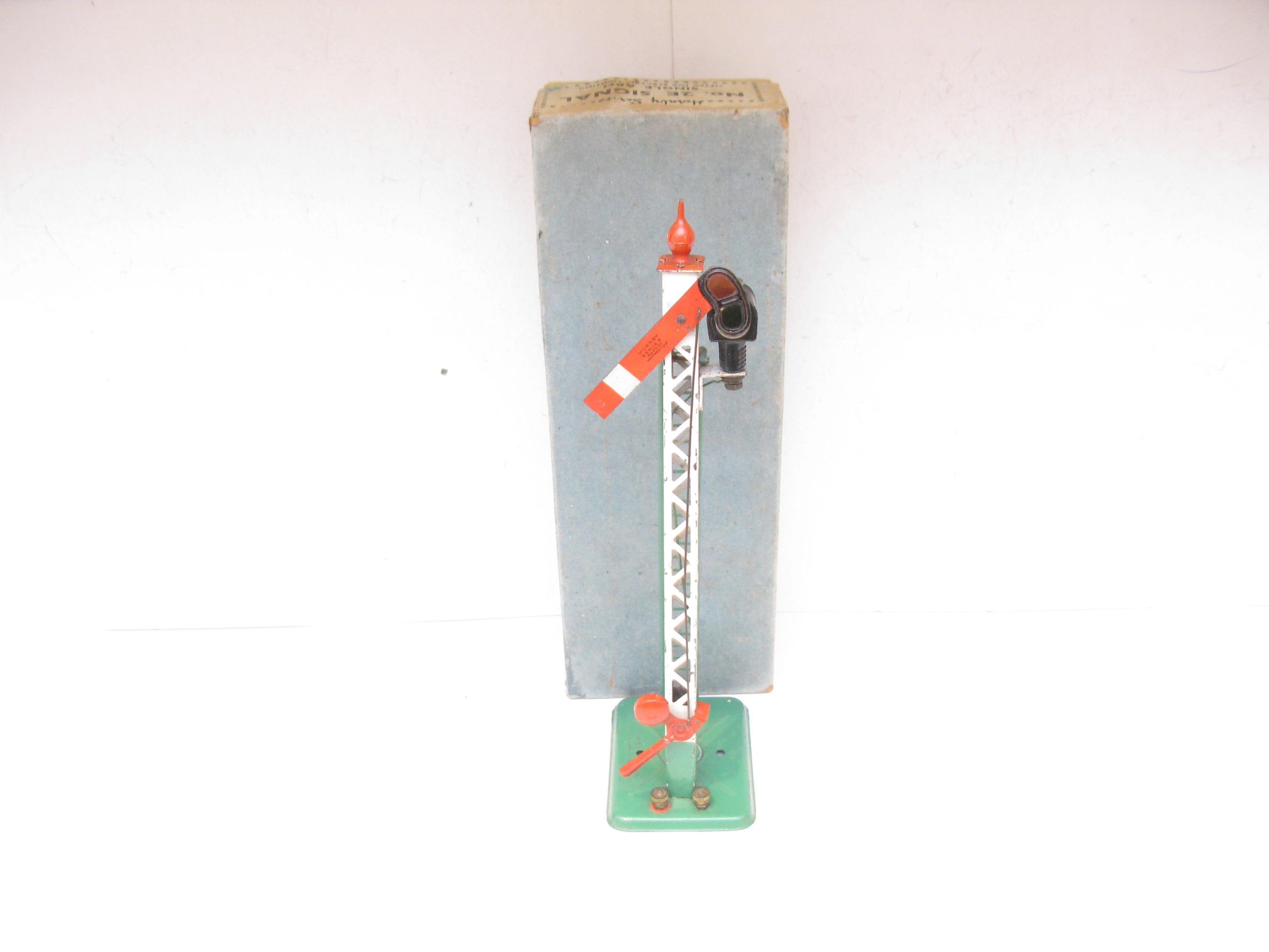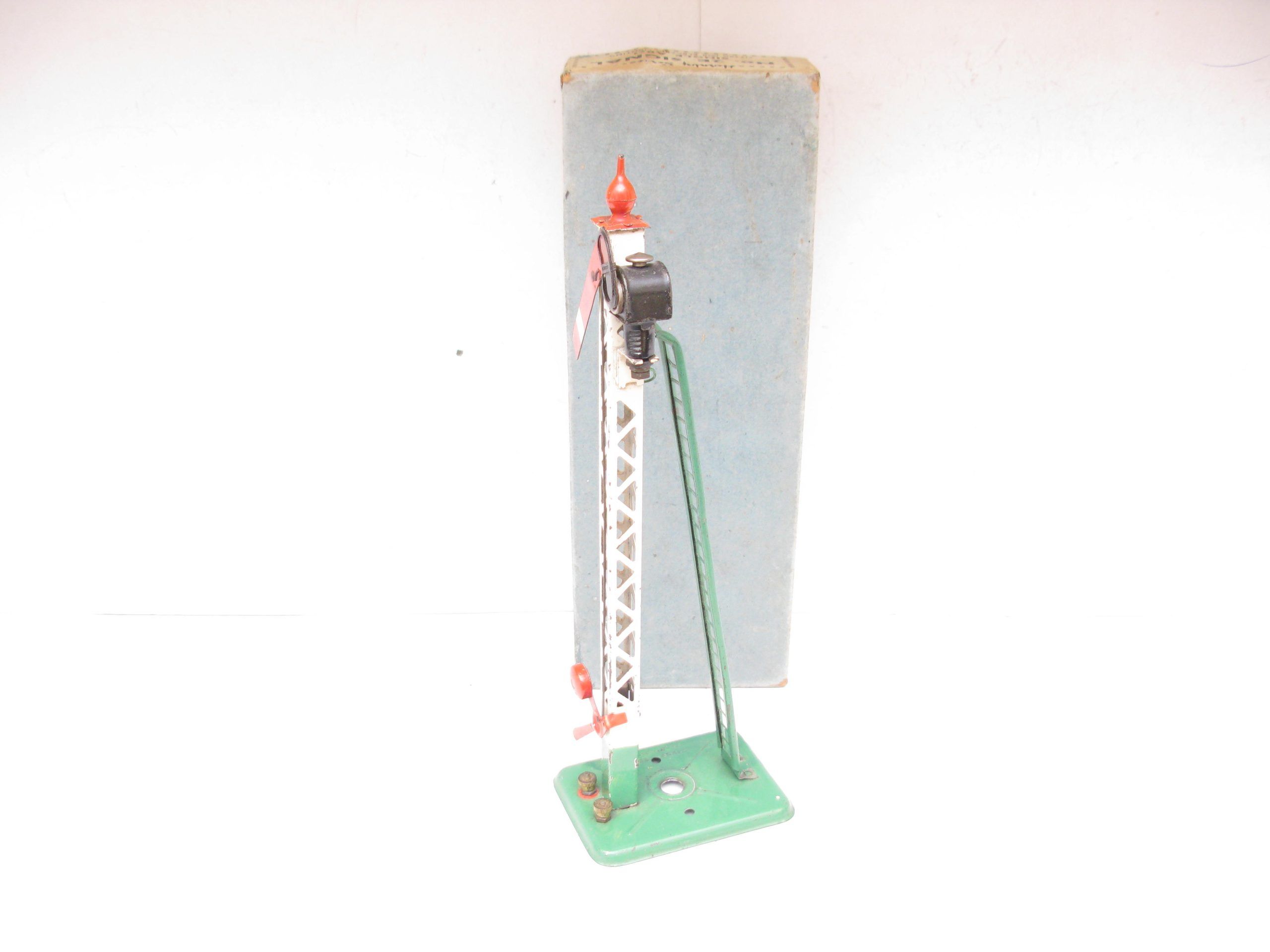 Hornby 0 Gauge 2E Single arm signal Standard Screw fittings circa 1938 – Boxed – From the pre-war range of electric accessories is this No.2E single arm Signal with Green base and ladder with a Red finial. Light marking to the lattice post, overall Excellent in a Good box, a great addition to any Hornby 0 Gauge collection.