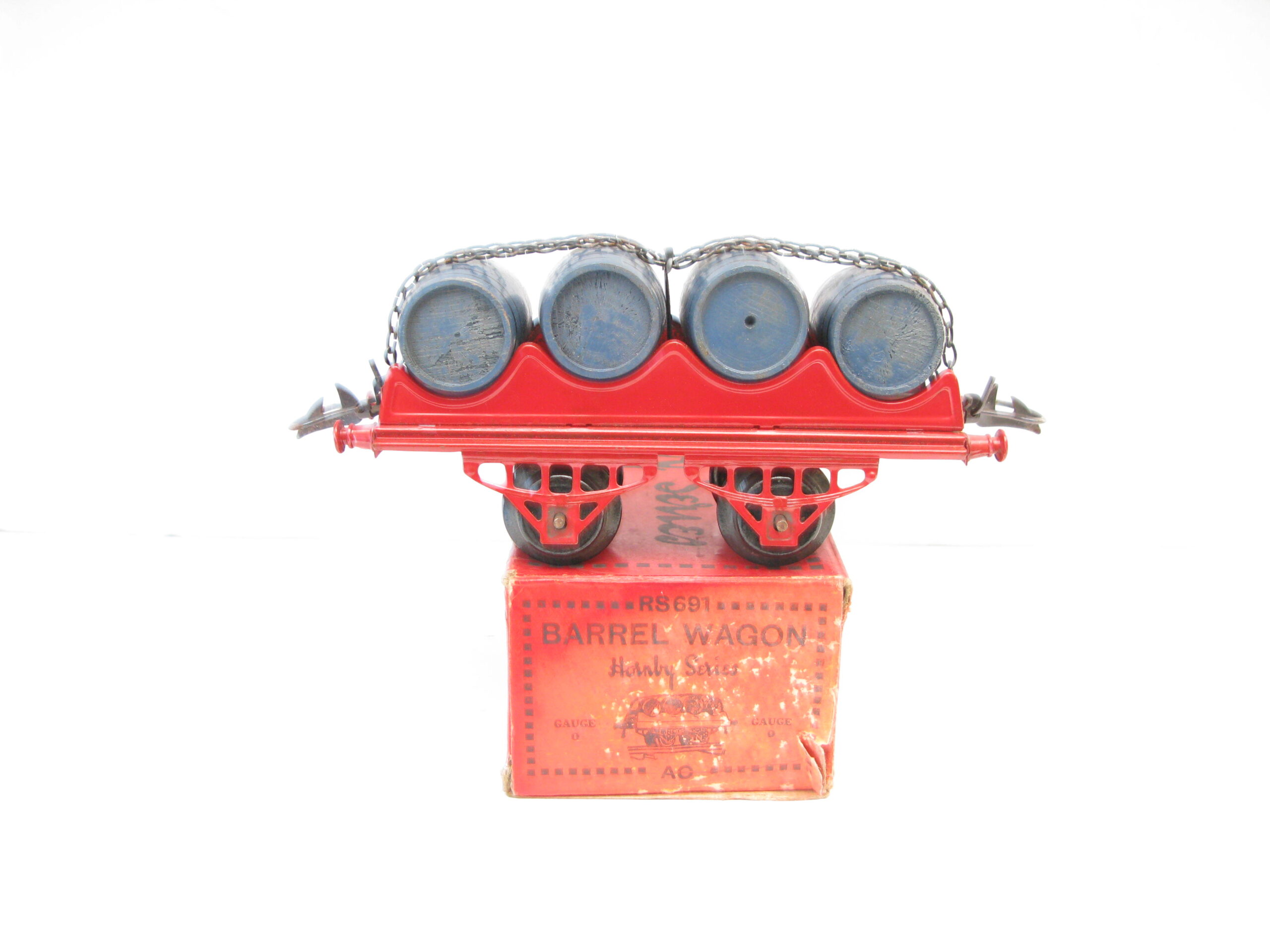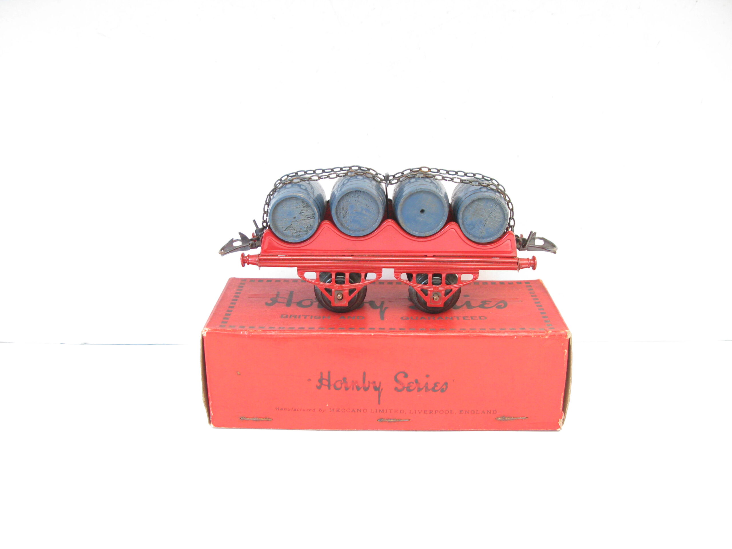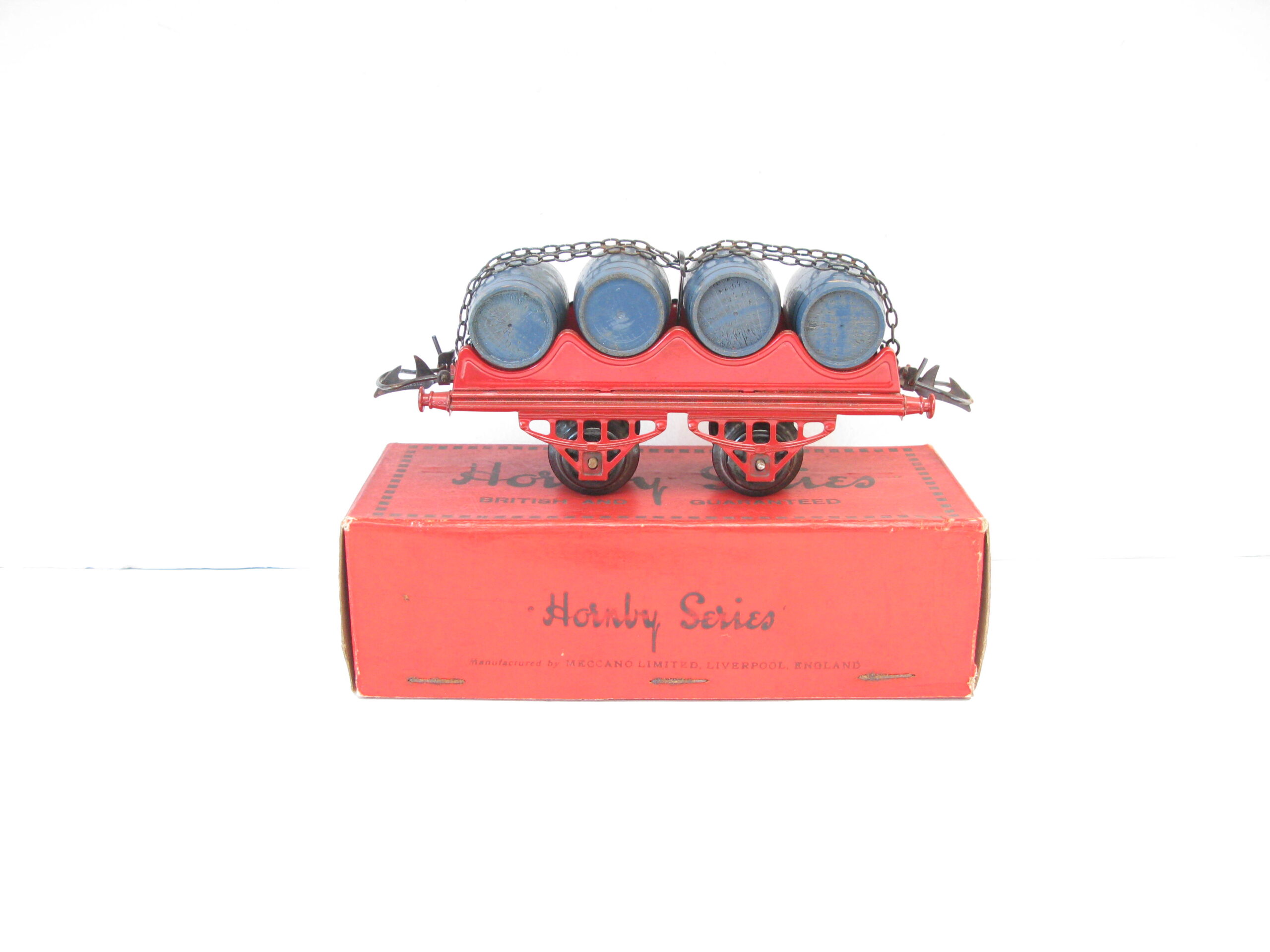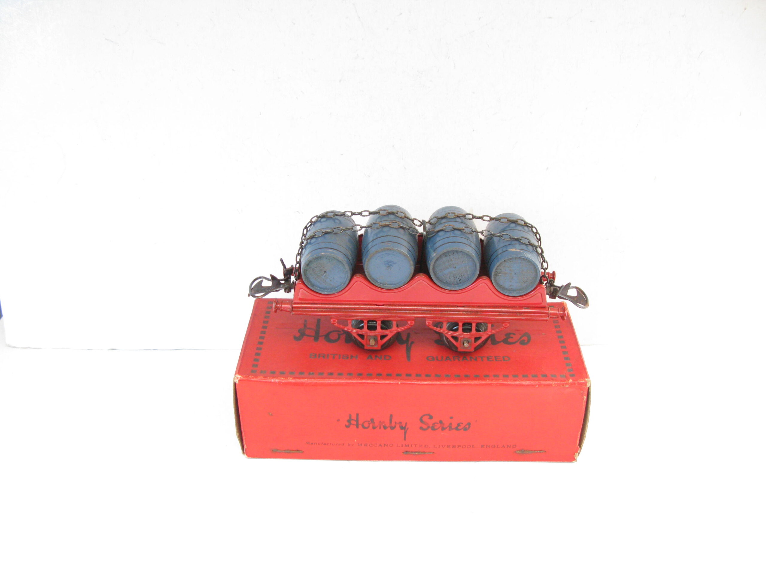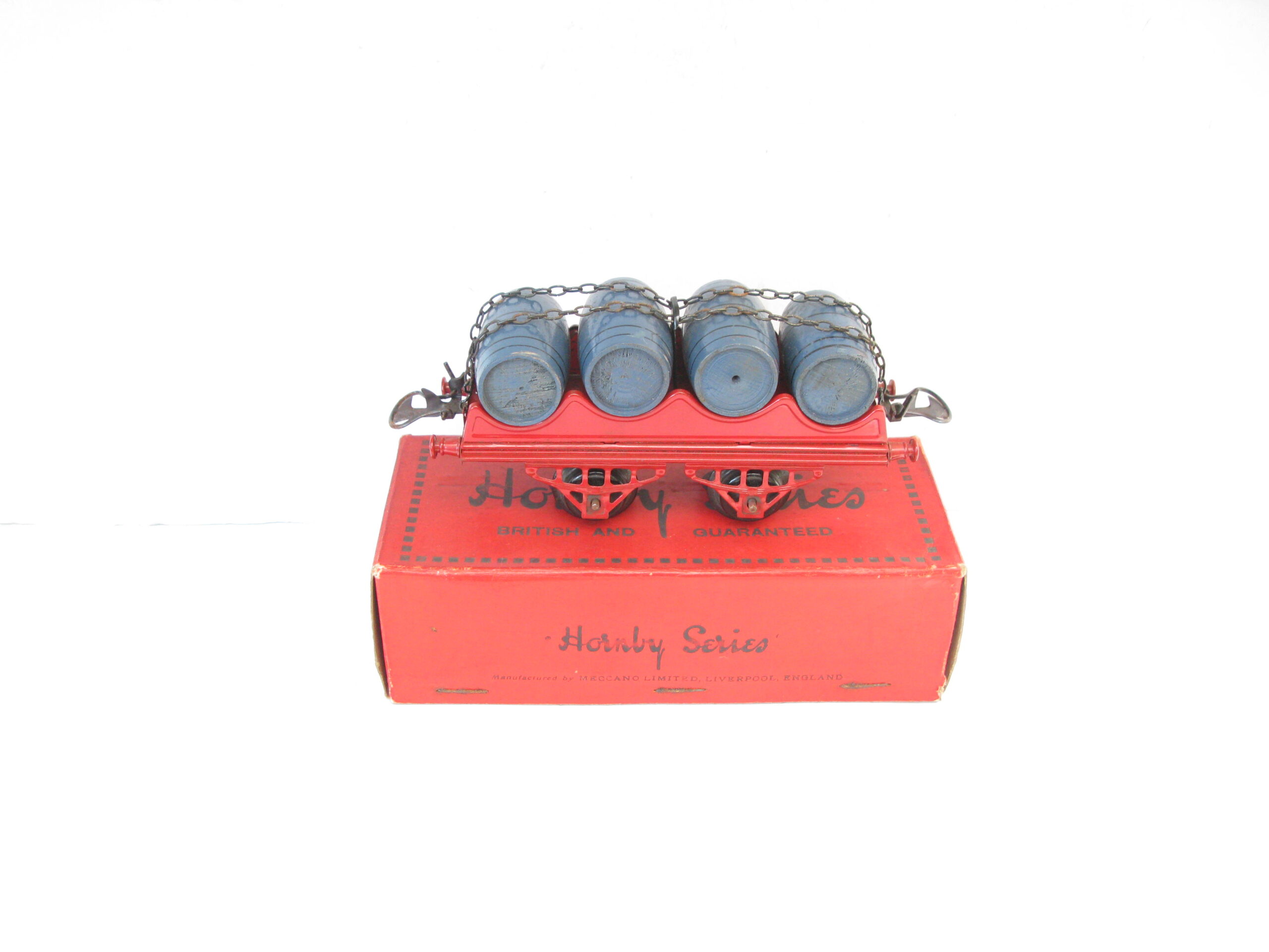 Hornby 0 Gauge Barrel Wagon with plain blue Barrels – Boxed – Here we have a Barrel wagon with pain Blue Barrels. Condition is Excellent/plus to Near Mint in Good box. This is an excellent wagon for the Hornby 0 Gauge collector in this condition