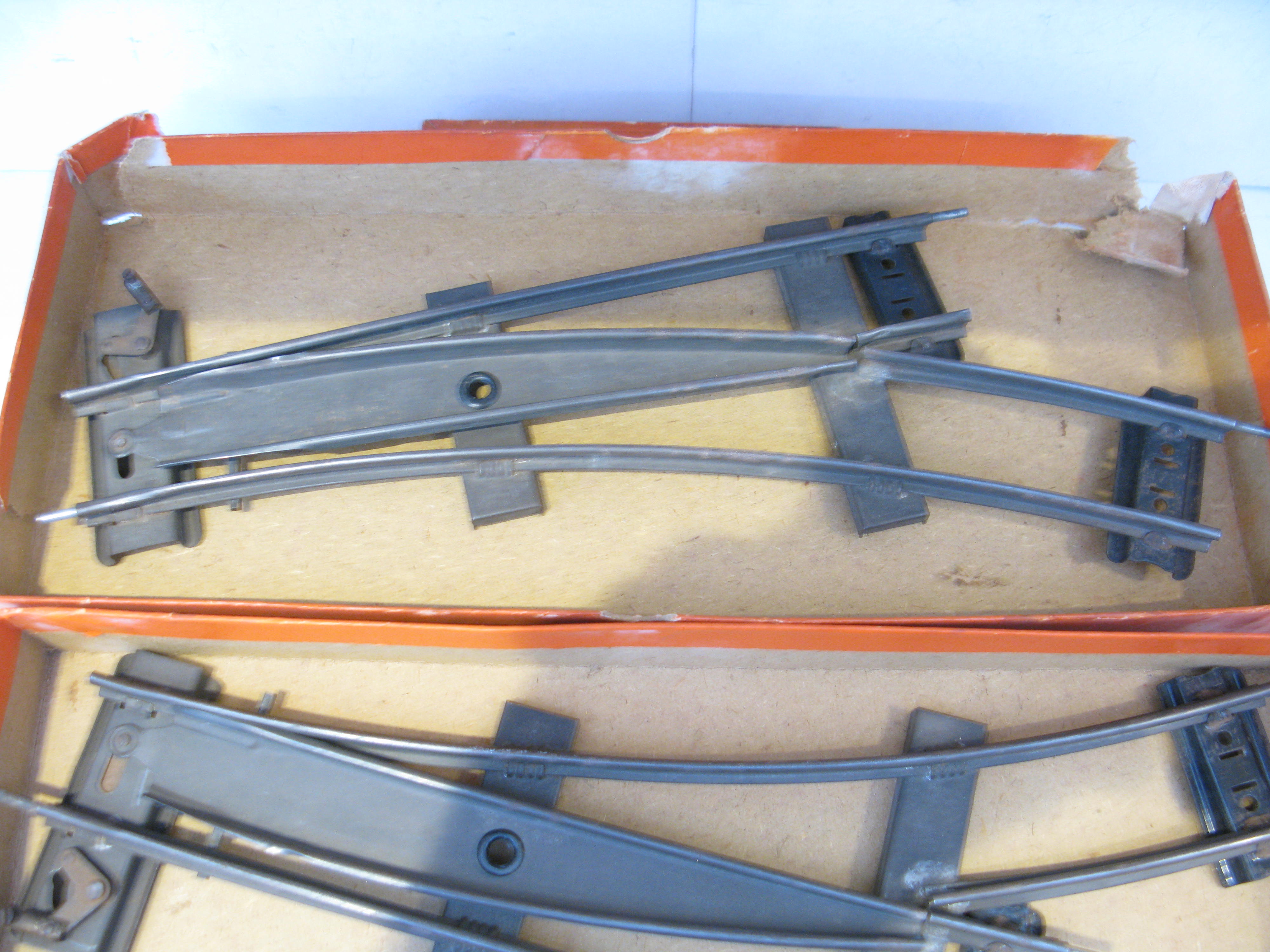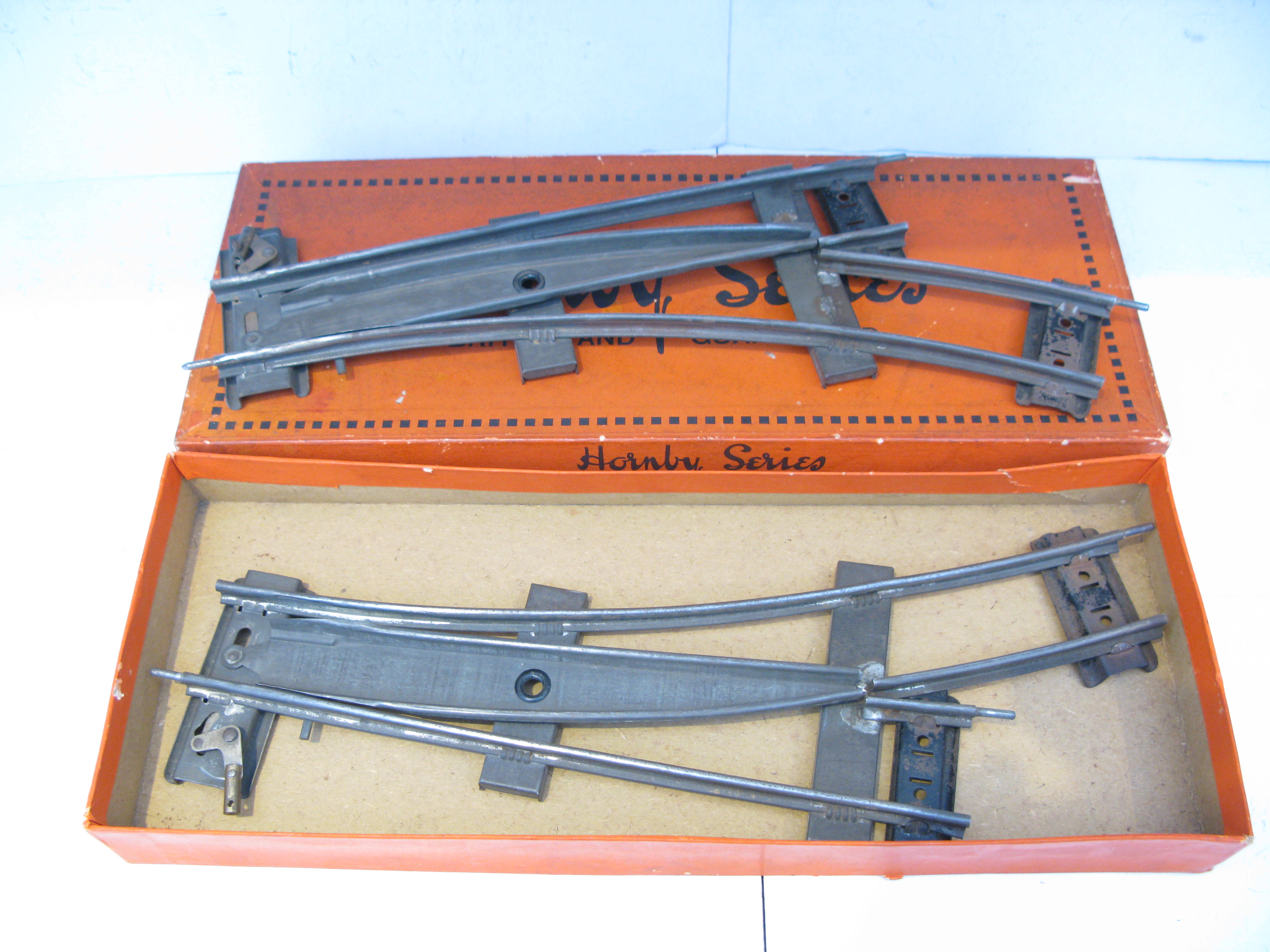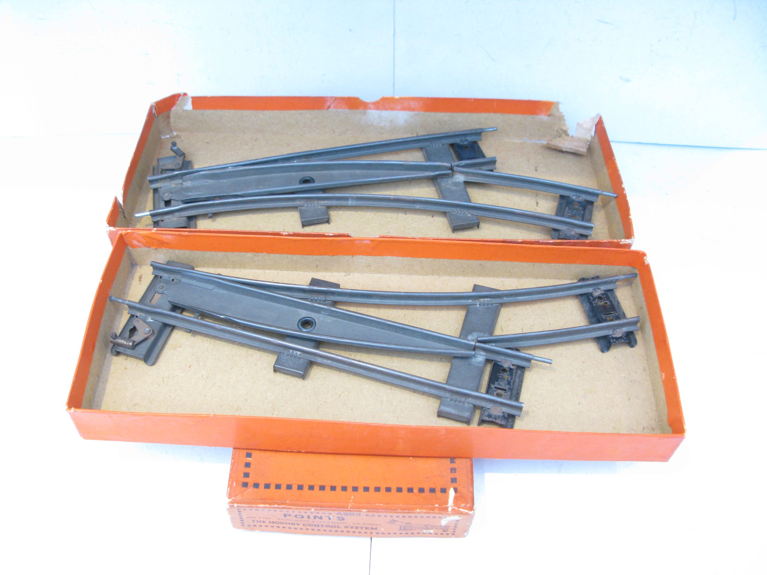 Hornby 0 Gauge CONTROL SYSTEM Tinplate 2-rail clockwork 2ft Radius Points – Boxed – From the range of Tinplate CONTROL SYSTEM a re a box of 2ft Radius Clockwork Points both fitted for control in Very Good to Excellent condition in there correct orange box of a pair 1 right and 1 left hand. Excellent all round condition in Good to Excellent boxes, 2 boxes available at £25 per box.