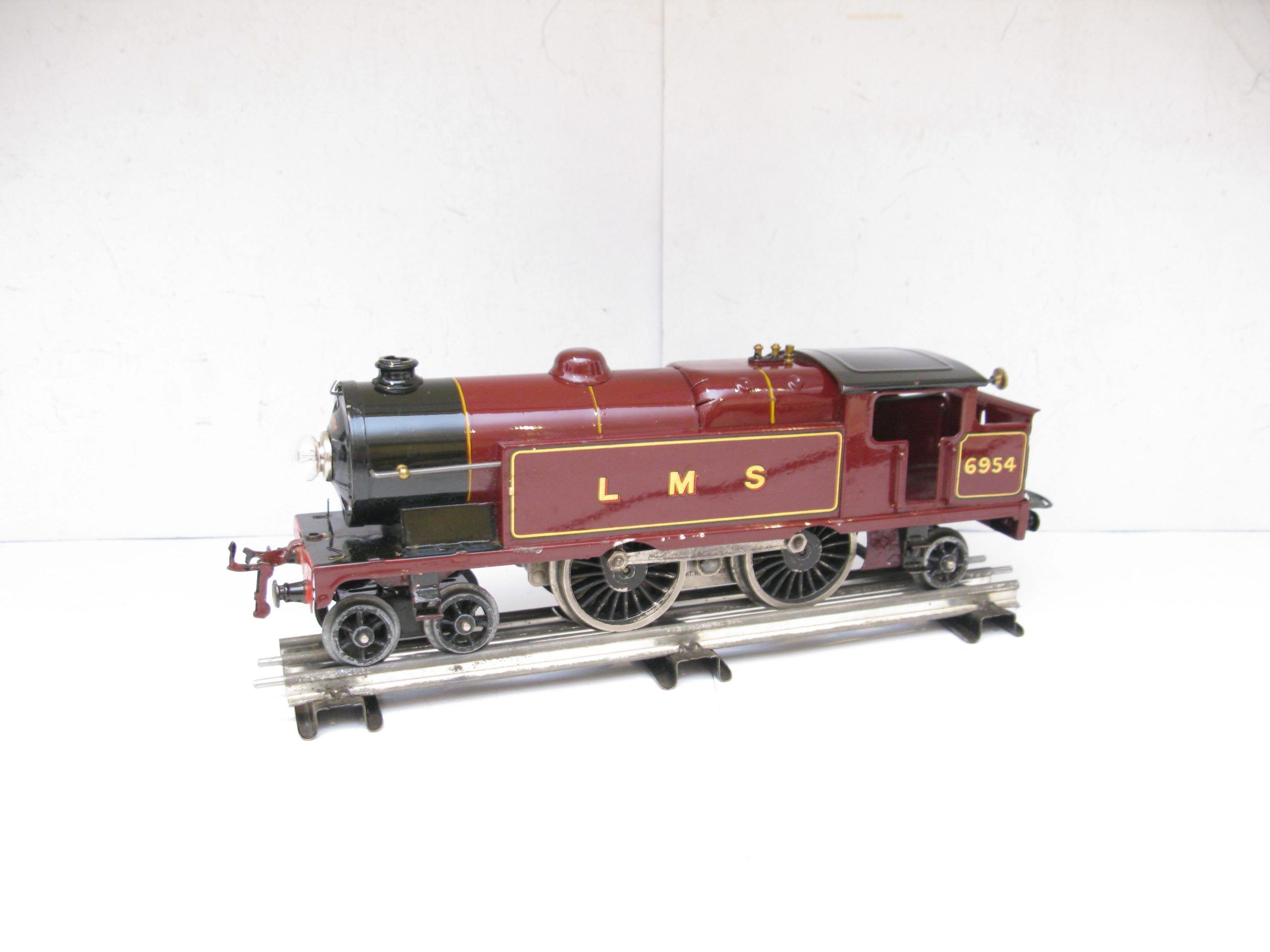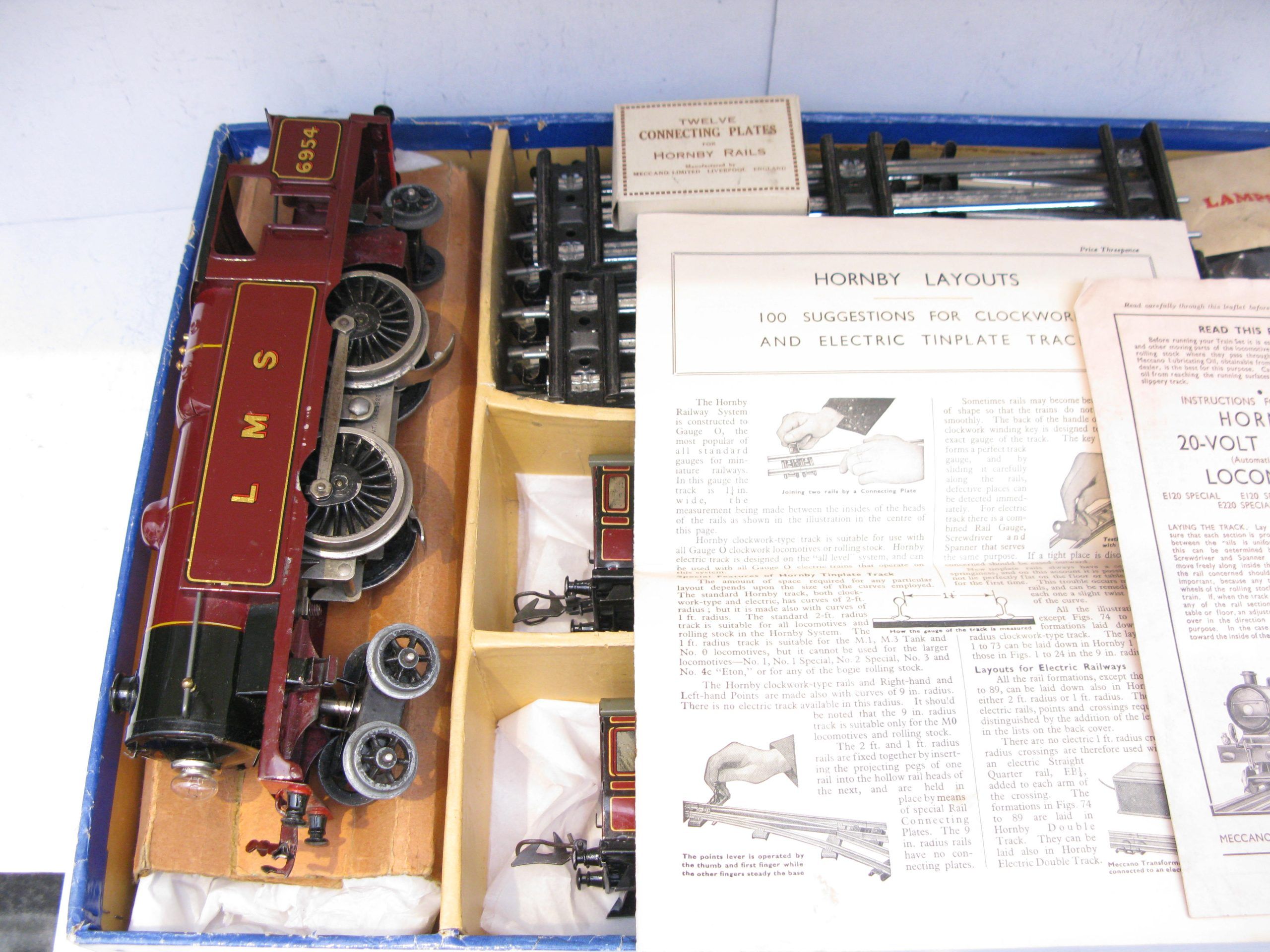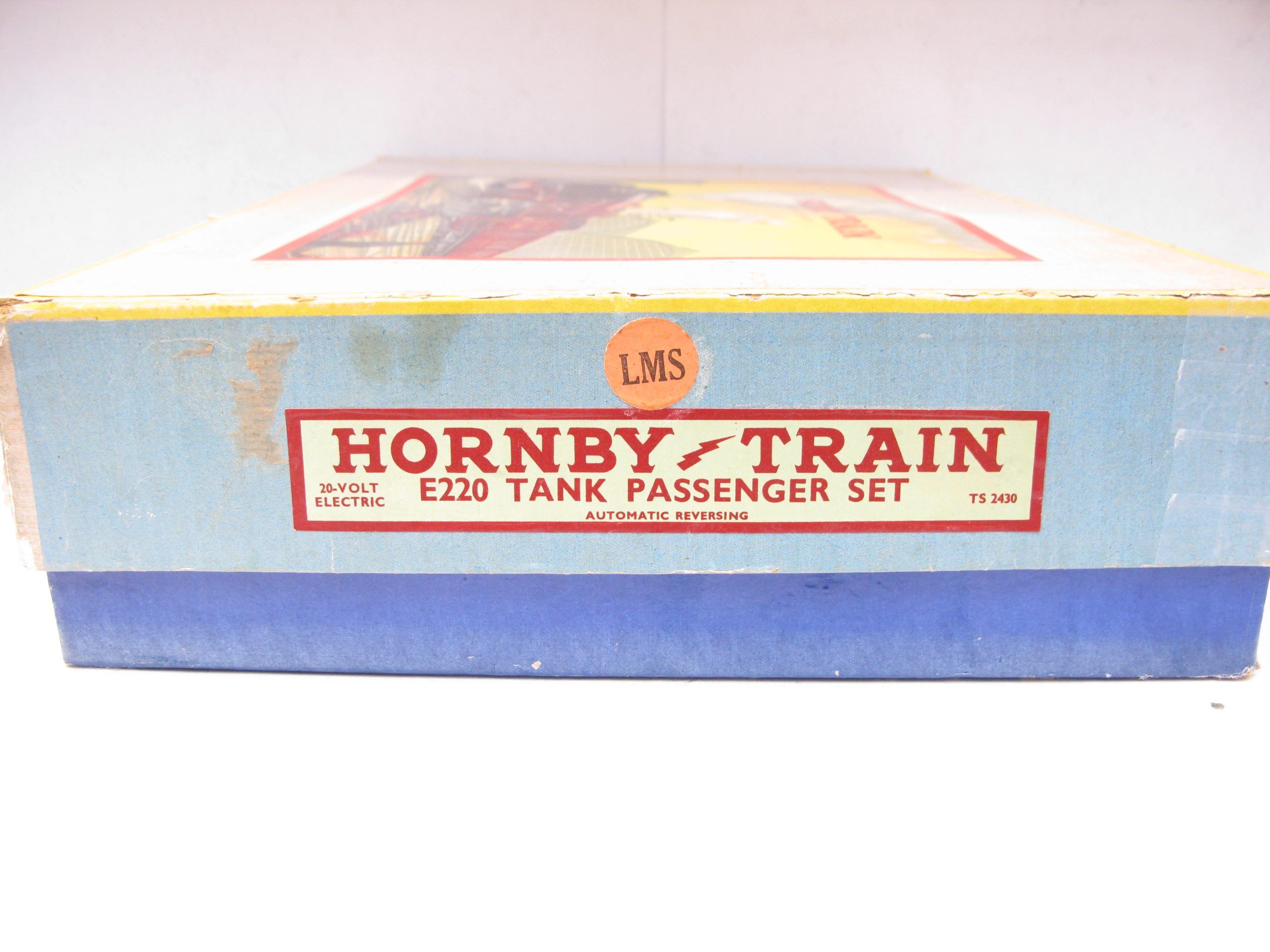 Hornby 0 Gauge E220 Special LMS Tank Passenger Set Circa 1937/38 – Boxed – From the range of Sets Produced by Hornby in the 1930’s is this LMS E220 special Tank Passenger set which consists of a 4-4-2 Special Tank loco No.6954, 20 volt electric, No.2 LMS Passenger Coach and a No.2 LMS Brake end Passenger coach, TCP, packet of Track Clips, packet of loco lamps, oval of 3-rail tinplate Track with instructions and Track layout leaflet. Overall condition is Excellent to Excellent contained in original box, some repairs and wear to lid edges otherwise Excellent. I have checked and run the Locomotive which when tested reversed every time however this will never happen in reality. The lever is set for the Loco to run forward.  A great addition to Hornby 0 Gauge Collection.