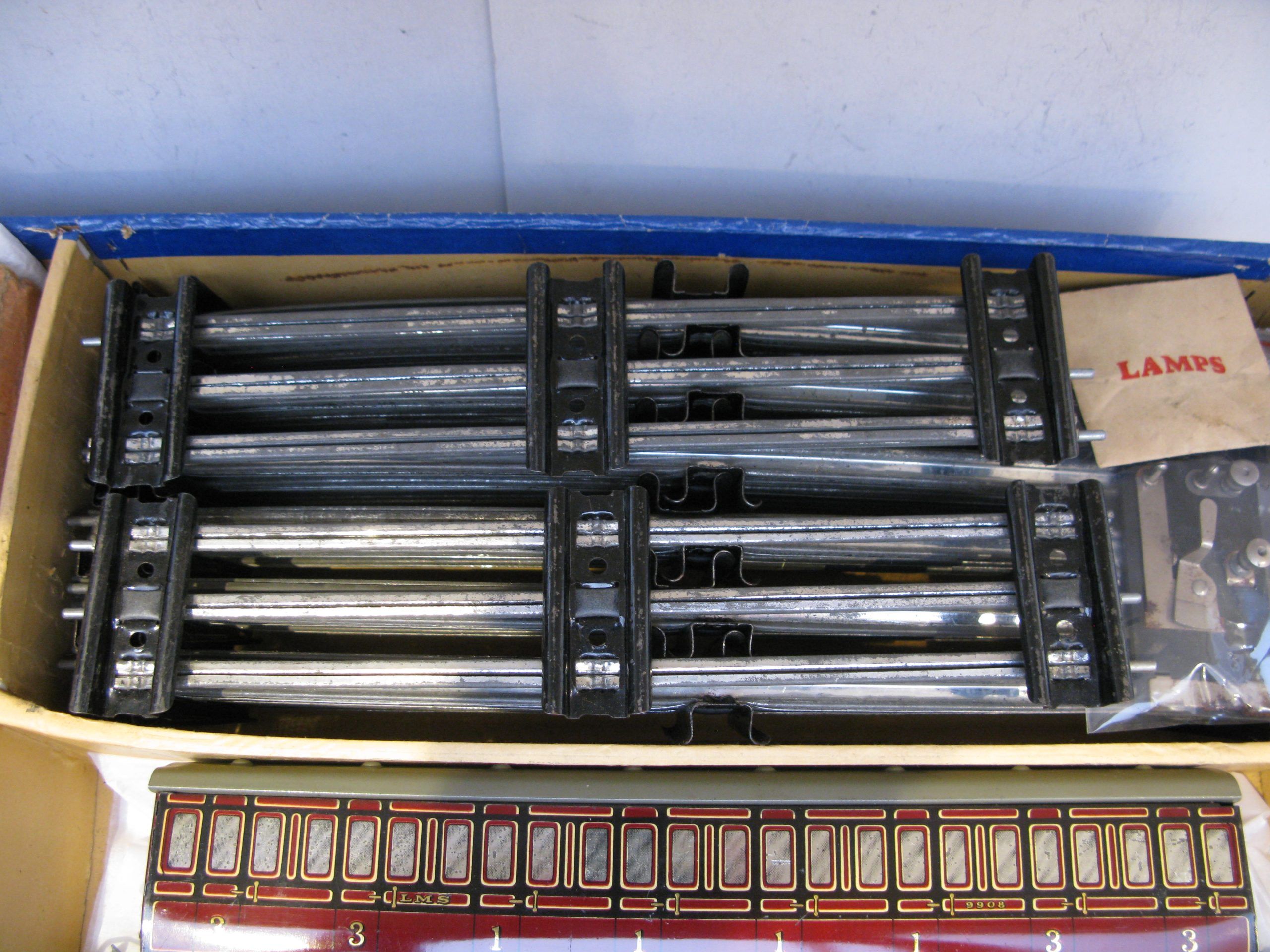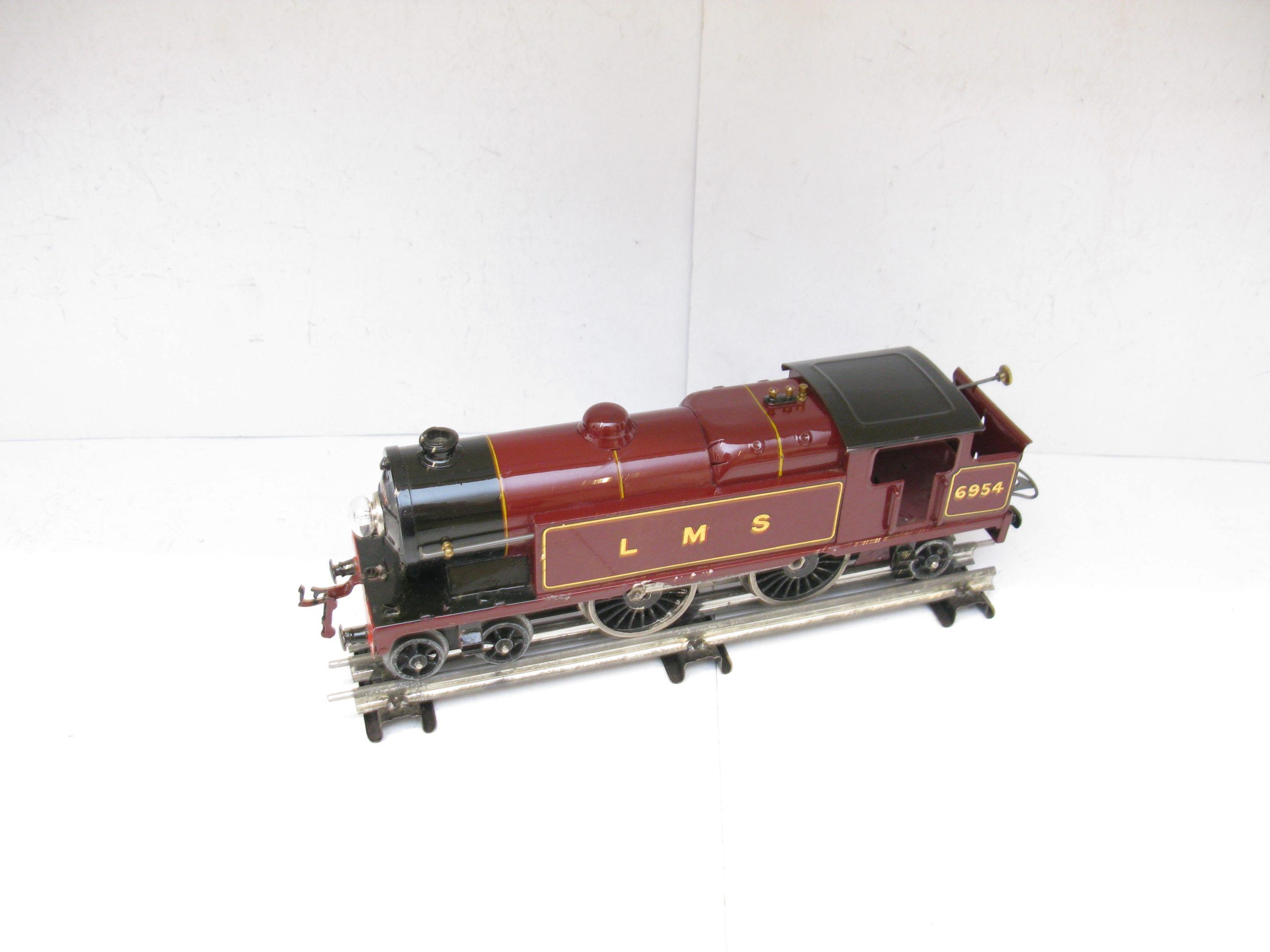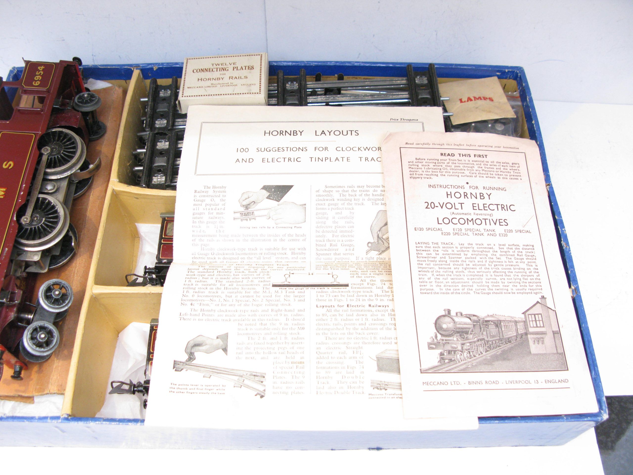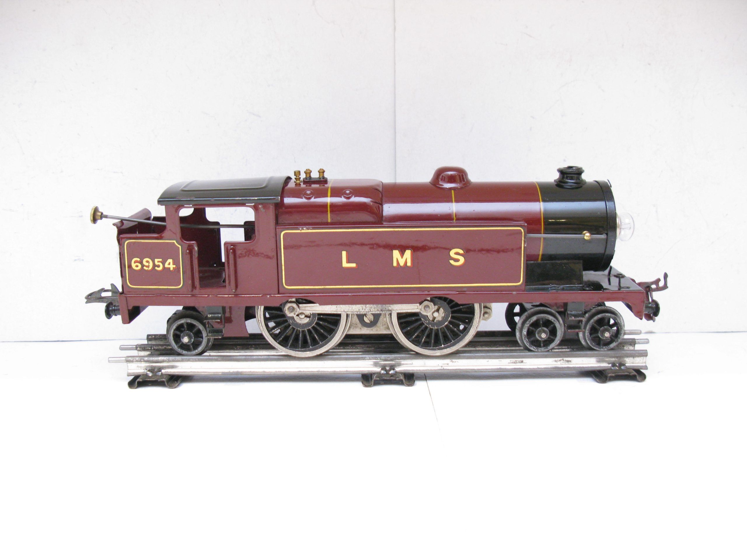 Hornby 0 Gauge E220 Special LMS Tank Passenger Set Circa 1937/38 – Boxed – From the range of Sets Produced by Hornby in the 1930’s is this LMS E220 special Tank Passenger set which consists of a 4-4-2 Special Tank loco No.6954, 20 volt electric, No.2 LMS Passenger Coach and a No.2 LMS Brake end Passenger coach, TCP, packet of Track Clips, packet of loco lamps, oval of 3-rail tinplate Track with instructions and Track layout leaflet. Overall condition is Excellent to Excellent contained in original box, some repairs and wear to lid edges otherwise Excellent. I have checked and run the Locomotive which when tested reversed every time however this will never happen in reality. The lever is set for the Loco to run forward.  A great addition to Hornby 0 Gauge Collection.