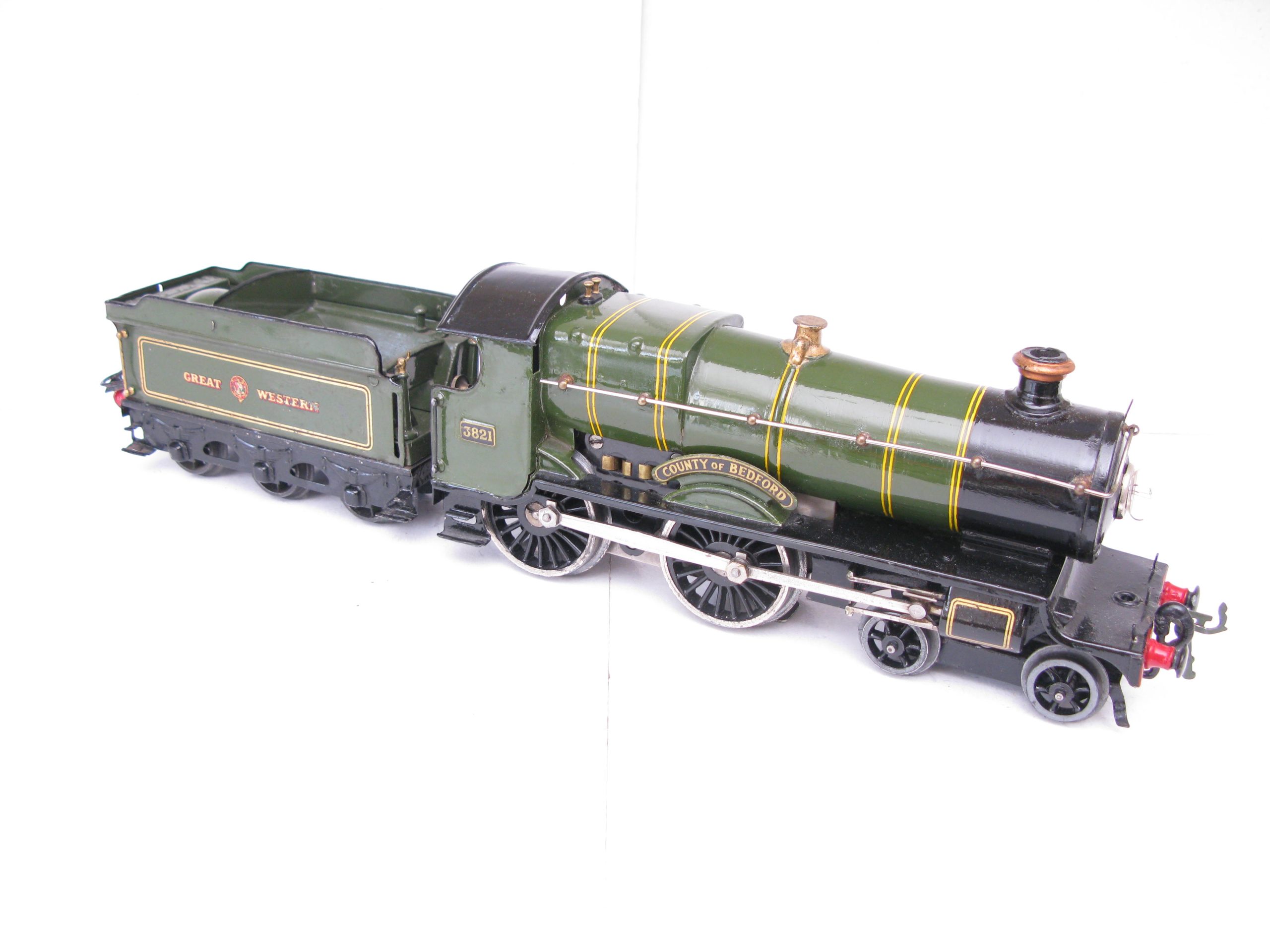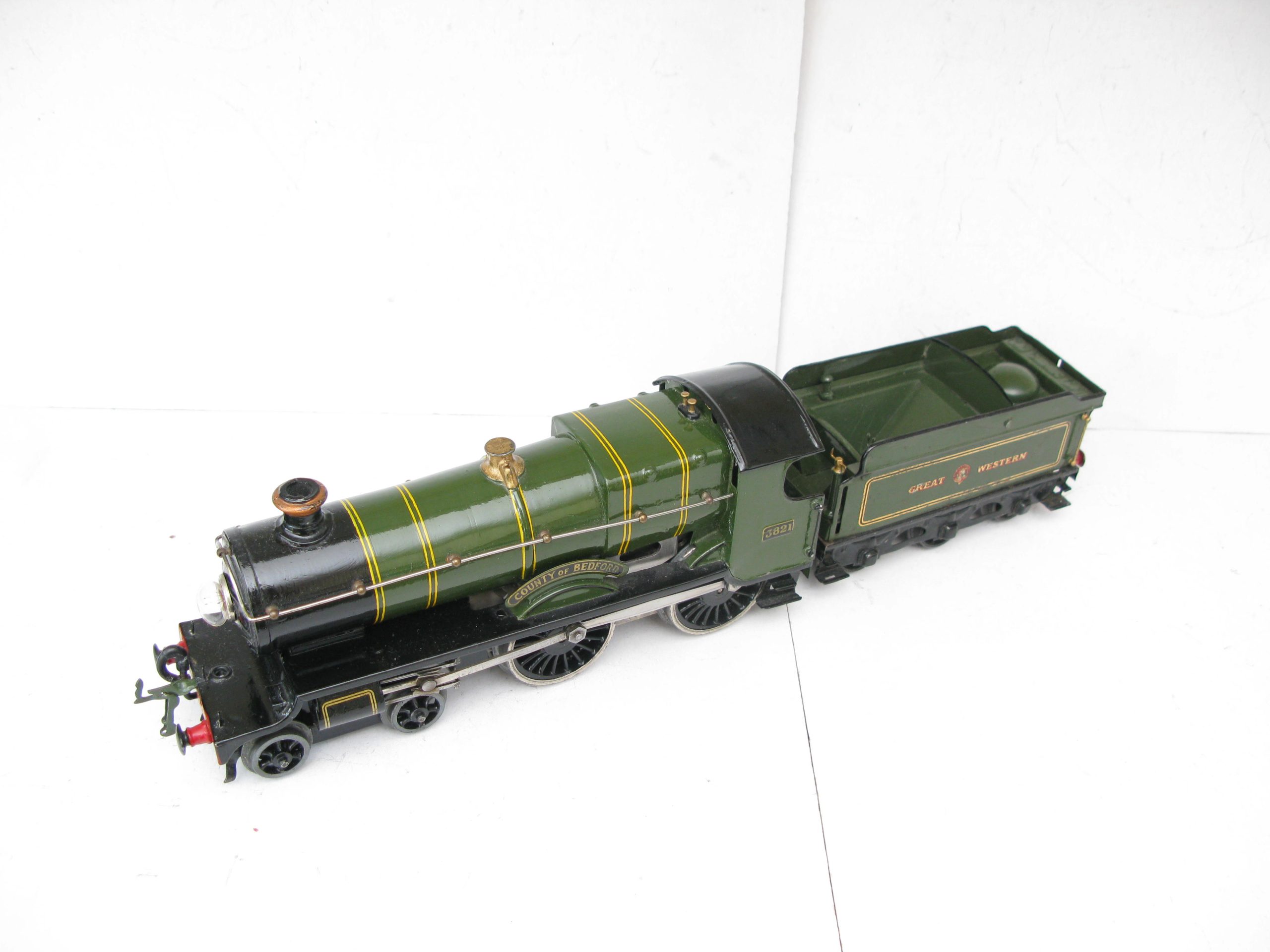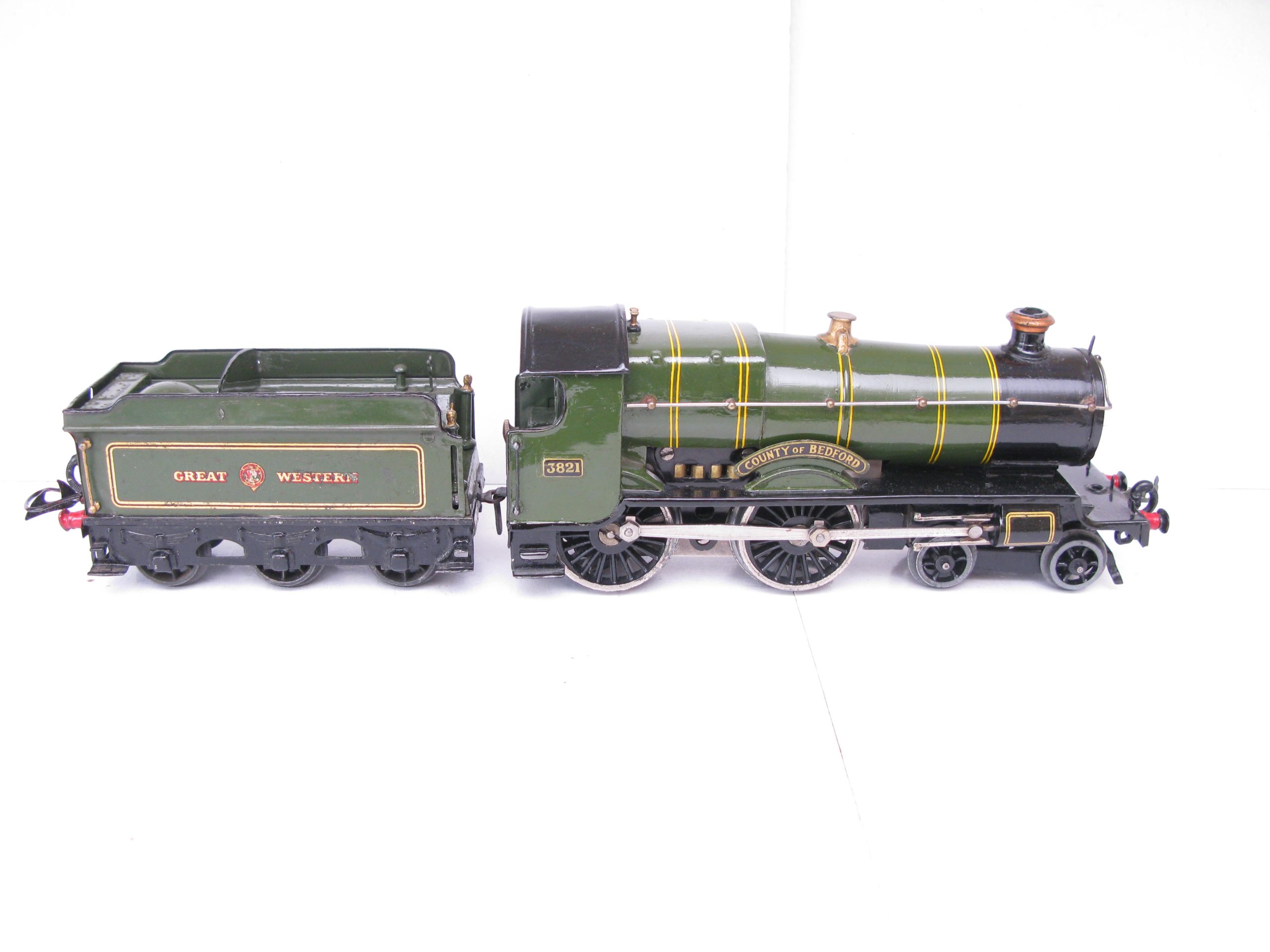 Hornby 0 Gauge E220 Special Loco & Tender GWR green ‘COUNTY OF BEDFORD’ No.3821, 20 volt electric – unboxed – From the popular Range of No.2 Special Loco & Tenders is this 20 volt electric GWR version ‘County of Bedford’ No.3821. Hornby produced these in clockwork and electric until 1939/40 when produced ceased. The Loco has been repainted, lined and transfered to a Good standard, the tender has some retouching. Overall Excellent. An excellent opportunity to add this to your GWR Loco your Stud.