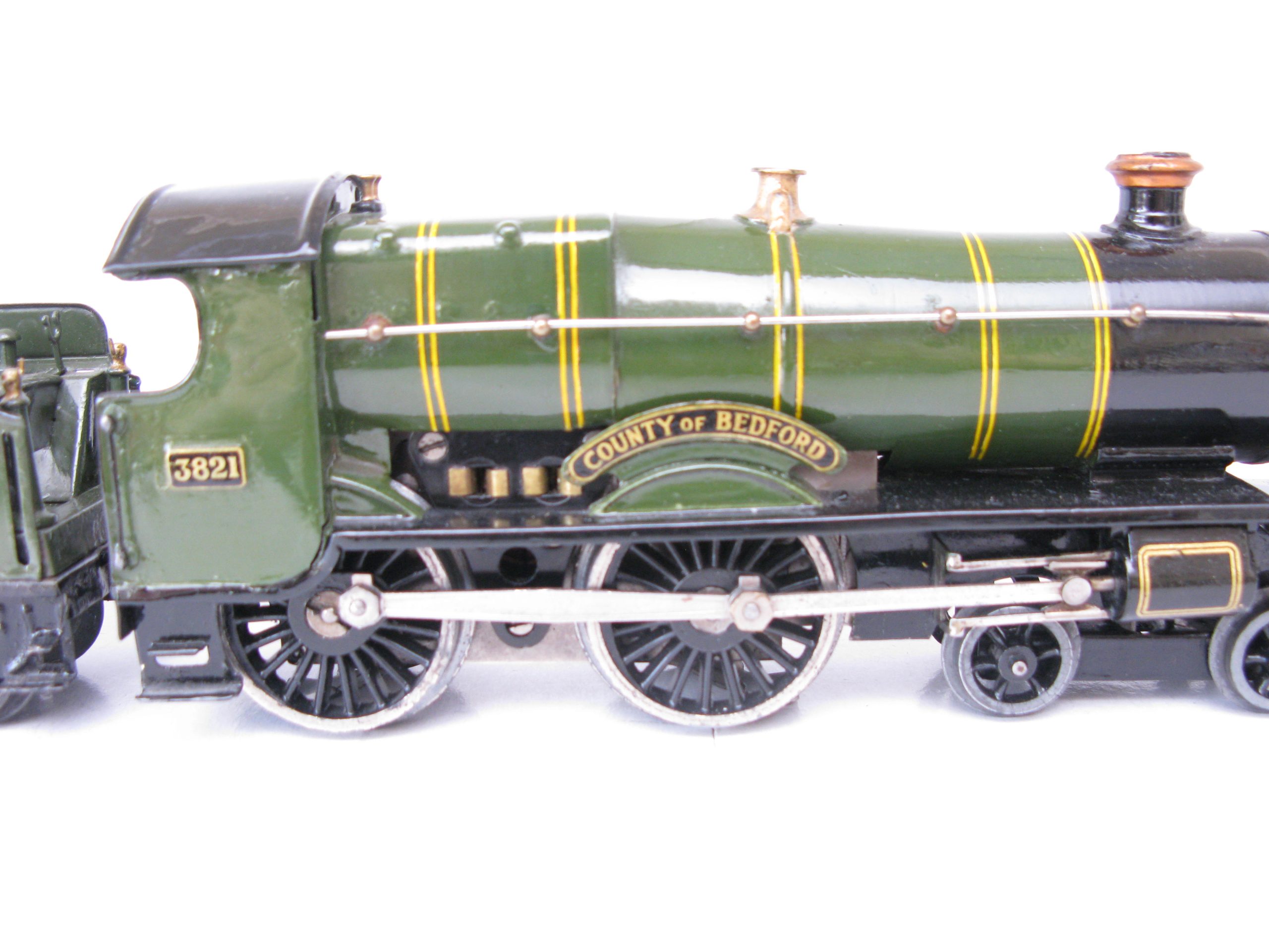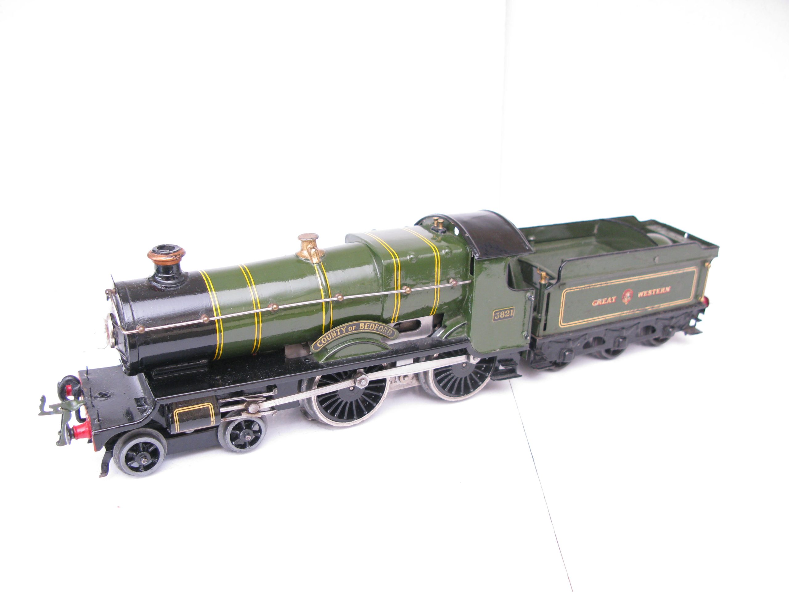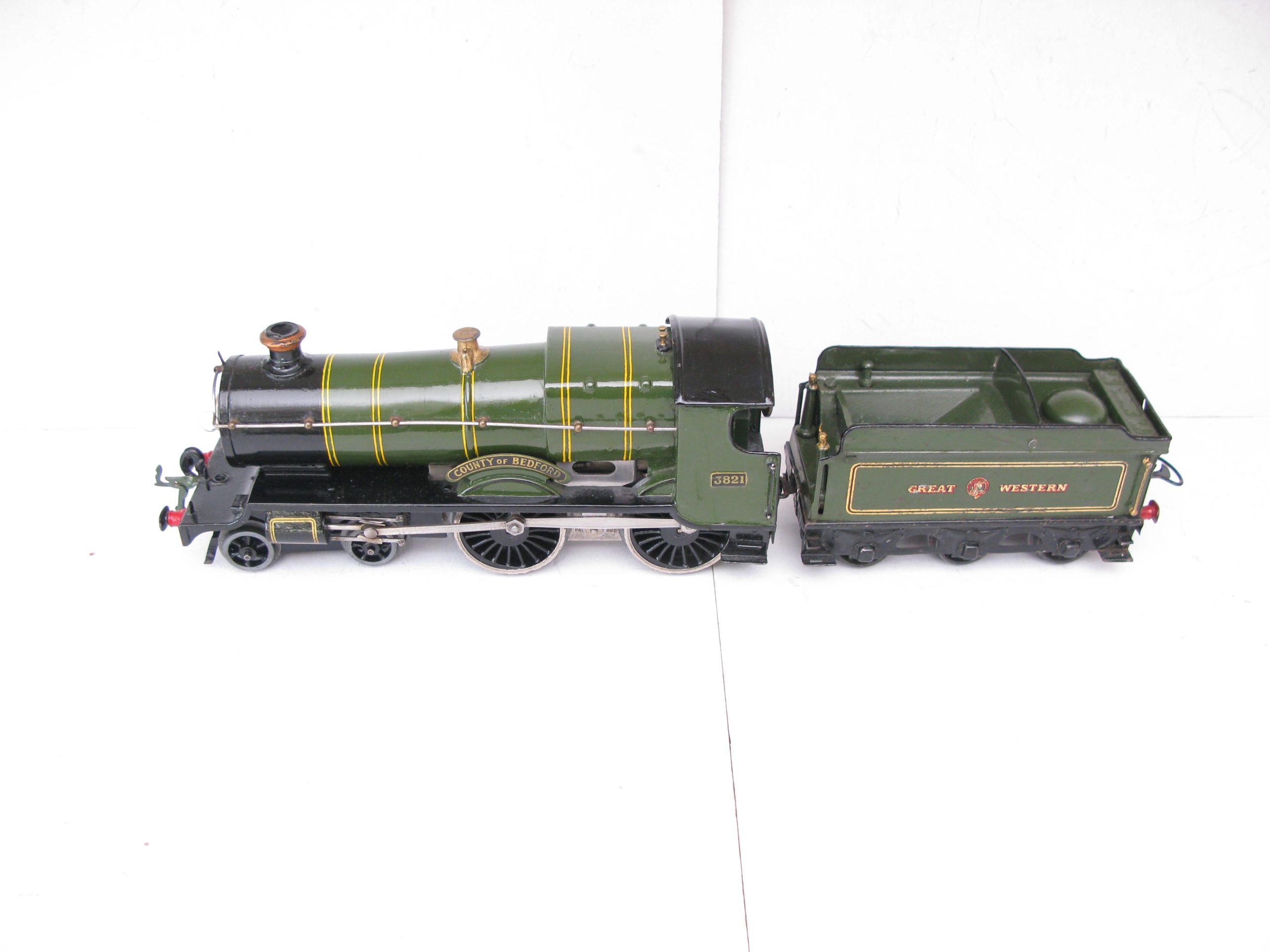 Hornby 0 Gauge E220 Special Loco & Tender GWR green ‘COUNTY OF BEDFORD’ No.3821, 20 volt electric – unboxed – From the popular Range of No.2 Special Loco & Tenders is this 20 volt electric GWR version ‘County of Bedford’ No.3821. Hornby produced these in clockwork and electric until 1939/40 when produced ceased. The Loco has been repainted, lined and transfered to a Good standard, the tender has some retouching. Overall Excellent. An excellent opportunity to add this to your GWR Loco your Stud.