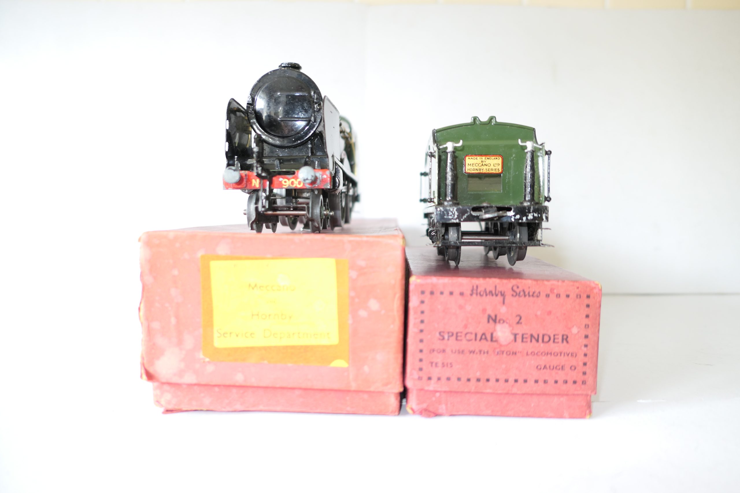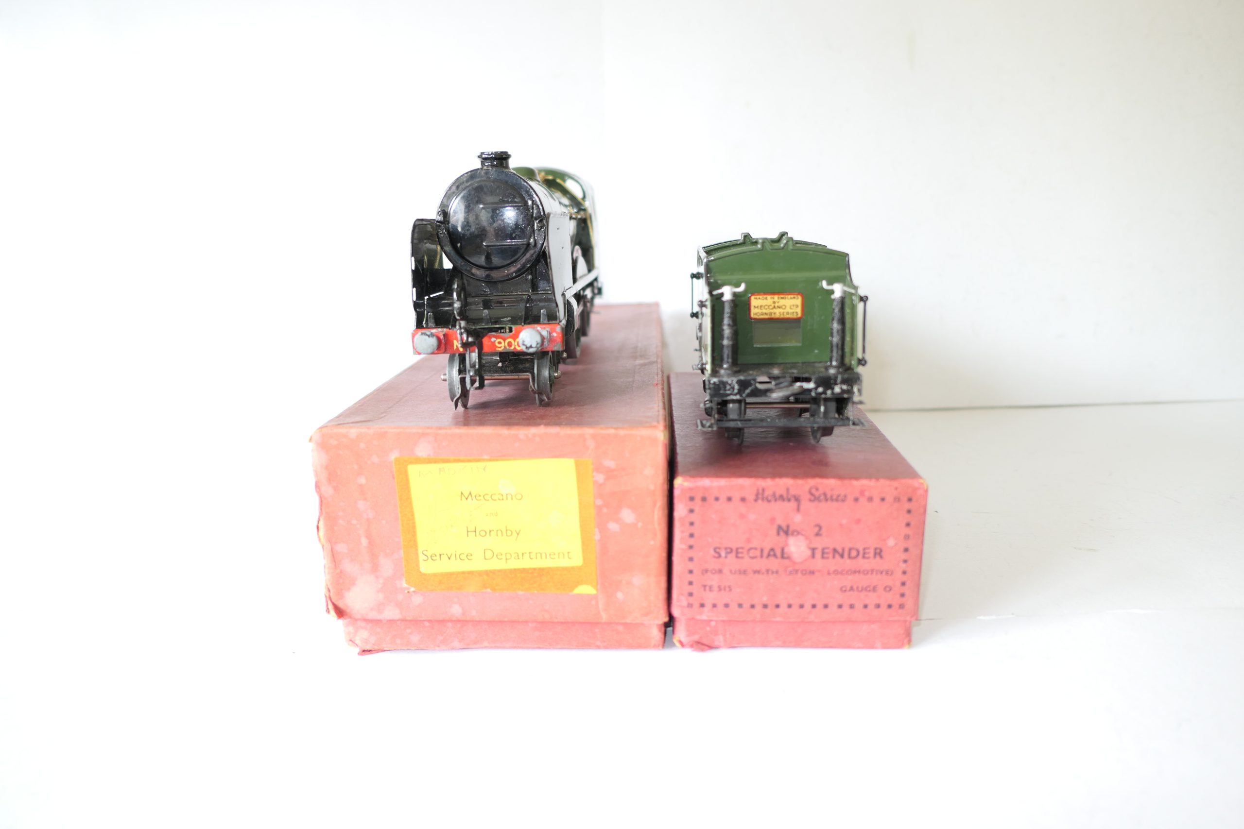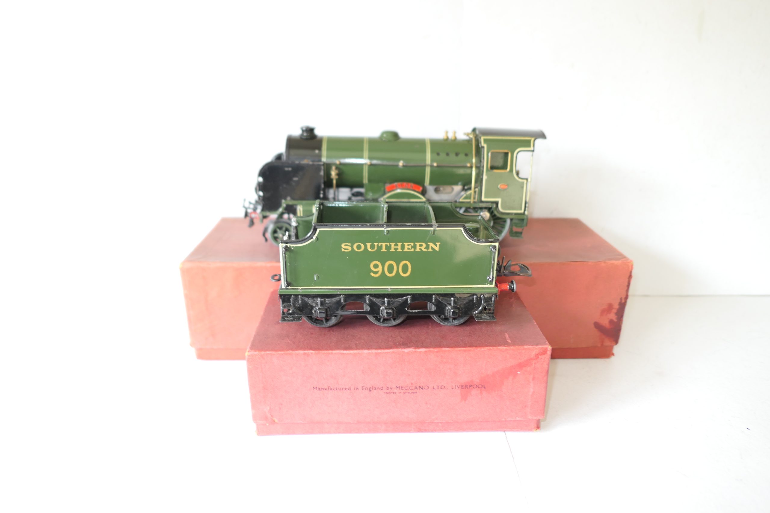 Hornby 0 Gauge E420 Special Loco & Tender SR ‘ETON’ No.900, 20 volt electric – Boxed – Excellent – Here we have from the No.E420 20 volt electric SR ‘ETON’ Locomotive and Tender. These were produced from 1937 until production ceased for the war effort in 1939/40. This example dates from the period of 1937/38. The locomotive has spme fatigue to the front buffers (usual mazac parts), overall in Excellent condition. The Loco box is in a Good Factory repair box with yellow printed label to one end, internal brown Corrugated wrapper, includes 3 Loco lamps, one original rare destination disc and Loco spanner. Tender in the Correct ‘Eton’ box. A great opportunity to acquire this Loco to add to your Hornby 0 Gauge collection.