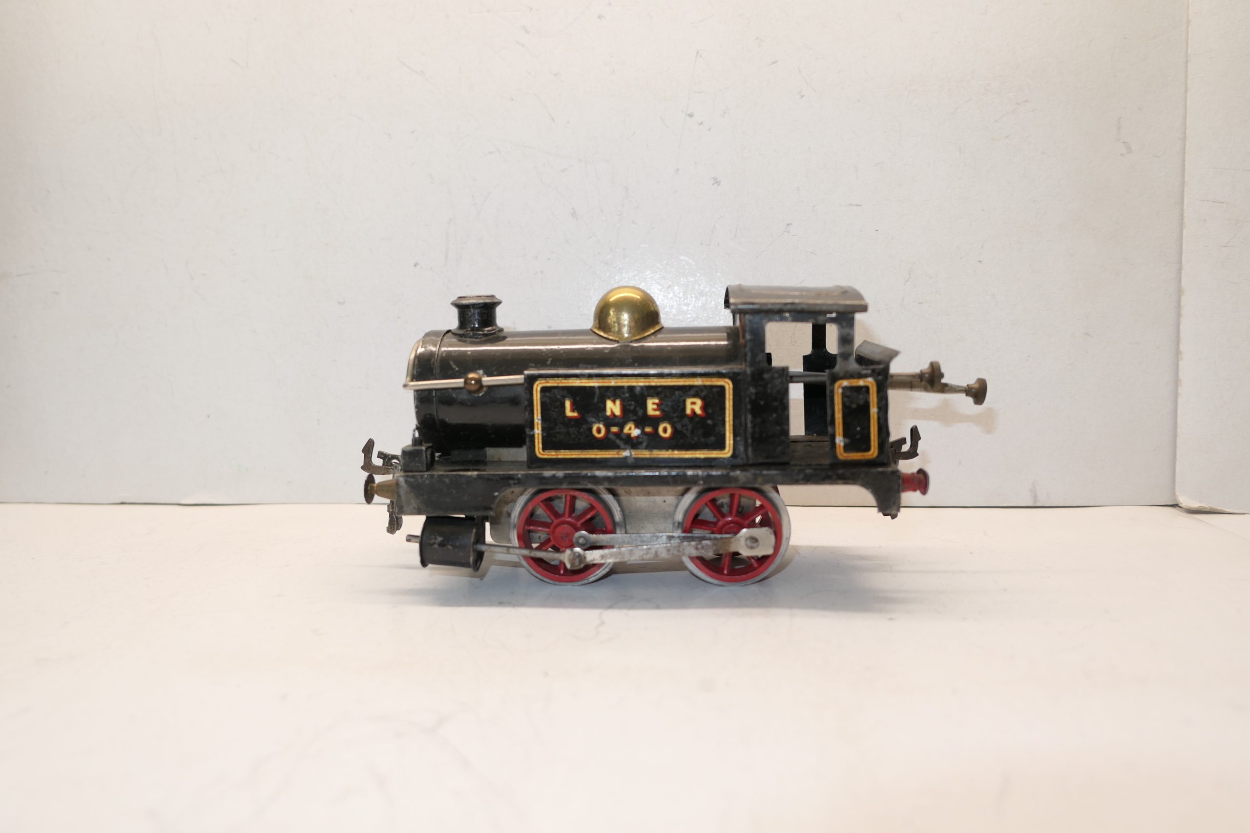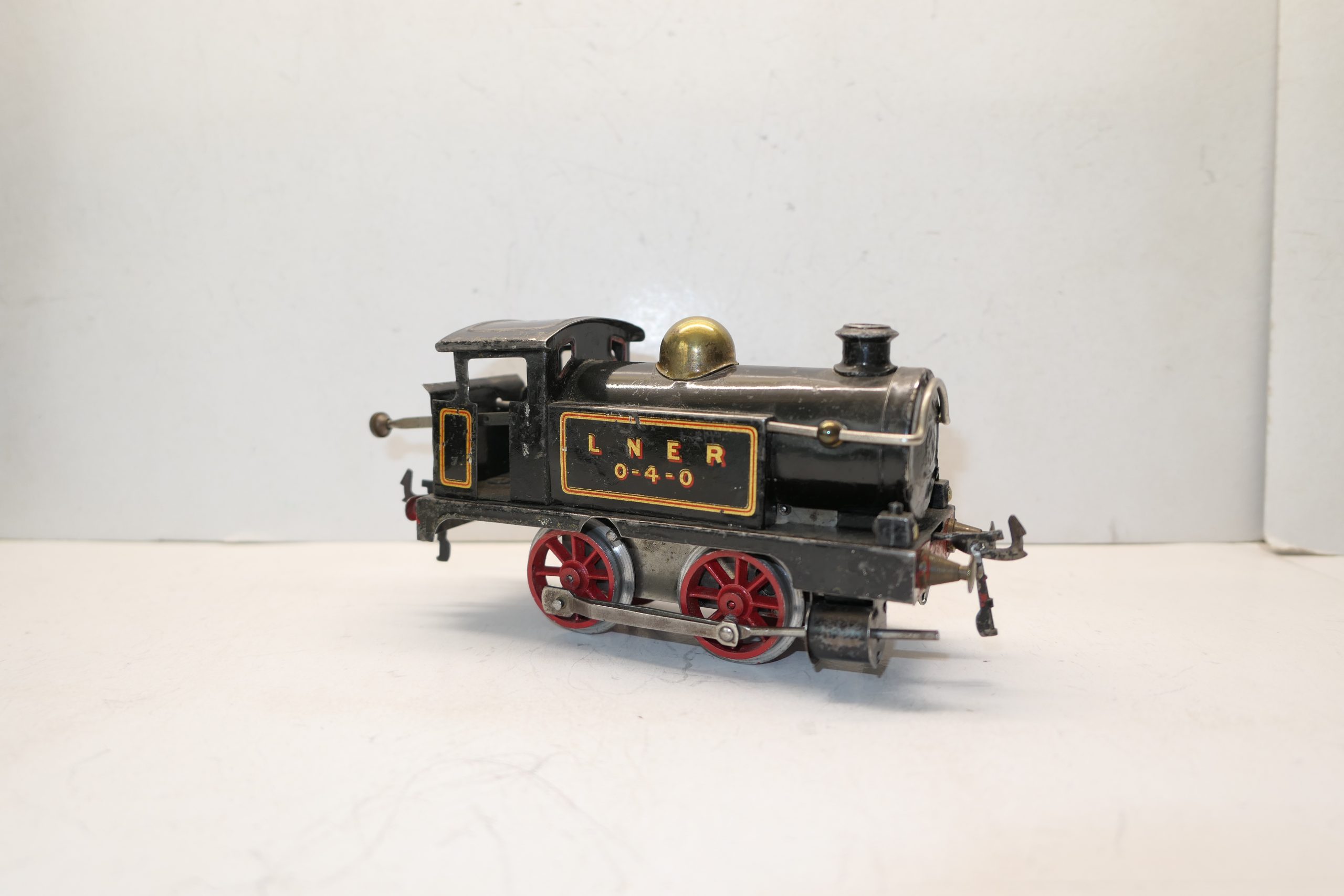 Hornby 0 Gauge Early 0-4-0 LNER No.1 Tank Locomotive, Clockwork – unboxed – Overall Fair Circa 1924/26 – Fron the range of No.1 Loco’s pre 1930 is this No.1 Tank Loco in LNER lined black with the 0-4-0 numbering to the Tank sides. Please note – I have not not serviced this Loco and is being sold as seen, it has been rewheeled with the standard replacement wheels at some point, when tested it was found to be in good working order, great opportunity to add this to your collection Circa 1924/26.