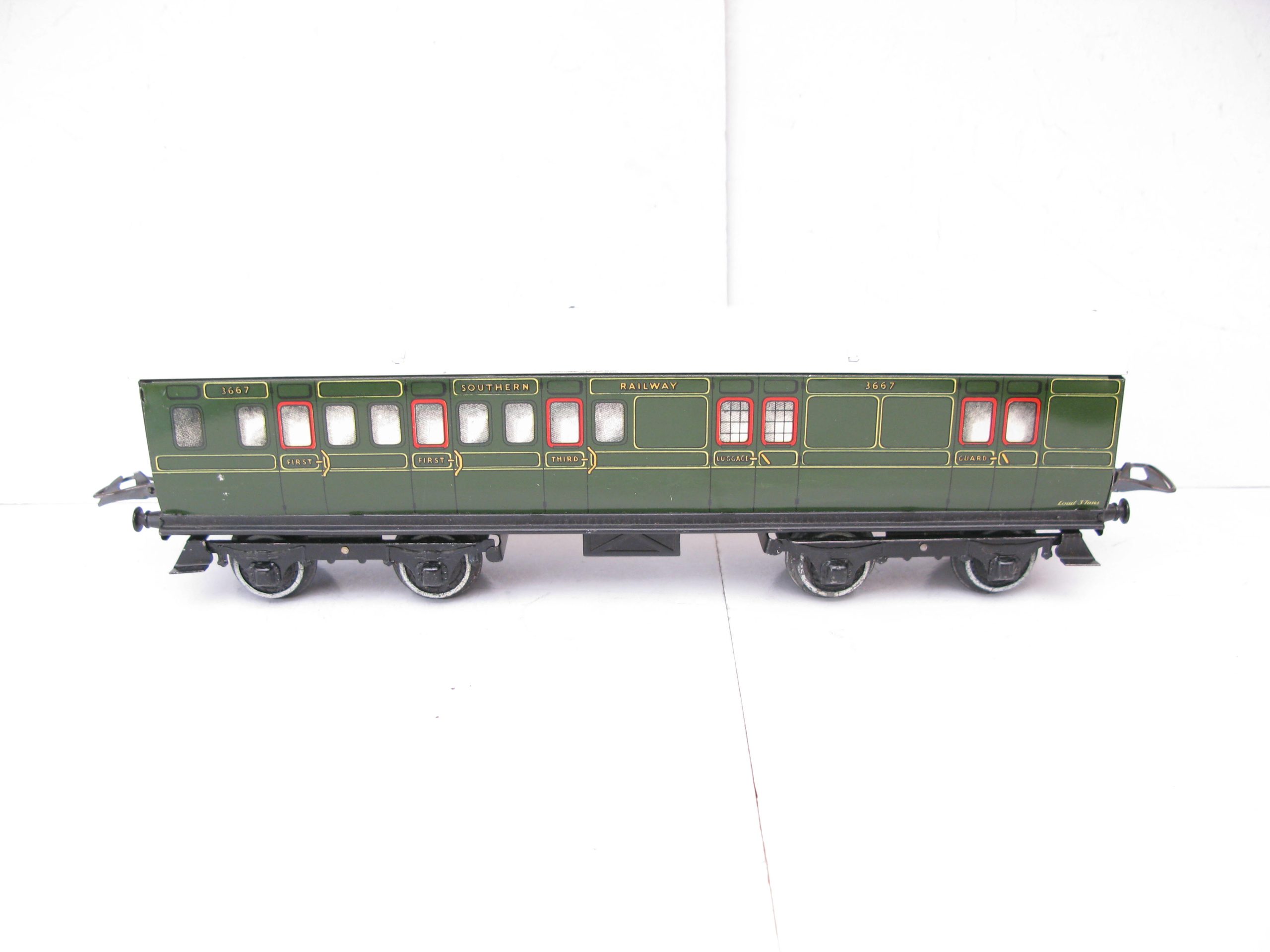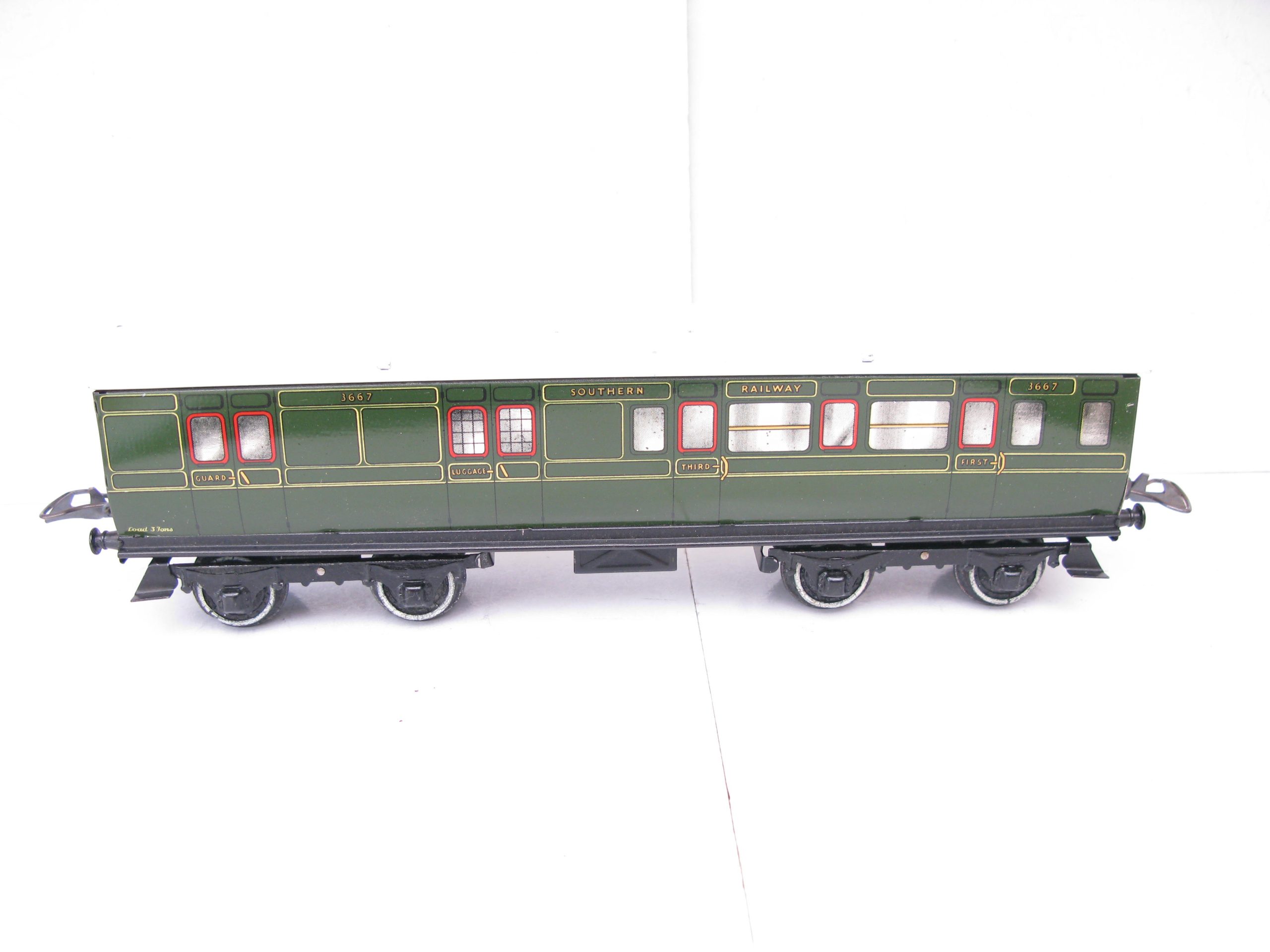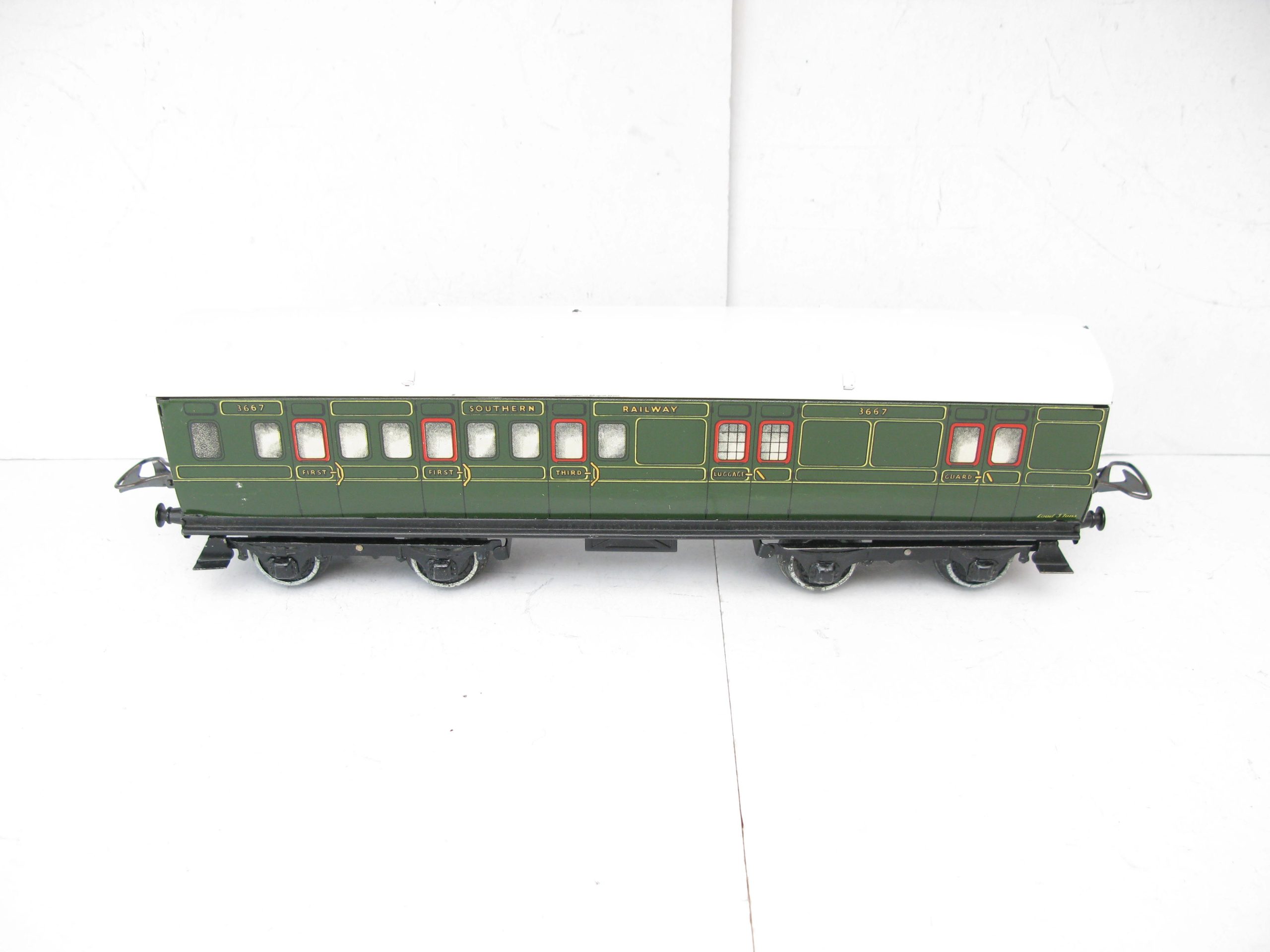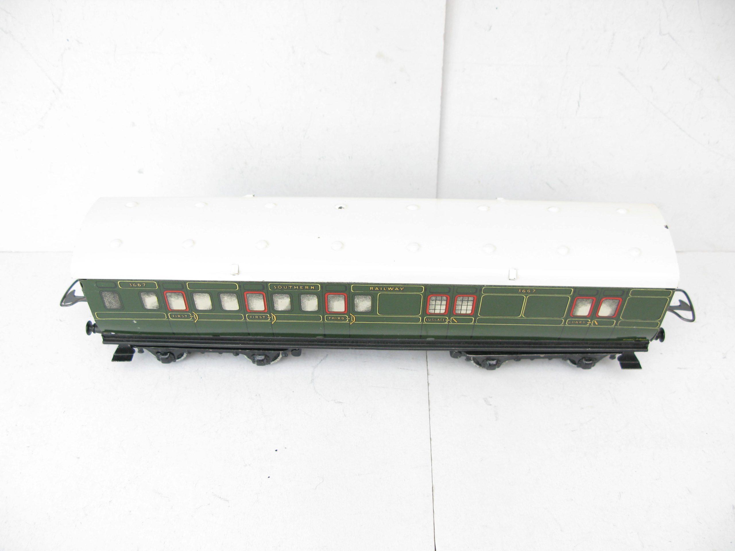 Hornby 0 Gauge No.2 SR 1st/3rd Brake end Corridor Coach – unboxed – Excellent/plus – The No.2 Corridor Coaches were produced from 1937 in all regions this the SR No.2 1st/3rd Brake end Corridor Coach version dated from 1939 with Matt finish base, sides are Excellent/plus condition, the roof has some marks Excellent.
