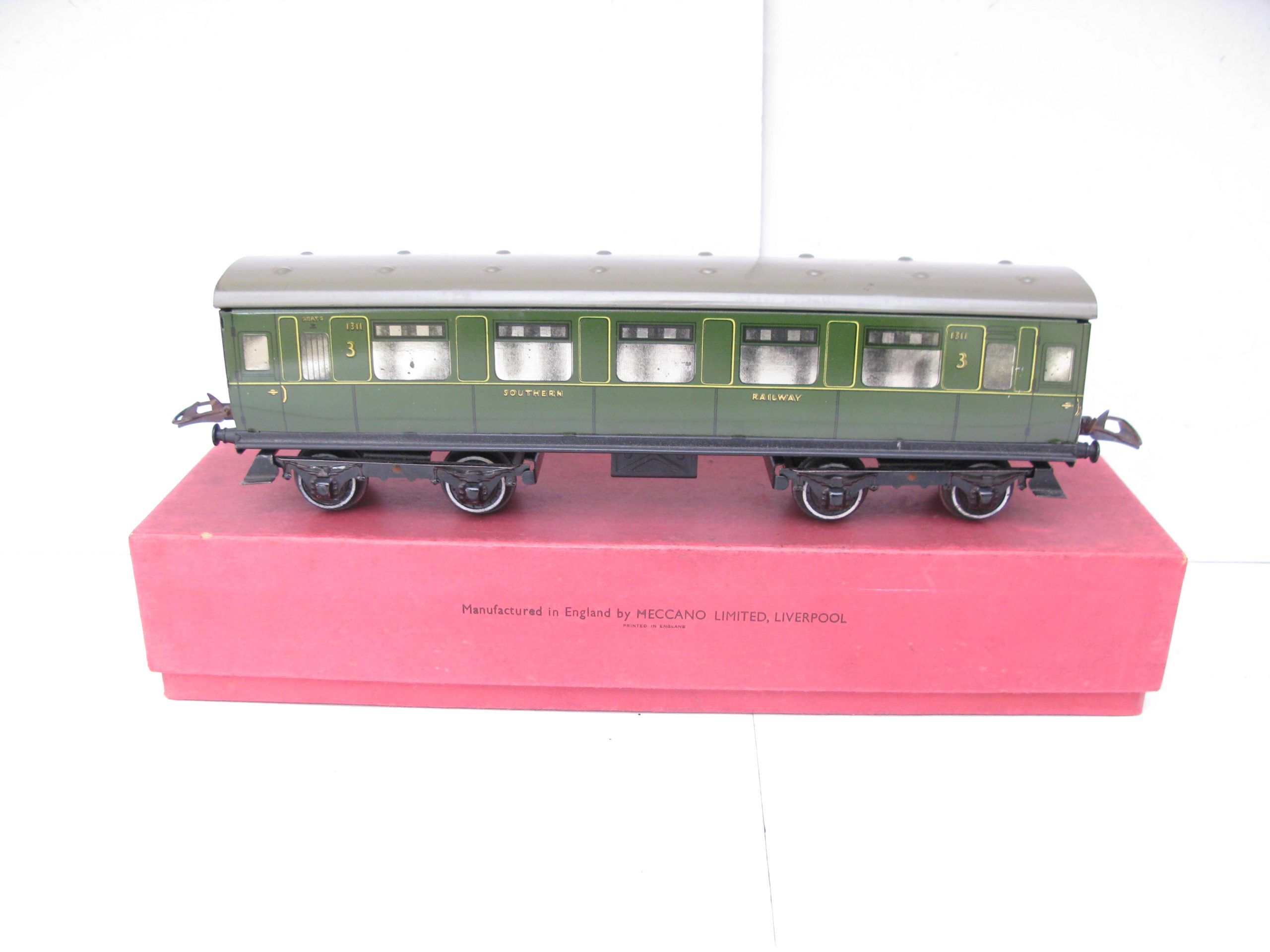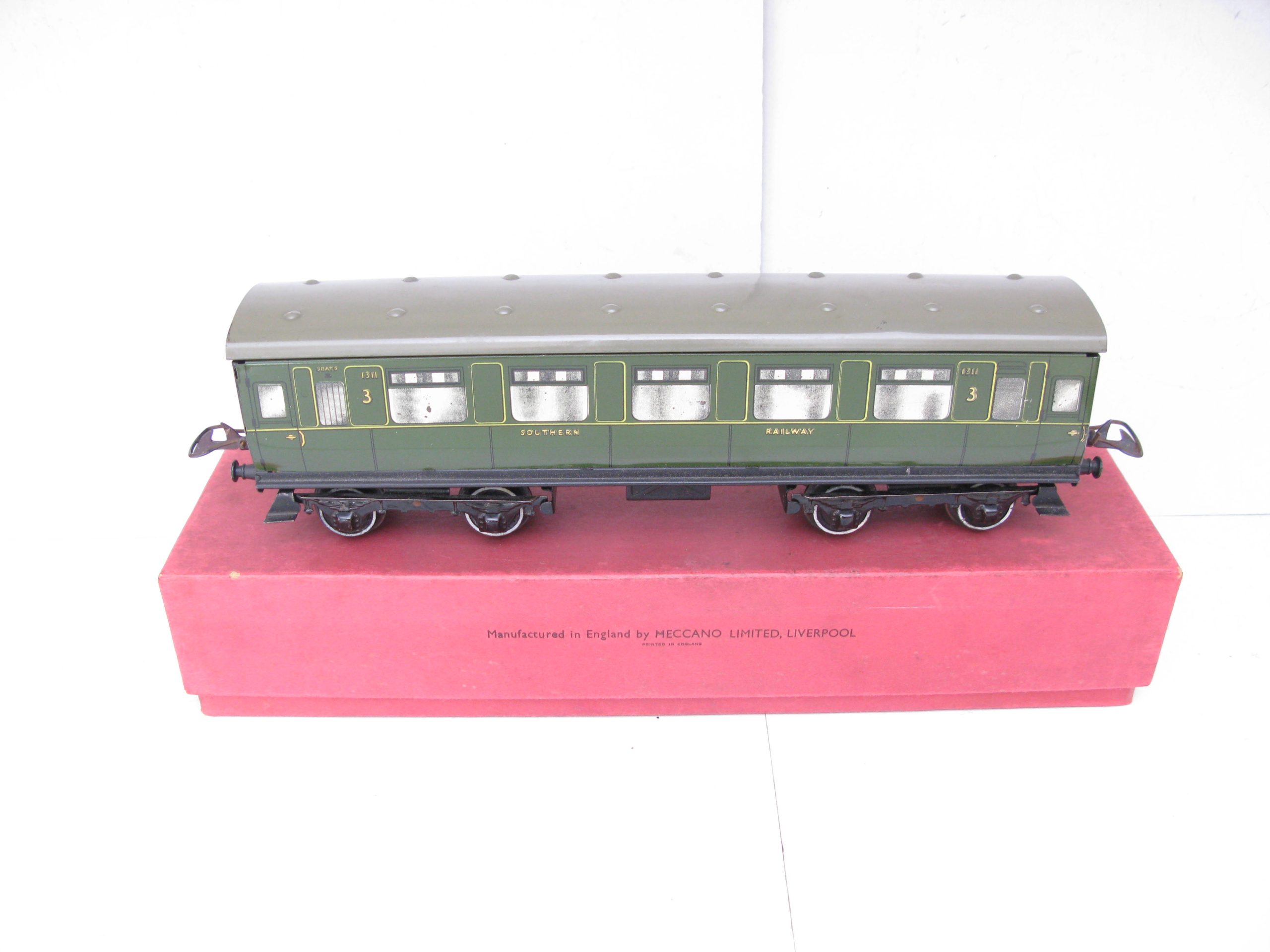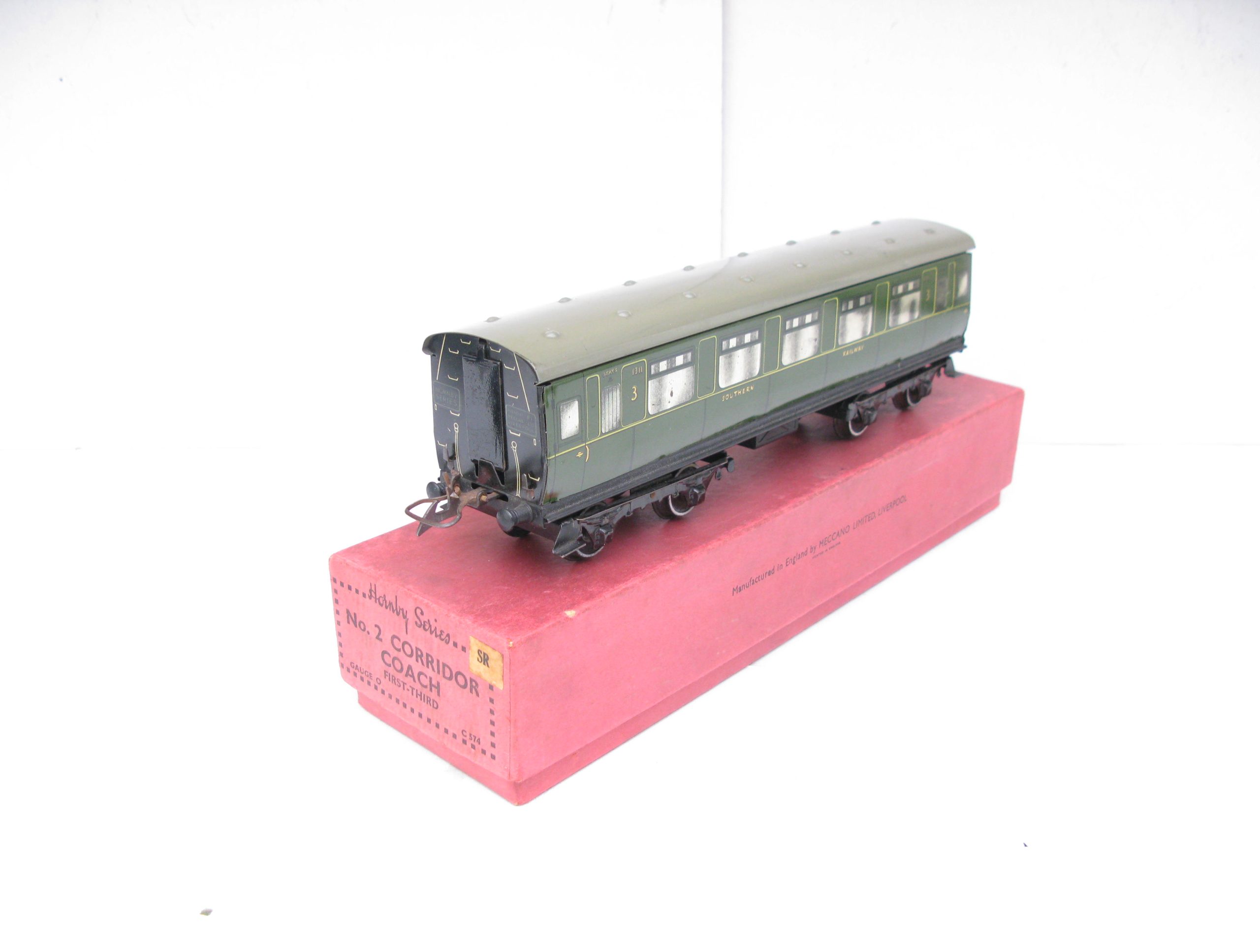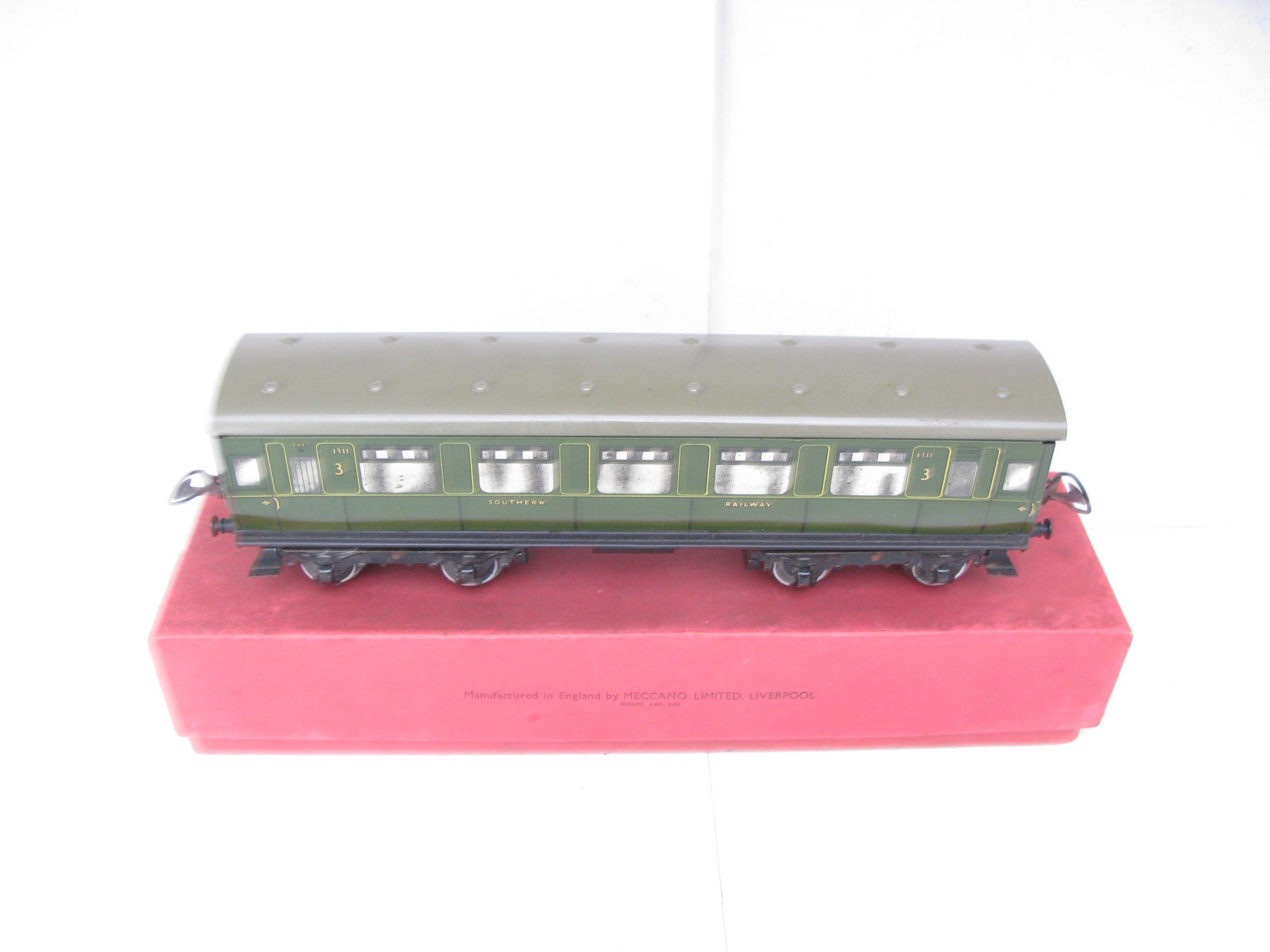 Hornby 0 Gauge No.2 SR All 3rd Corridor Coach – Boxed – Excellent/plus – The No.2 Corridor Coaches were produced from 1937 in all regions this the SR No.2 All 3rd Corridor Coach version dated from 1939 with Matt finish base, sides are Excellent/plus condition with the unusal Grey Passenger coach roof as Factory fitted. Overall Excellent/plus in Excellent box date coded 05/1939