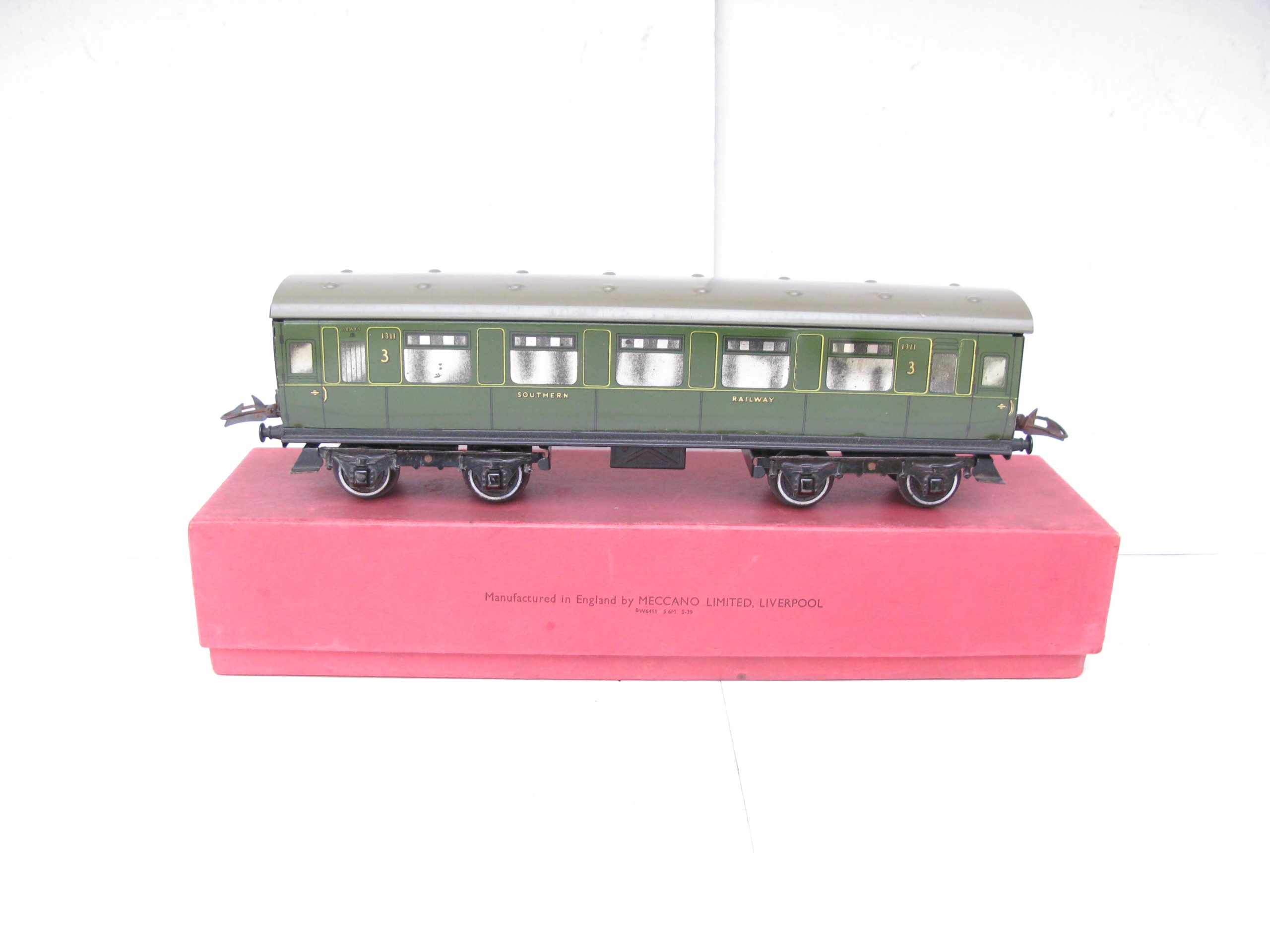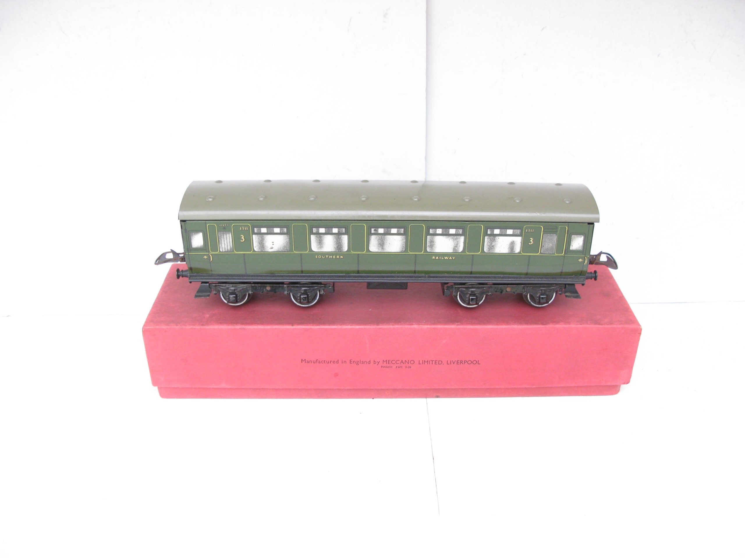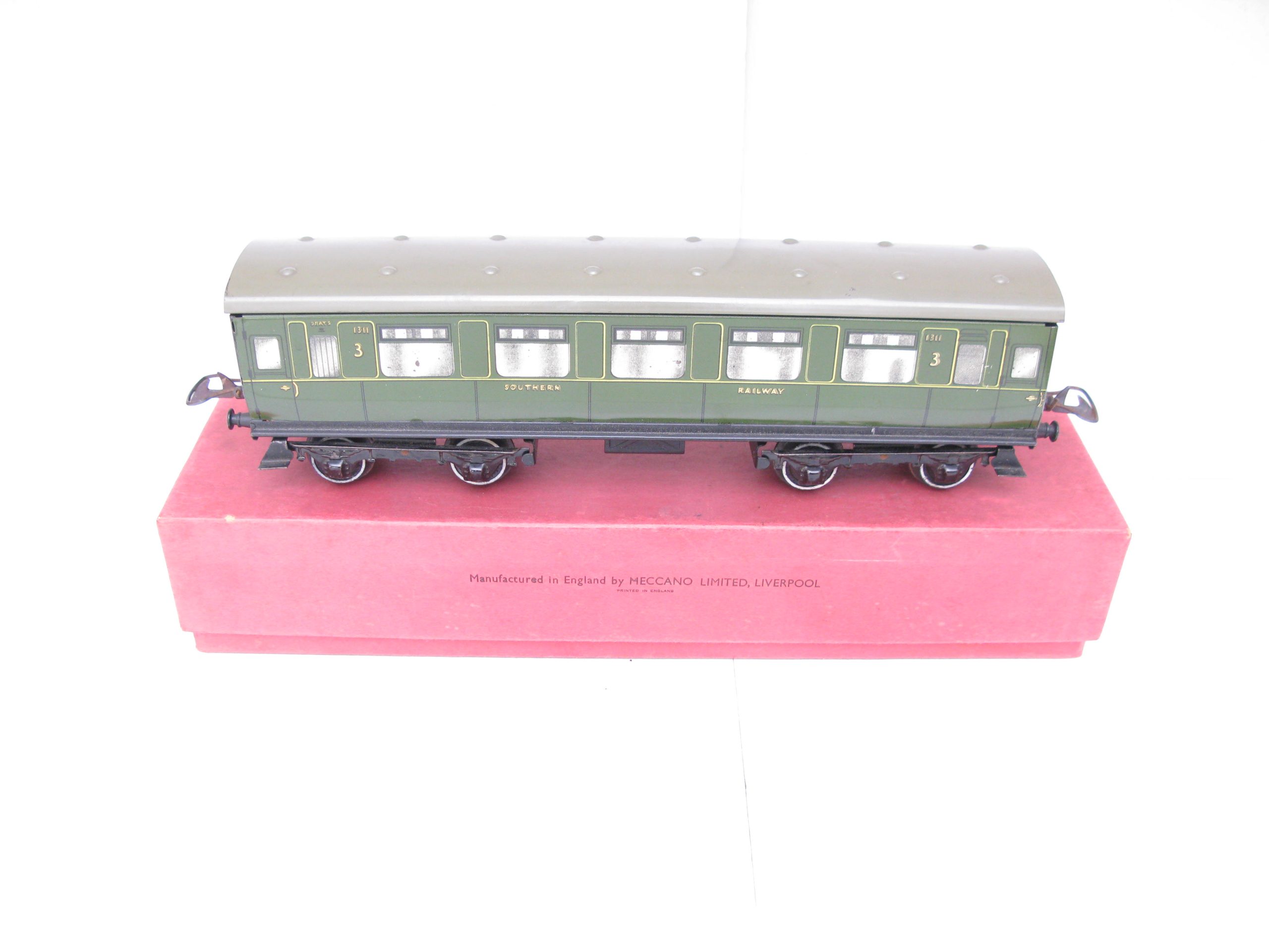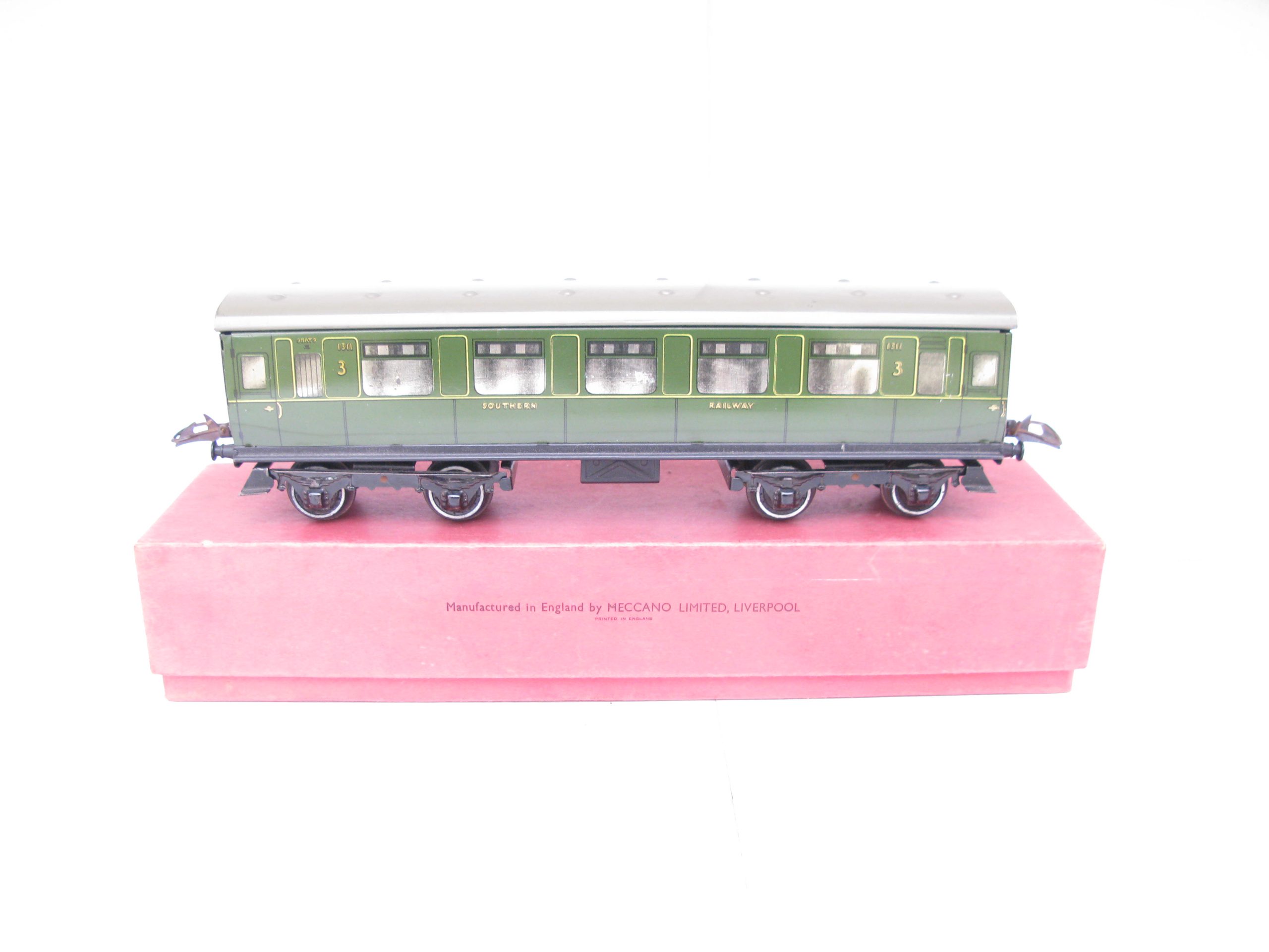 Hornby 0 Gauge No.2 SR All 3rd Corridor Coach – Boxed – Excellent/plus – The No.2 Corridor Coaches were produced from 1937 in all regions this the SR No.2 All 3rd Corridor Coach version dated from 1939 with Matt finish base, sides are Excellent/plus condition with the unusal Grey Passenger coach roof as Factory fitted. Overall Excellent/plus in Excellent box date coded 05/1939