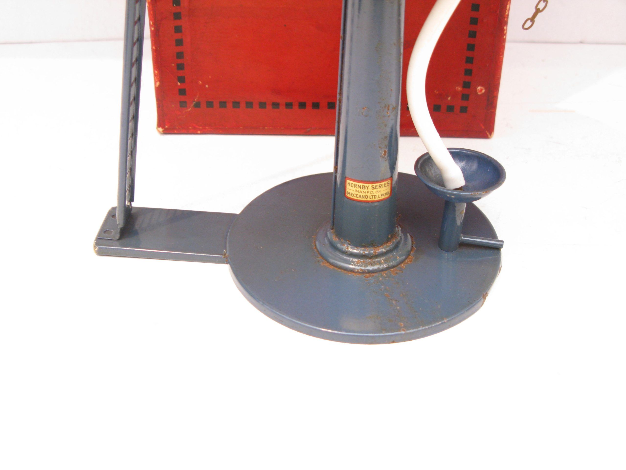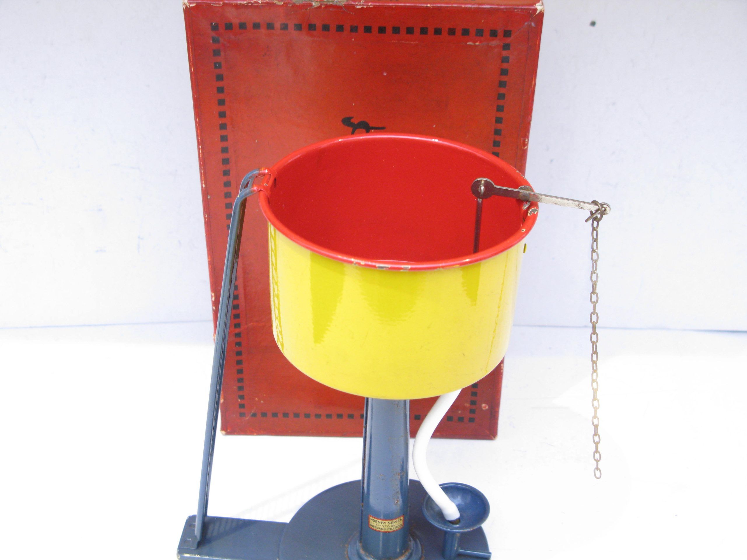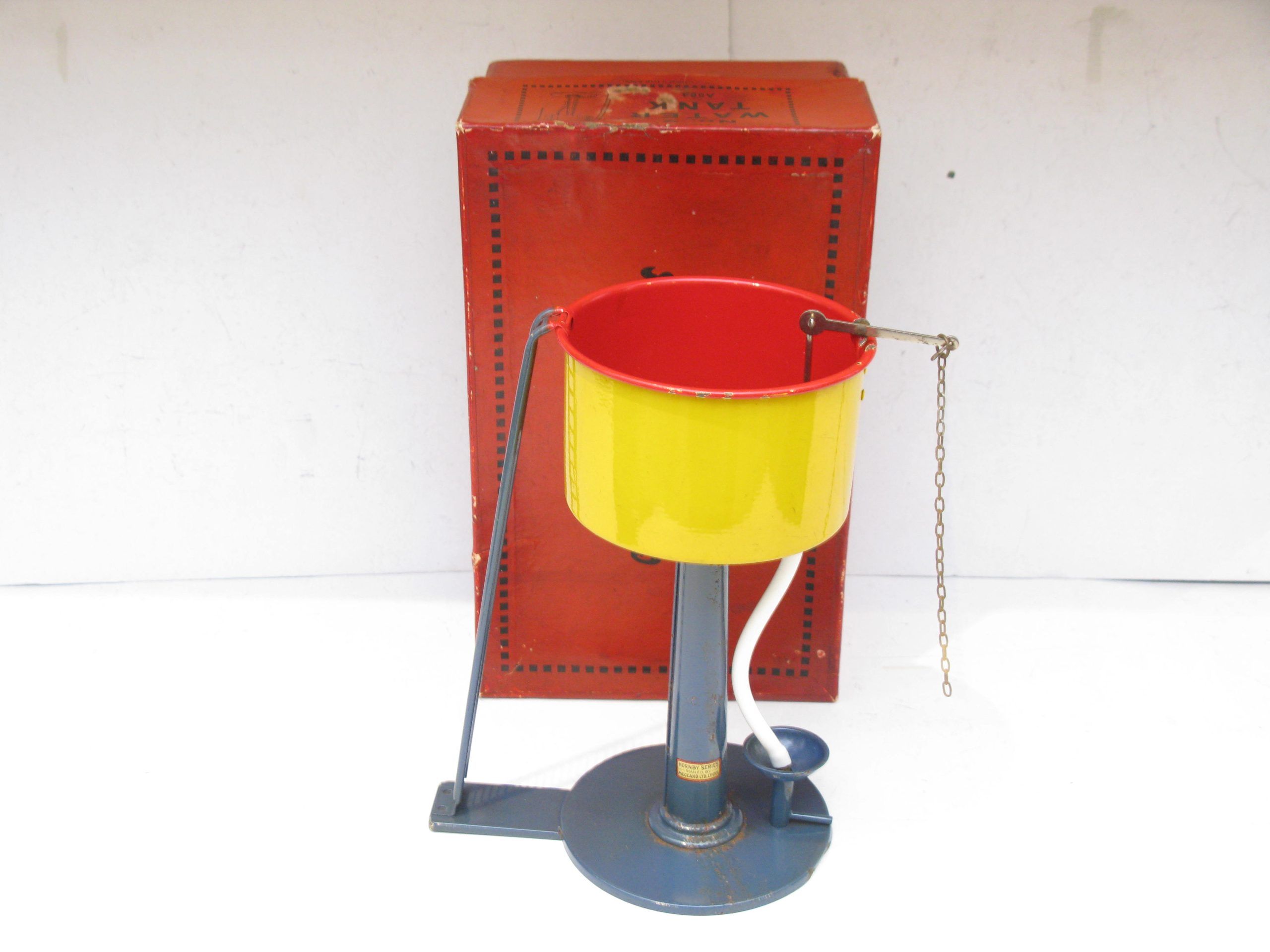 Hornby 0 Gauge No.2 Water Tank Circa 1932/34 – Boxed – From the pre-war range of accessories is this No.2 Water Tank with dark blue base & Column, yellow Tank with red inner.  These Water Tank were first introduced in 1924 unitl production ceased in 1939/40. Hornby produced a No.1 and a No.2 with electric versions of the No.2 available from 1934.  A super Example seldom seen in this near unised condition, Overall Near Mint to Mint in a Good/plus box a great addition to any Hornby 0 Gauge collection.