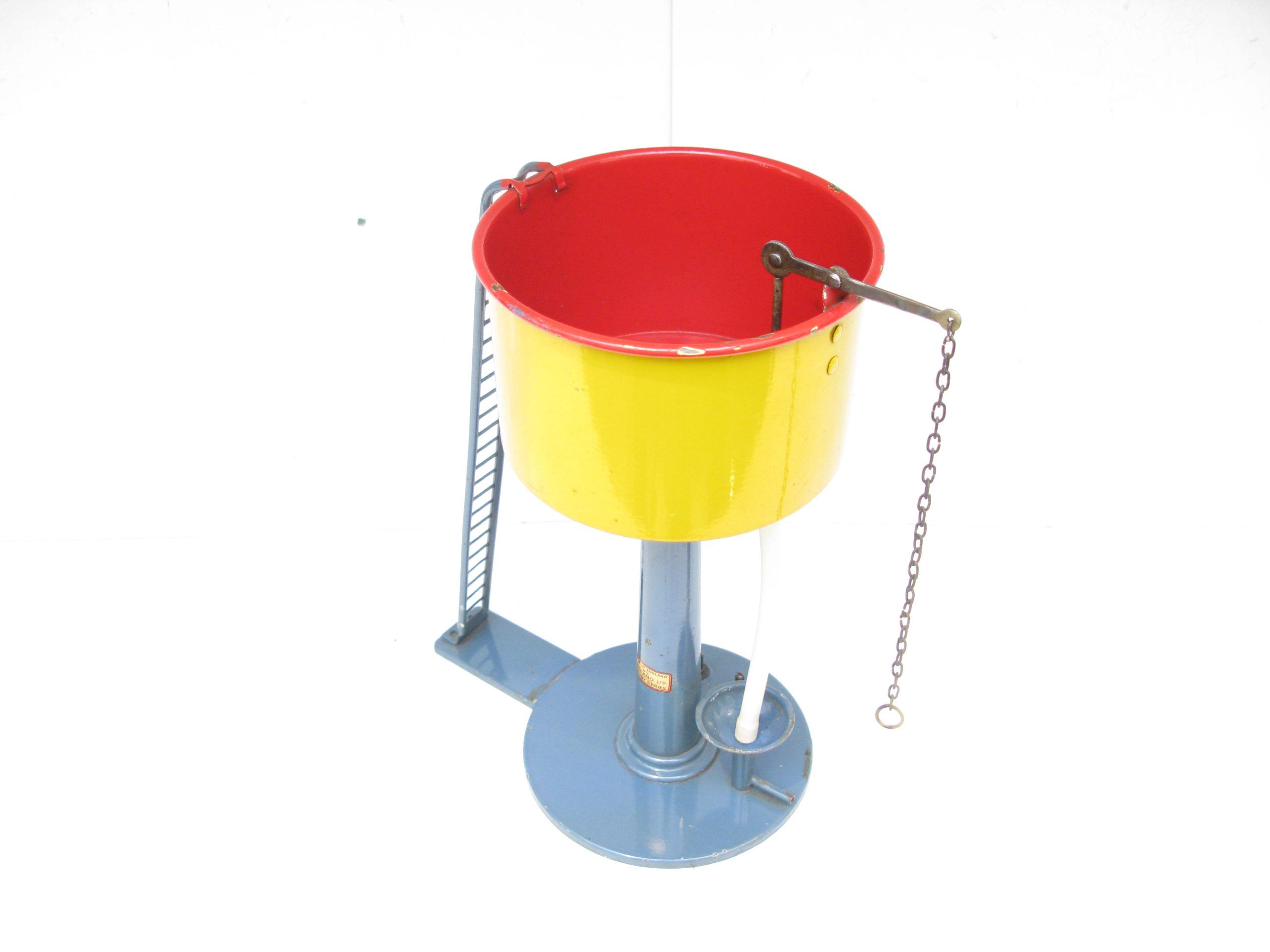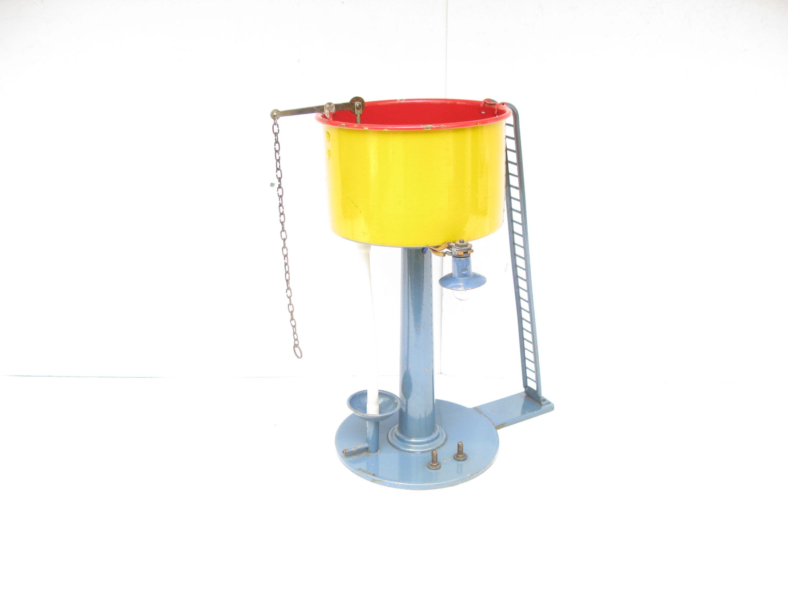Hornby 0 Gauge No.2E Water Tank first issue circa 1932 – unboxed – From the pre-war range of pre-war electric accessories is this hard to find No.2E Water Tank in Dark blue with Yellow outer and red inner Tank. fitted with Plus and socket fittings, These electric Water Tank are very hard to find and early ones even more difficult, overall Excellent a great addition to any Hornby 0 Gauge collection.