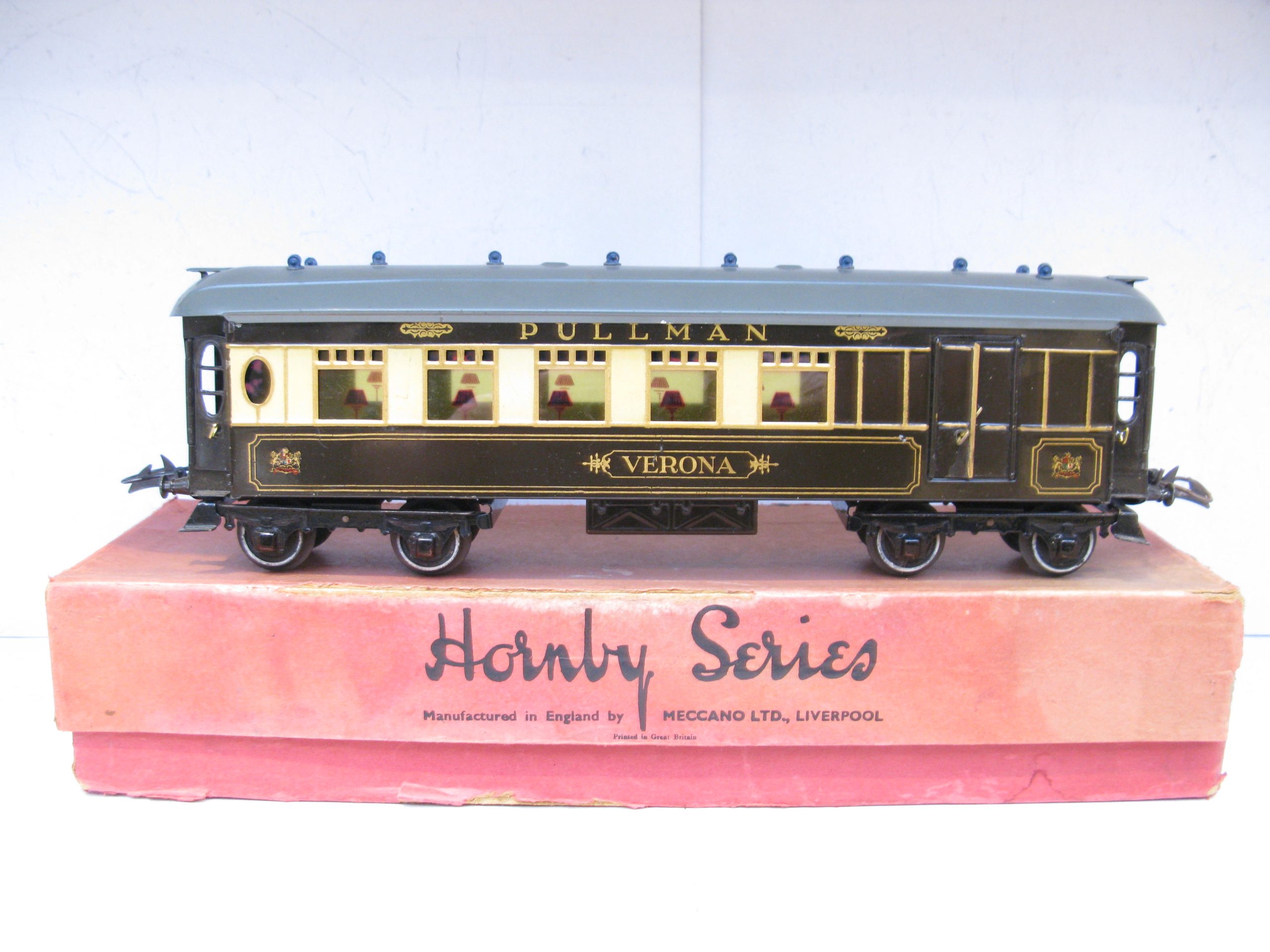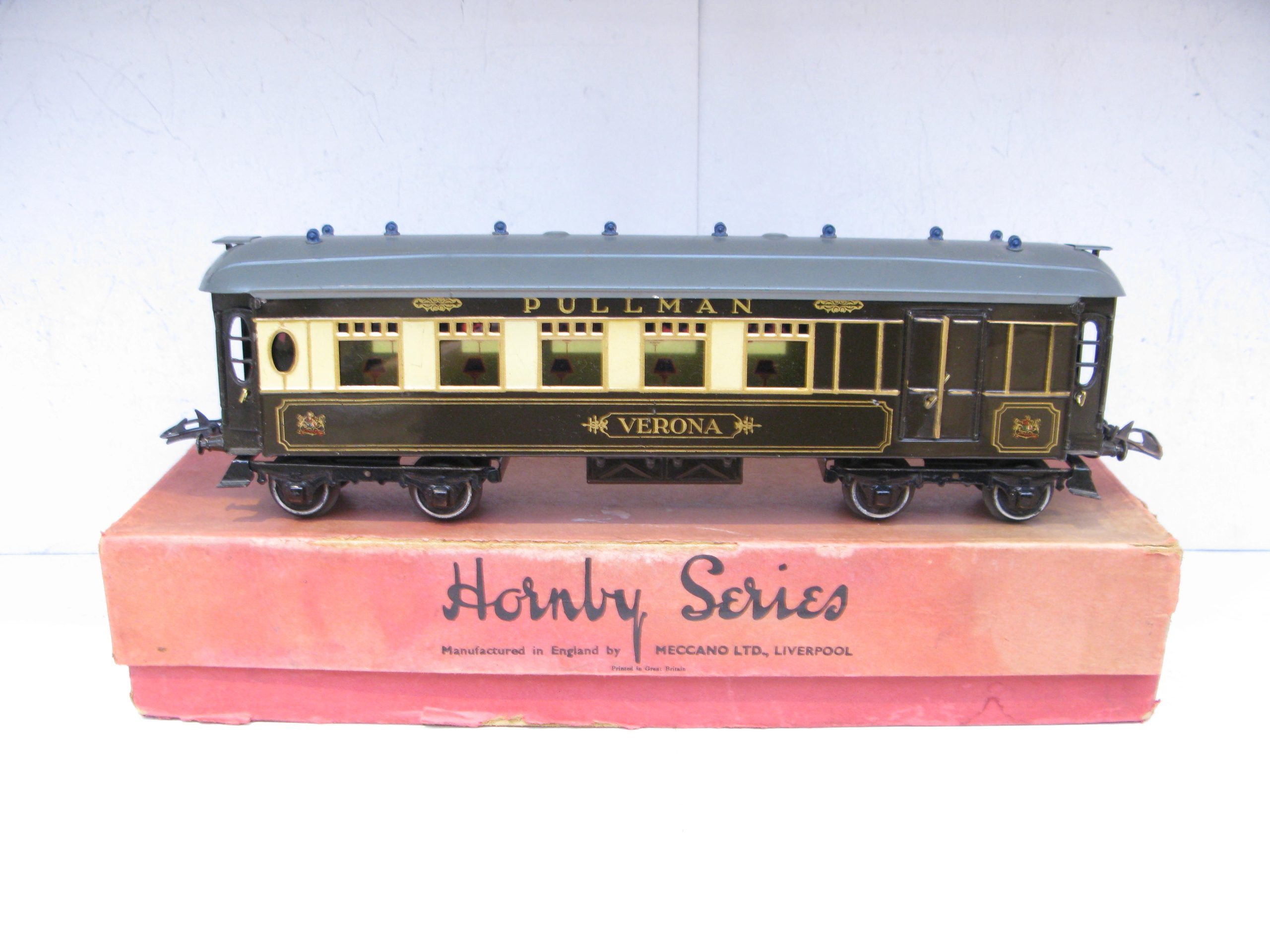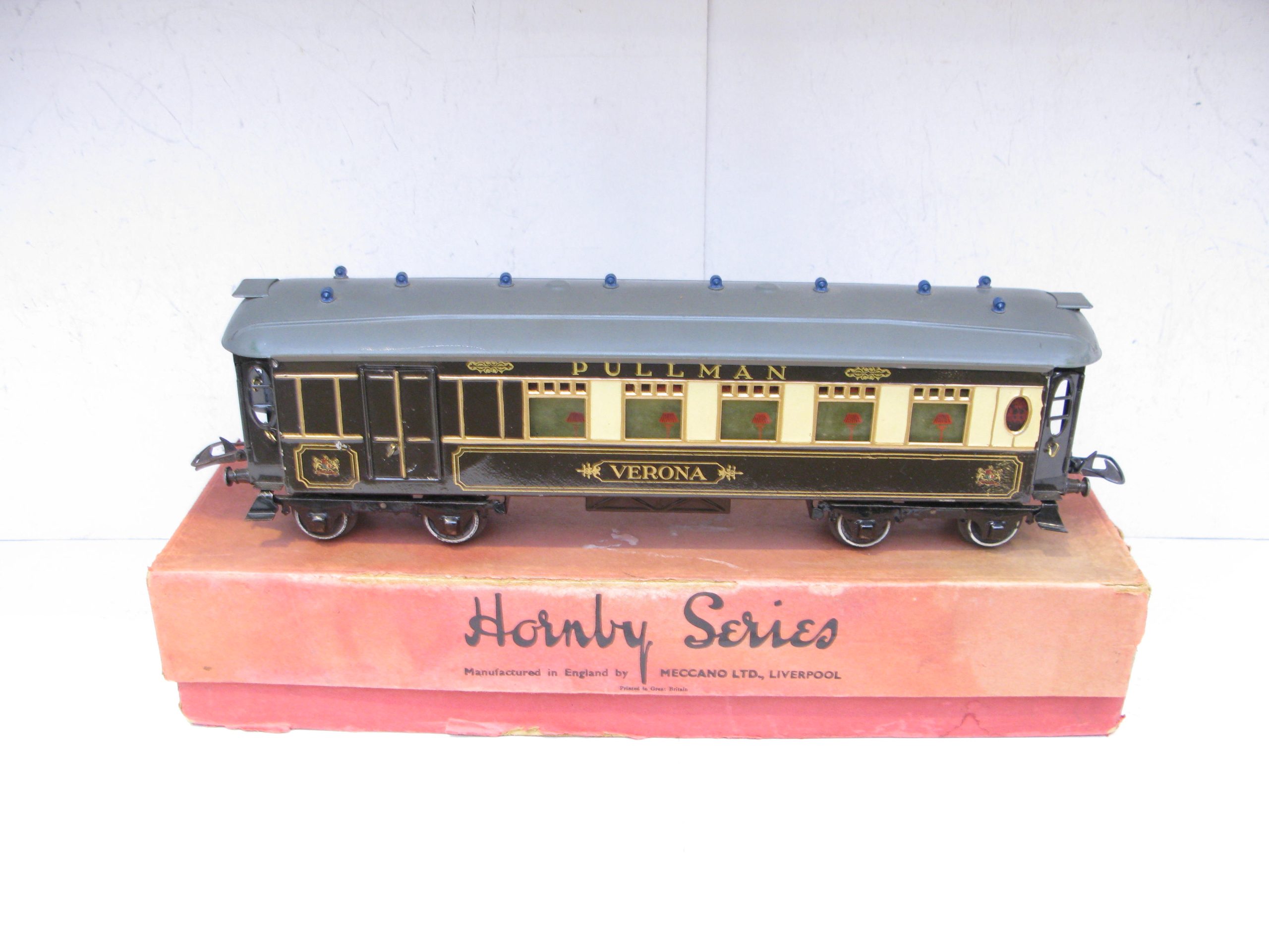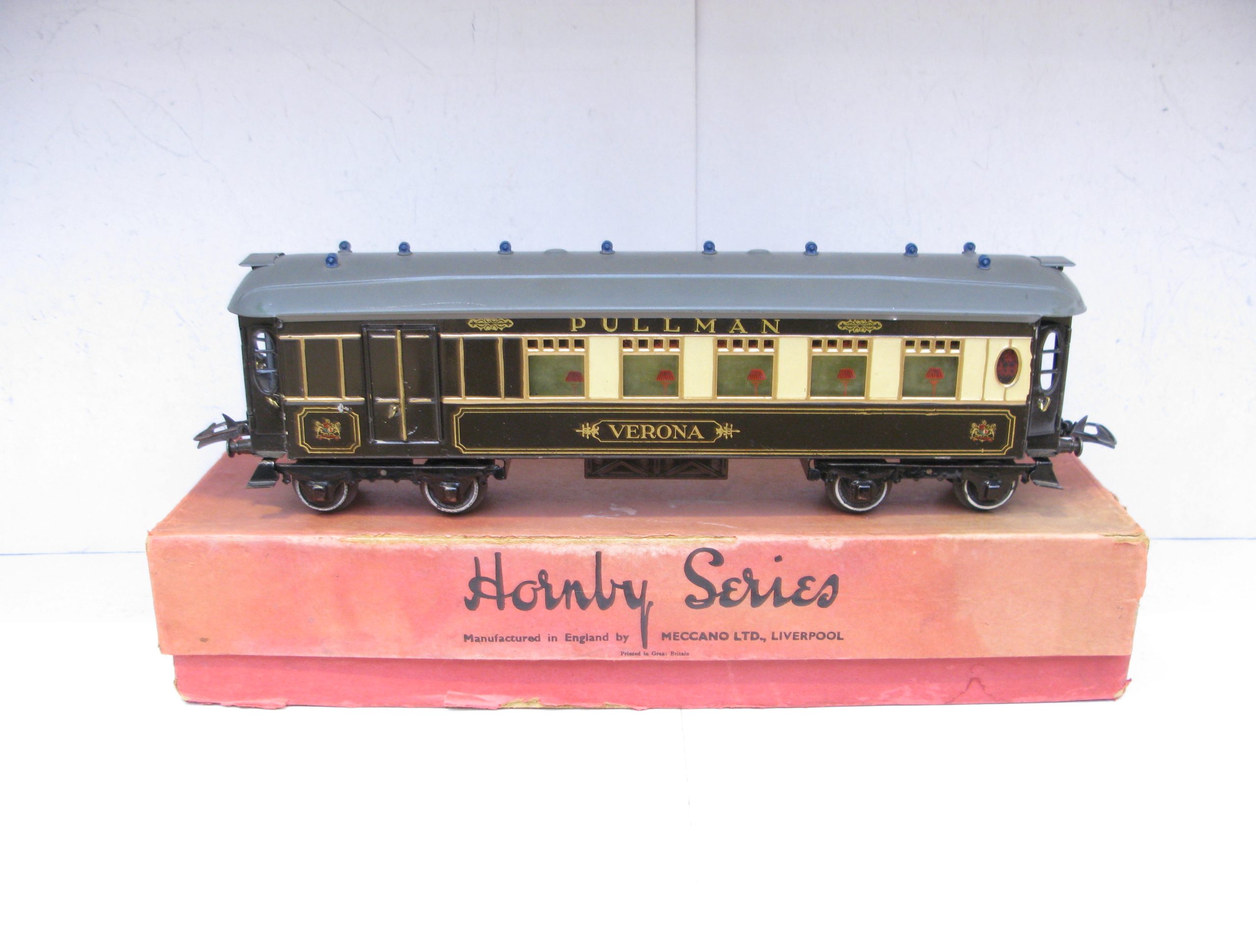 Hornby 0 Gauge No.3 Special Pullman Brake end Coach ‘VERONA’ – Boxed – Hornby 0 Gauge No.3 Special Pullman Brake end Coach ‘VERONA’ the last of these named Brake end coaches prior to WW2. From the Range of Special Pullman coaches produced by Hornby were 4 different coaches and 4 different Brake end coaches, this is ‘VERONA’, sides and roof are Excellent to Excellent/plus in a Poor box. A great addition to your Hornby Pullman Train