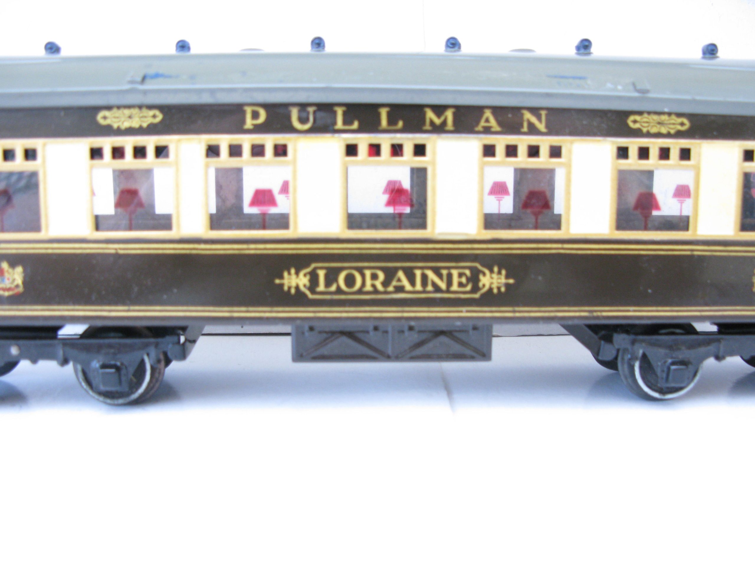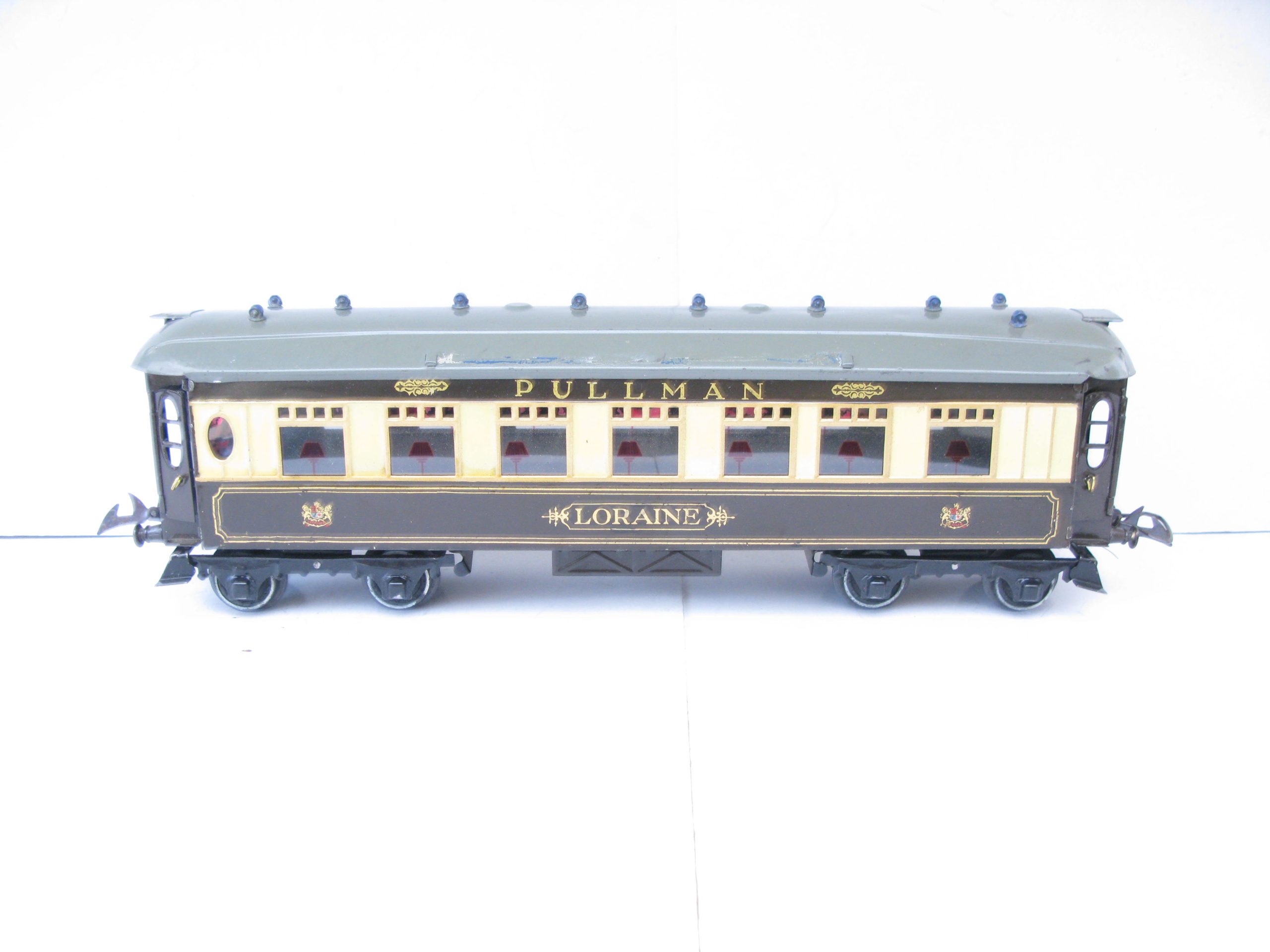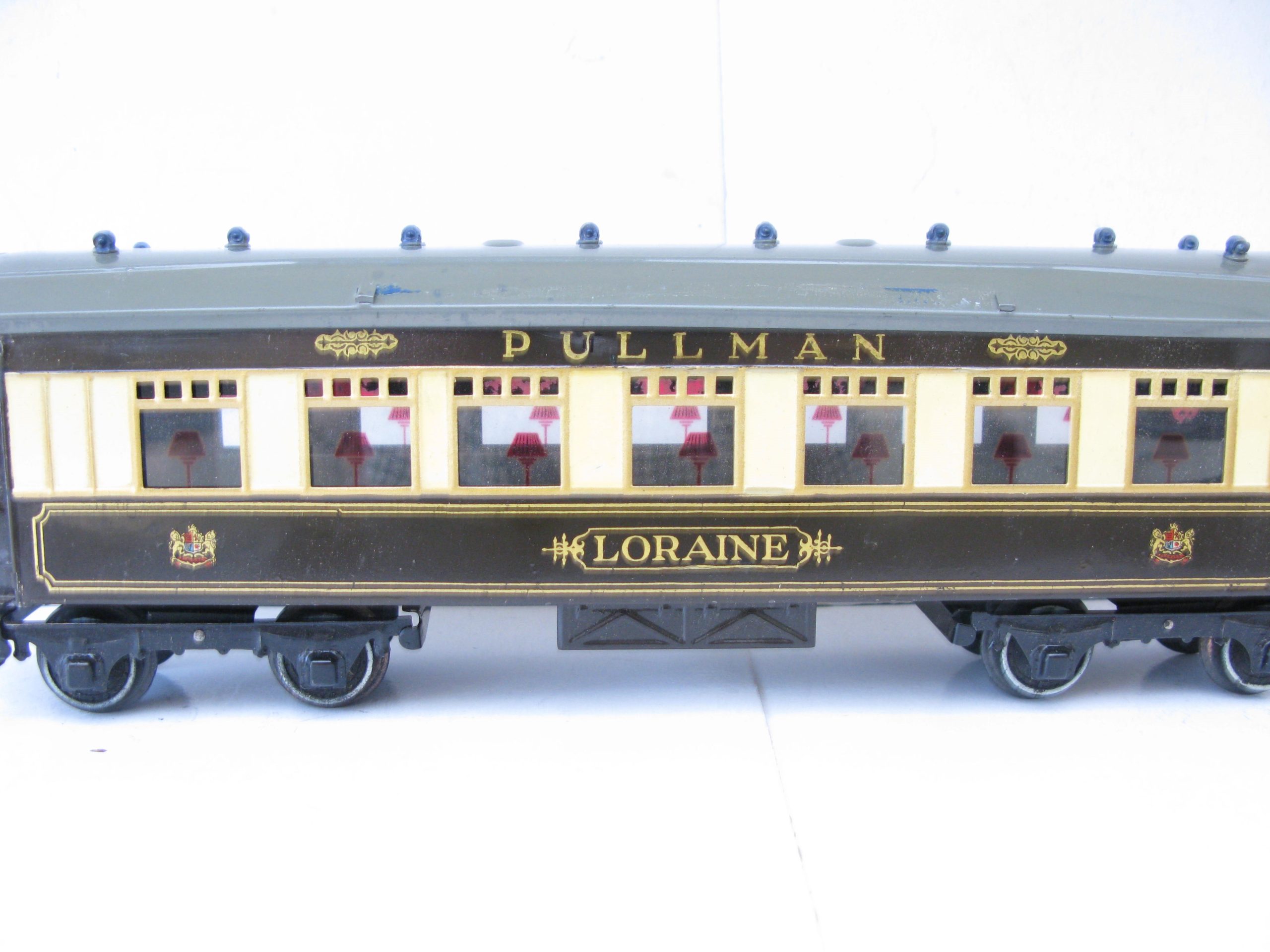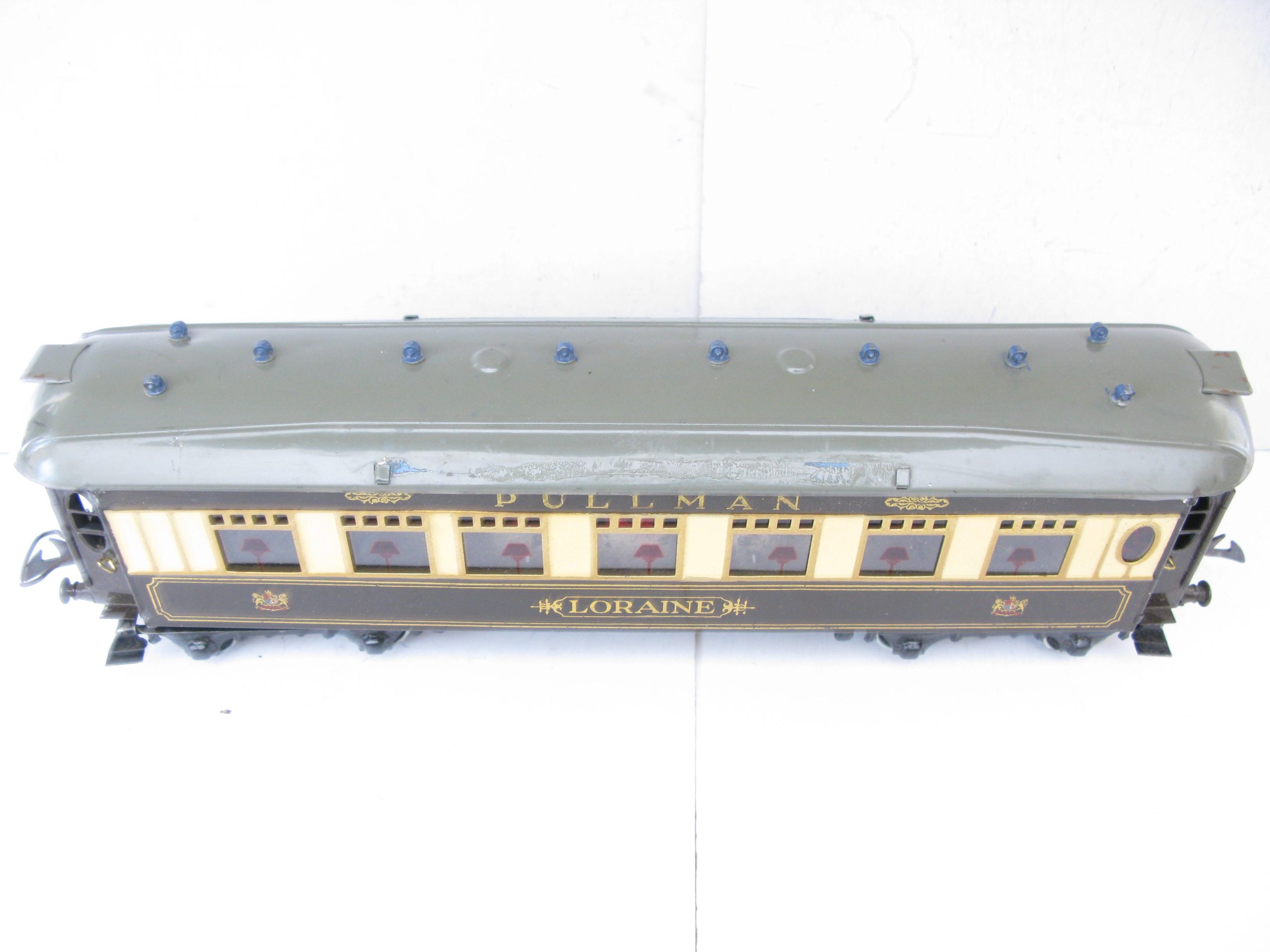 Hornby 0 Gauge No.3 Special Pullman Coach ‘LORAINE’ – unboxed – Hornby 0 Gauge No.3 Special Pullman Coach ‘LORAINE’.  From the Range of No.3 Special Pullman coaches produced by Hornby were 4 different coaches and 4 different Brake end coaches, this is the last issued name ‘LORAINE’ produced from 1937, sides and roof are Excellent, roof has ‘The Scarborough Flier’ Coach boards which show signs of glue residue to the underside of the boards. A great addition to your Hornby Pullman Train