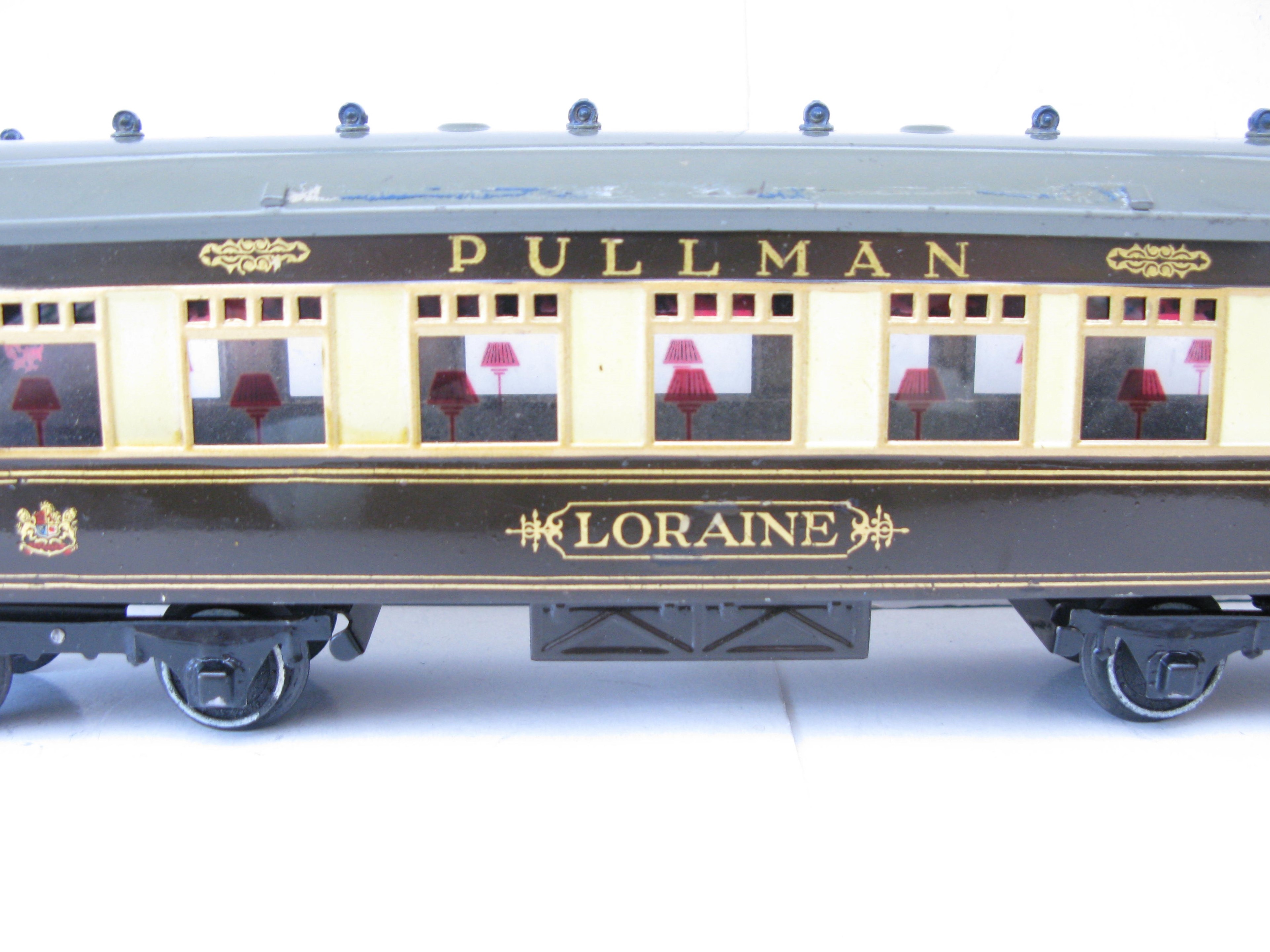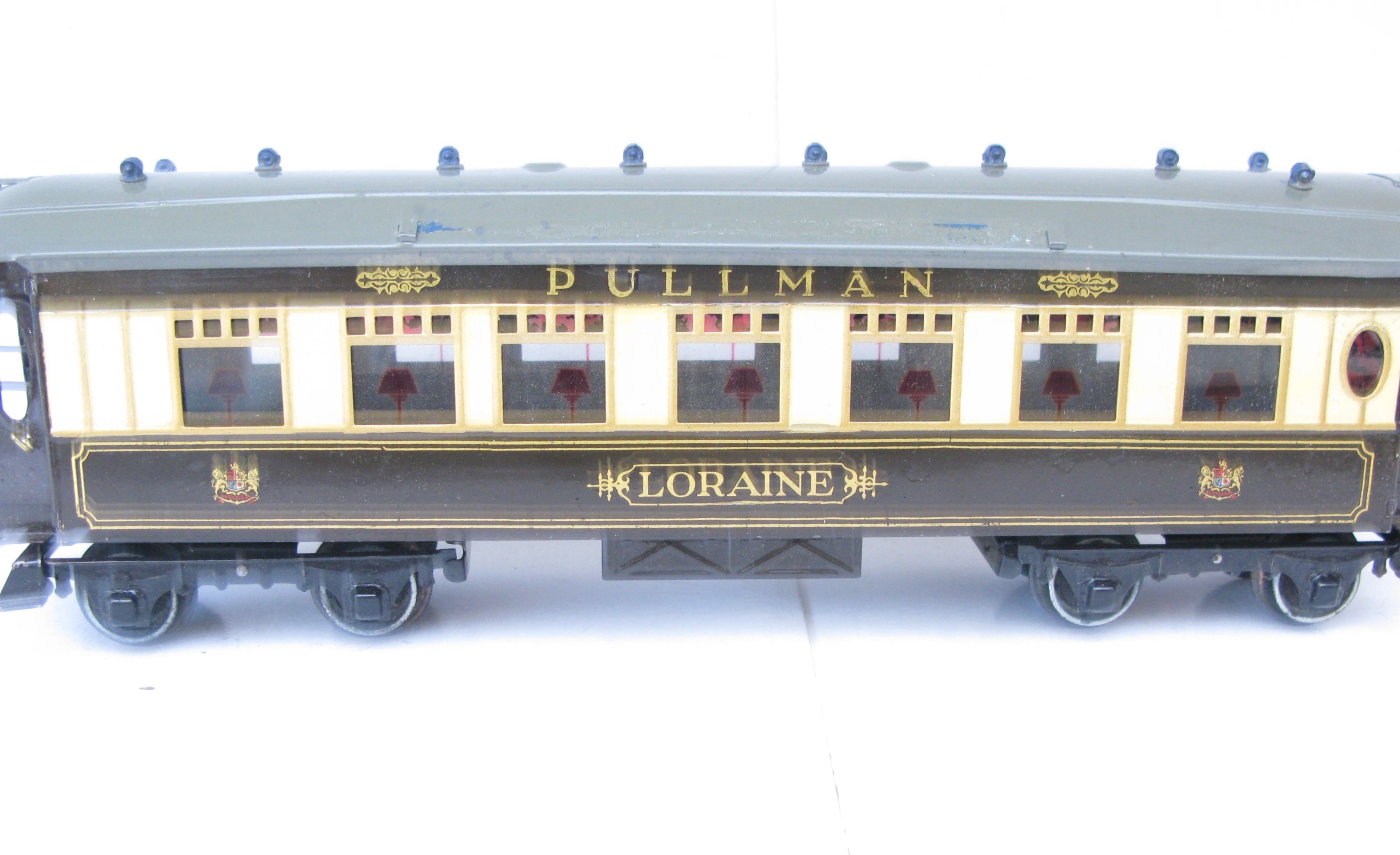 Hornby 0 Gauge No.3 Special Pullman Coach ‘LORAINE’ – unboxed – Hornby 0 Gauge No.3 Special Pullman Coach ‘LORAINE’. From the Range of No.3 Special Pullman coaches produced by Hornby were 4 different coaches and 4 different Brake end coaches, this is the last issued name ‘LORAINE’ produced from 1937, sides and roof are Excellent, roof has ‘The Scarborough Flier’ Coach boards which show signs of glue residue to the underside of the boards. A great addition to your Hornby Pullman Train