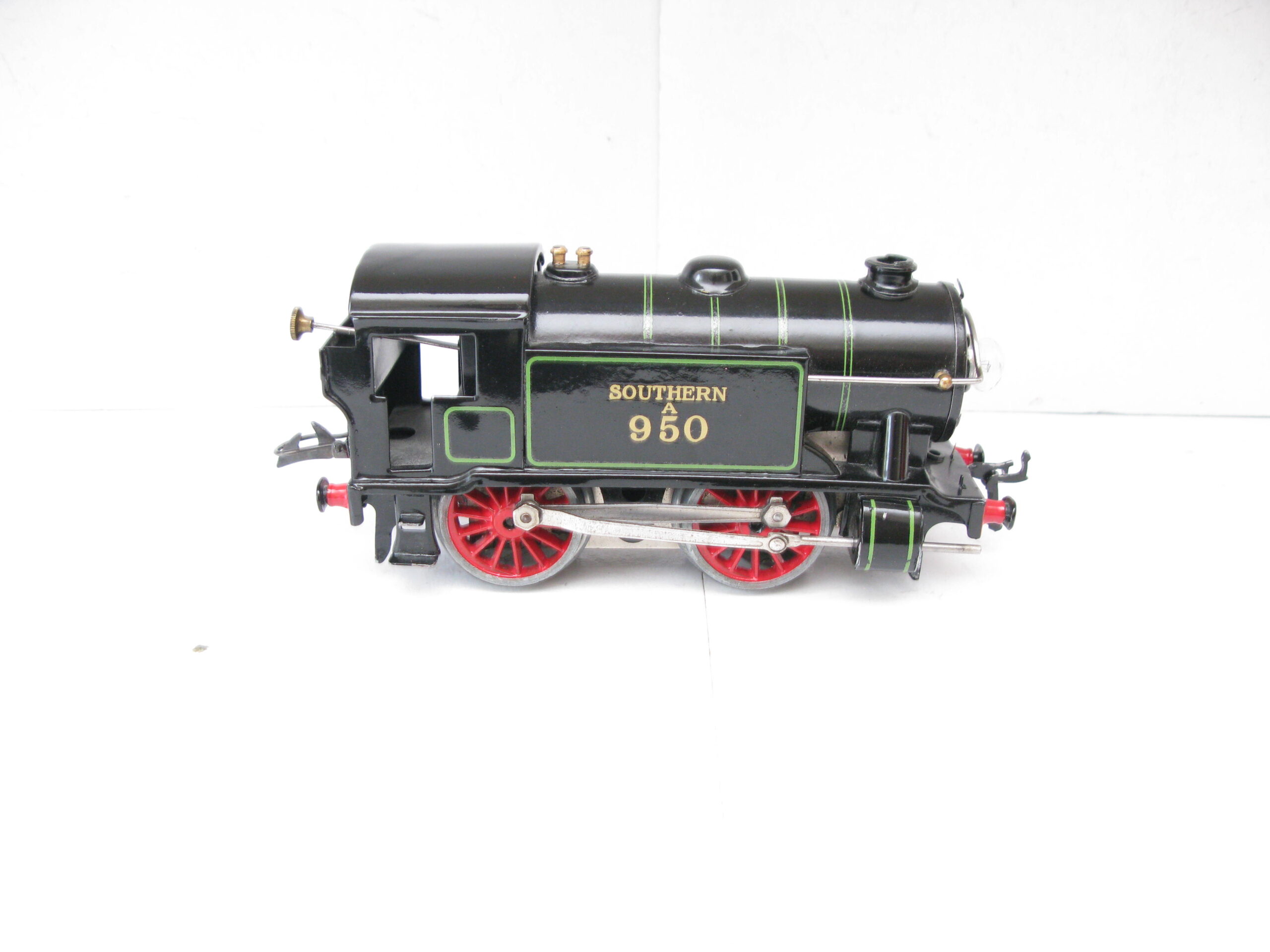 Hornby 0 Gauge No.E120 Special Tank Loco SR Lined Black No.A950, 3-rail electric – in red box – From the range of No.1 Special Tank Locos Launched in 1929 is this E120 SR version in lined black and number A950. The loco has been professionally repainted lined and Transferred. These black electric loco’s are near impossible to find in any condition this one has been professionally finish as you are unlikely to find an original one, black loco were special order only after 1935. a great opportunity to add this to your collection, super runner and comes in a Red No.1 Special Tank loco box.