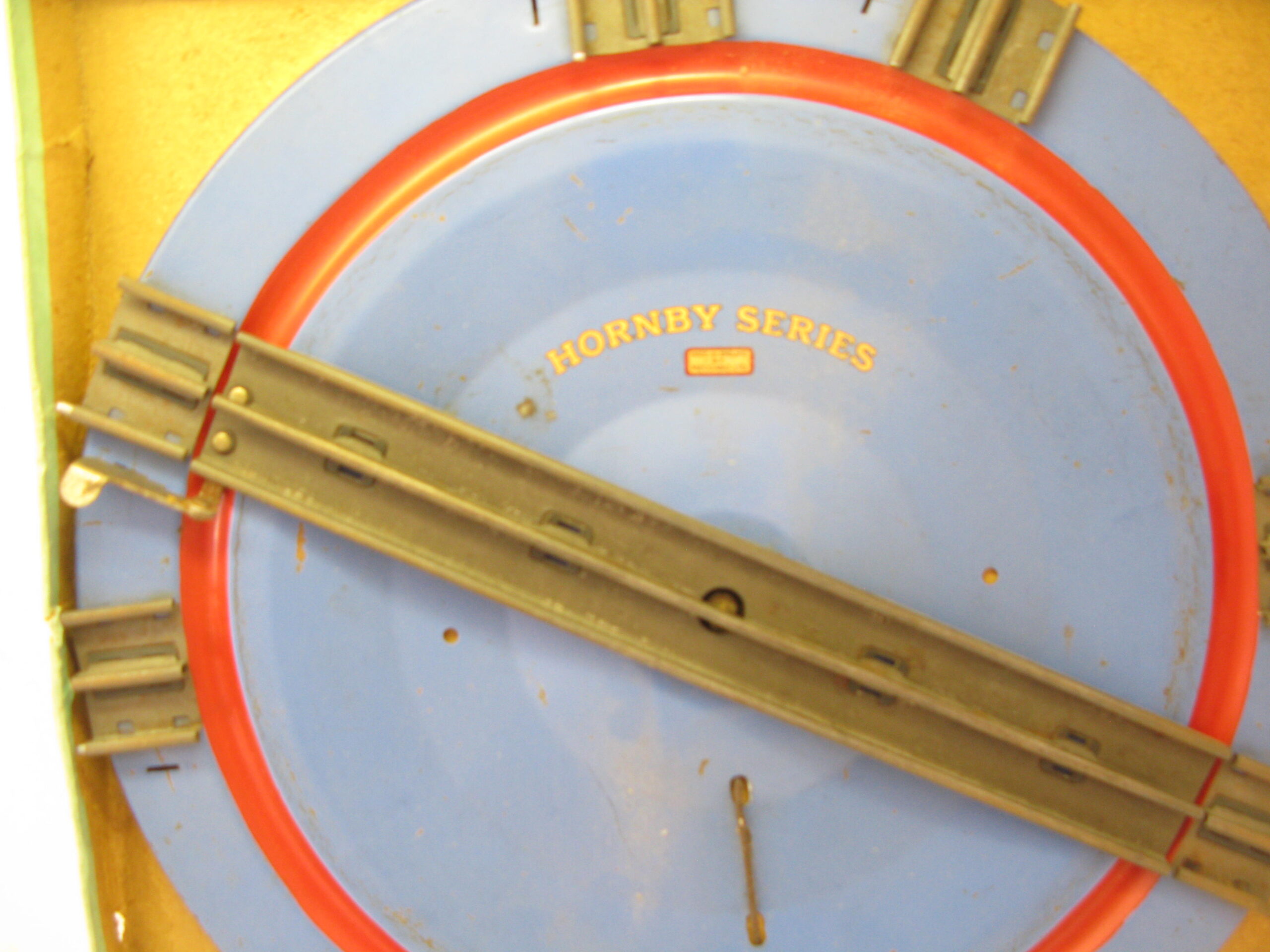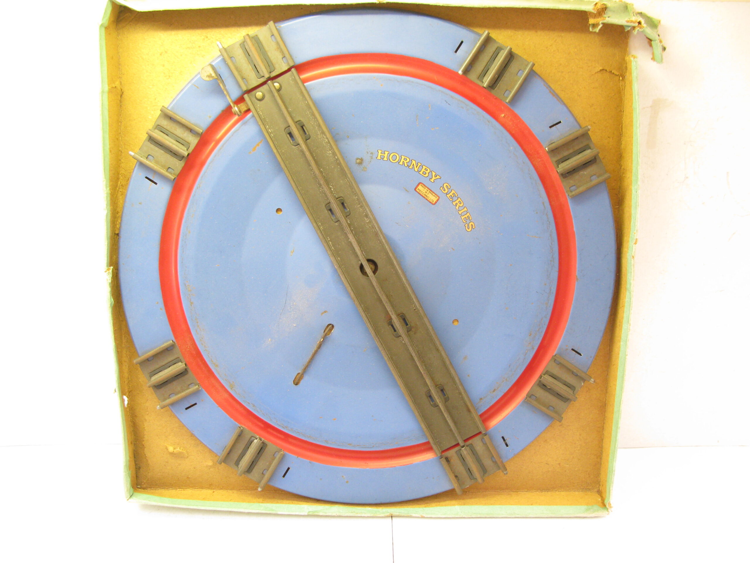 Hornby 0 Gauge Tinplate 3-rail electric Turntable – Boxed – Here in the range of track produced by Hornby in the 1930’s is this 3-rail electric Turntable in blue with red band, would benefit from a light clean otherwise generally Good/plus in a Fair Water stained box