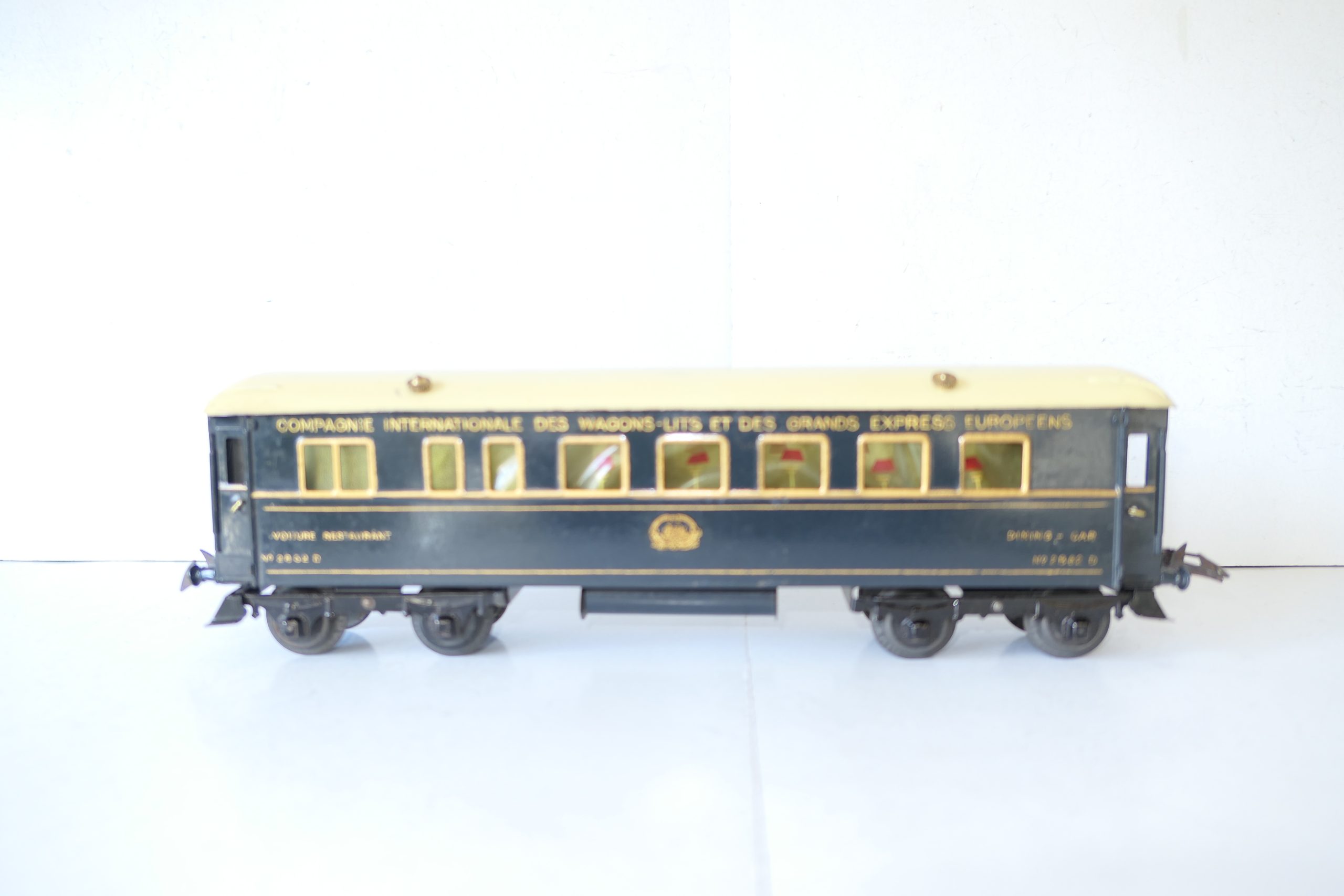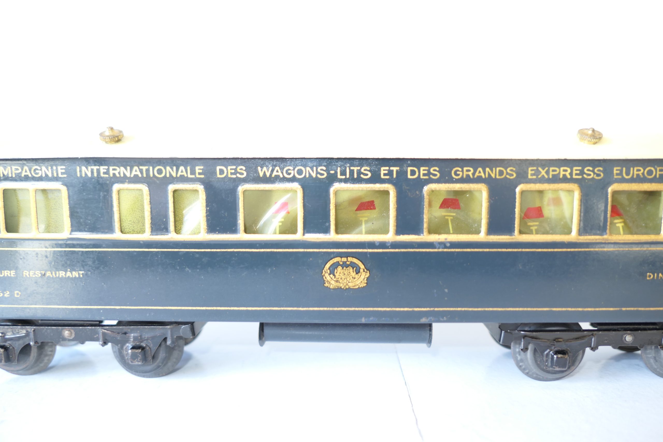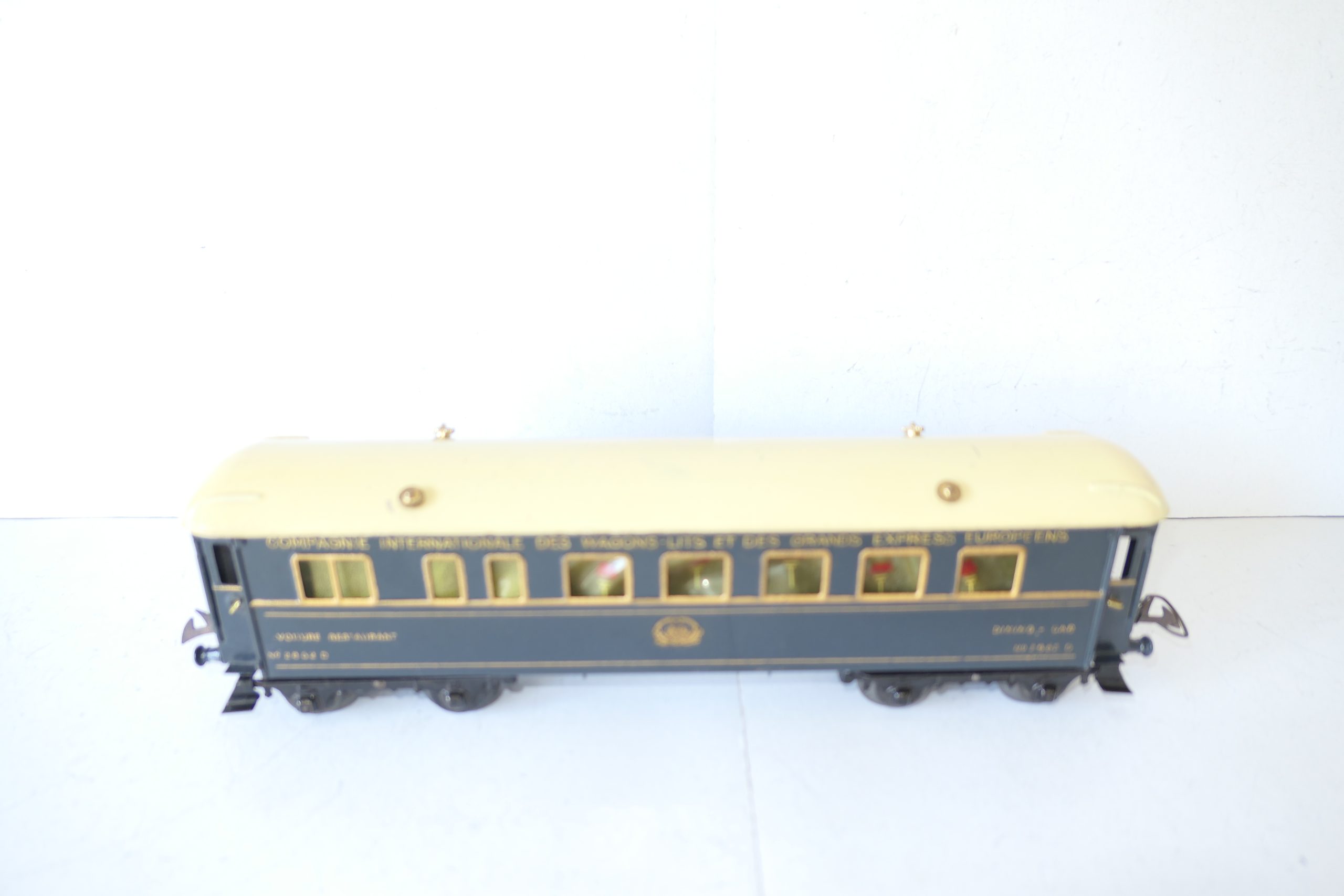 Hornby 0 Gauge Wagon-Lits Grand European Express all Blue Dining Car – unboxed – Excellent  – Here we have one of a pair Wagon-Lits Grand European Express Passenger cars this is the all Blue Dining car. All blue car with gold lettering and lining and fitted with tin wheels, sides are Excellent, roof is Good/plus, unboxed. We have a pair the other being the sleeping Car, so have a look they make a nice train.