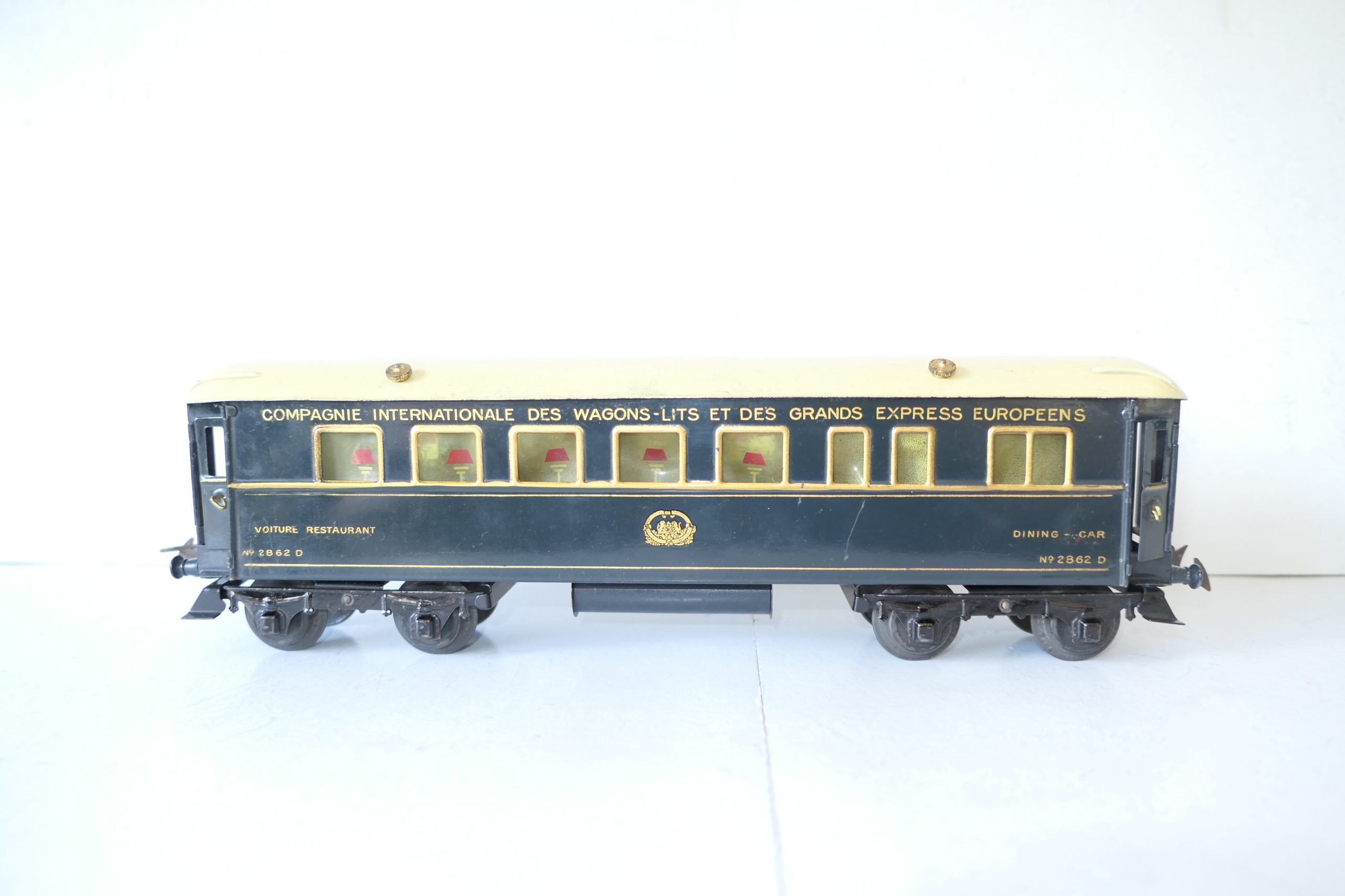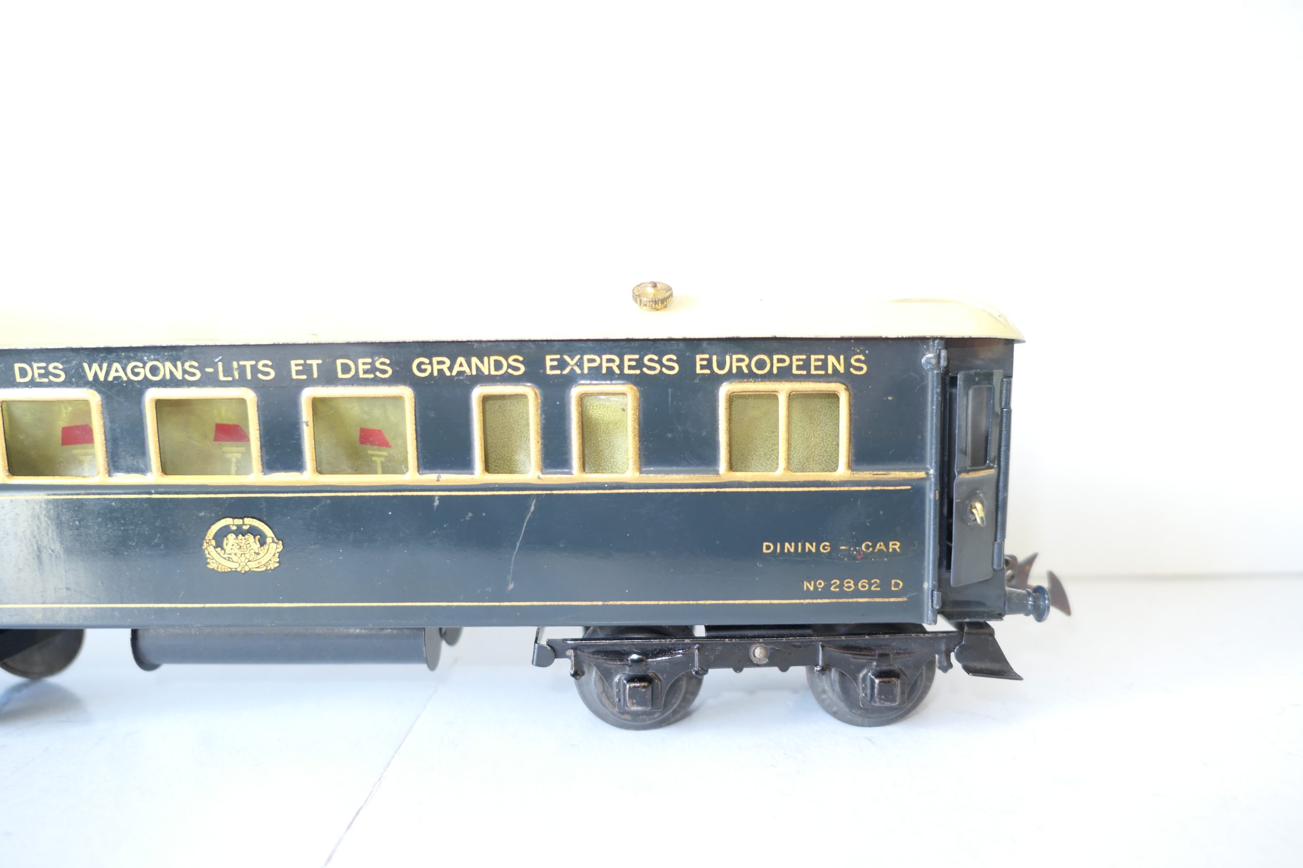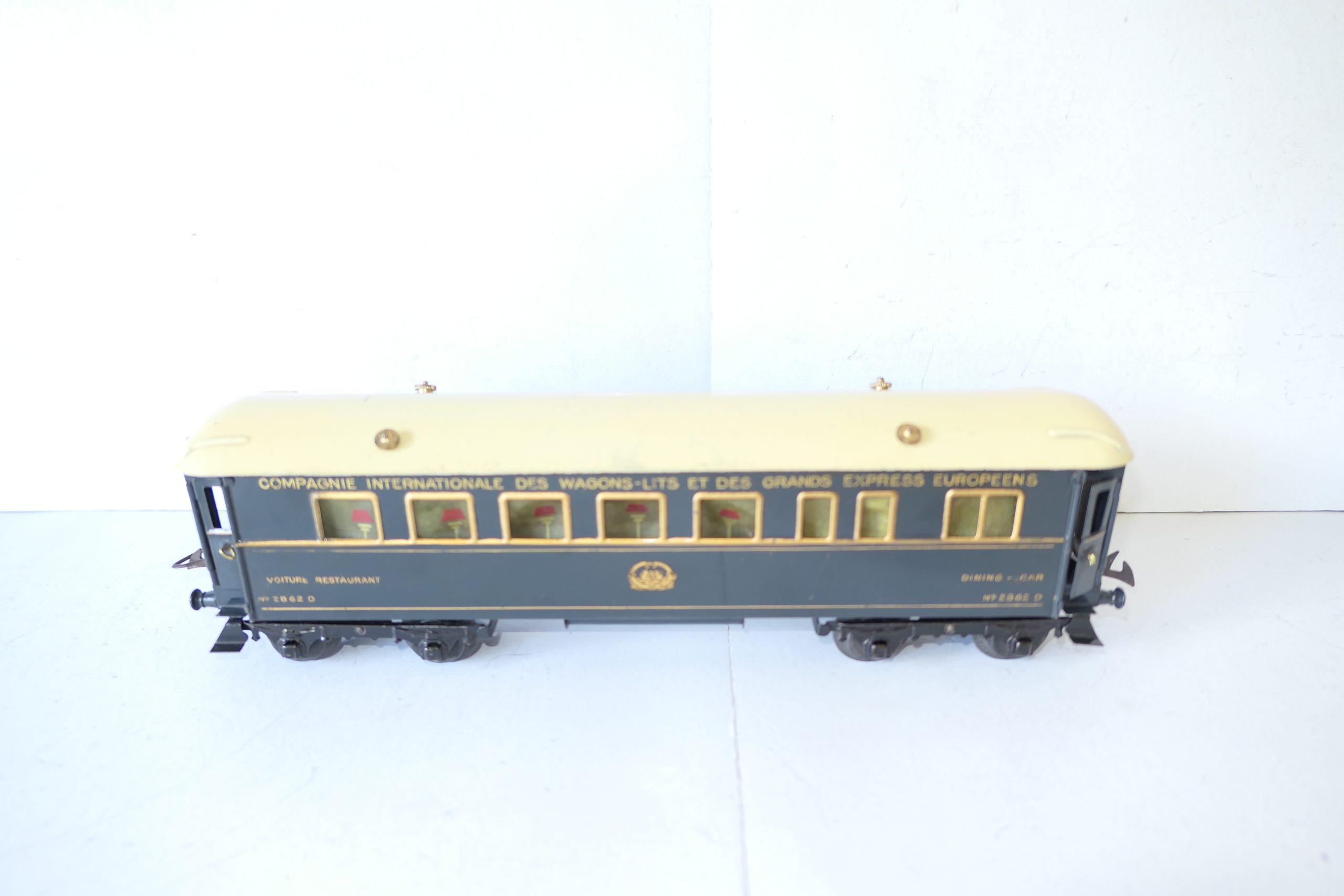 Hornby 0 Gauge Wagon-Lits Grand European Express all Blue Dining Car – unboxed – Excellent  – Here we have one of a pair Wagon-Lits Grand European Express Passenger cars this is the all Blue Dining car. All blue car with gold lettering and lining and fitted with tin wheels, sides are Excellent, roof is Good/plus, unboxed. We have a pair the other being the sleeping Car, so have a look they make a nice train.