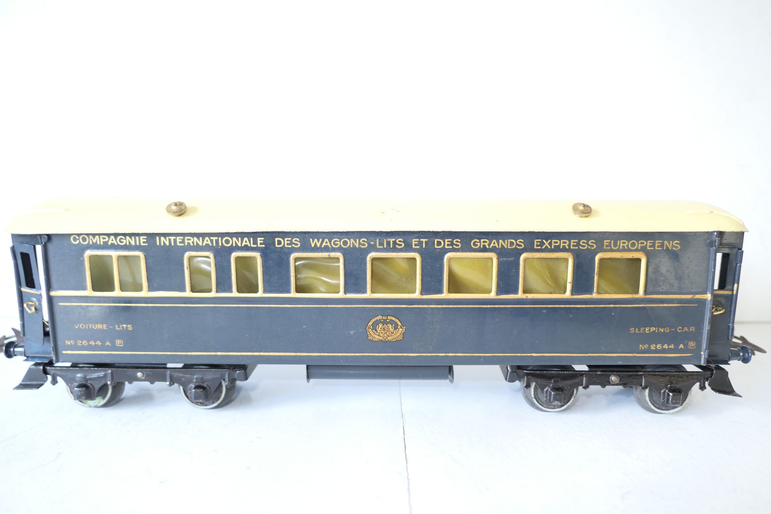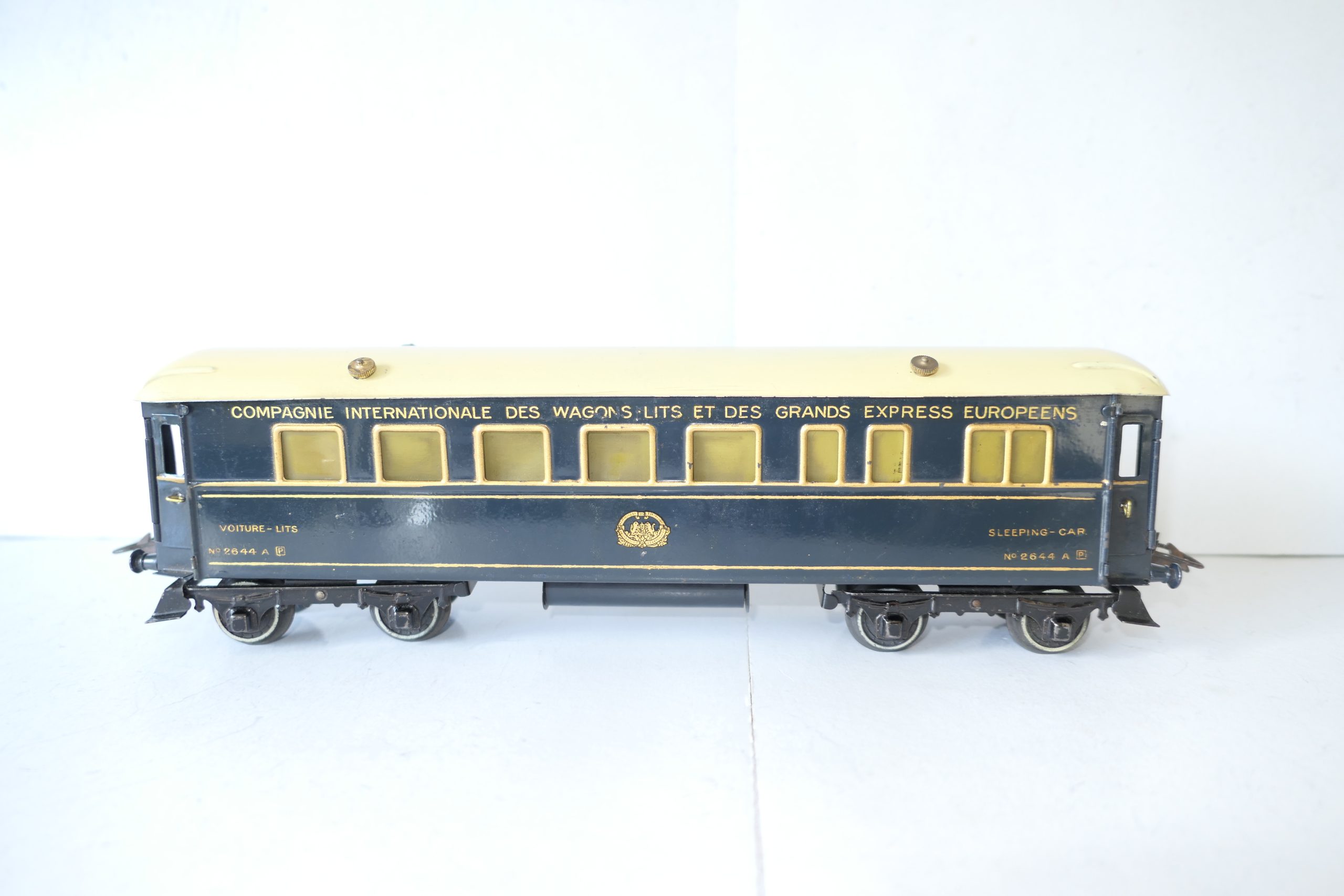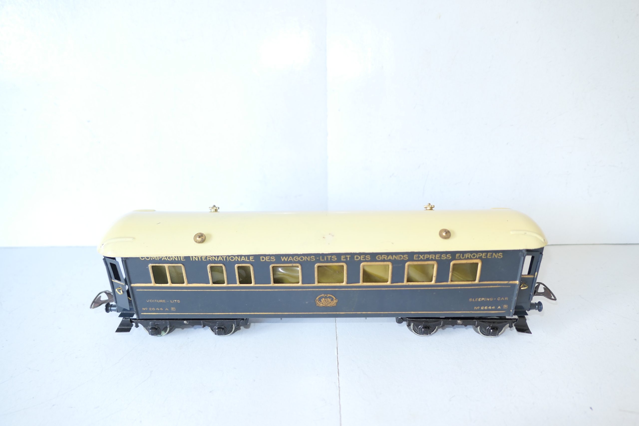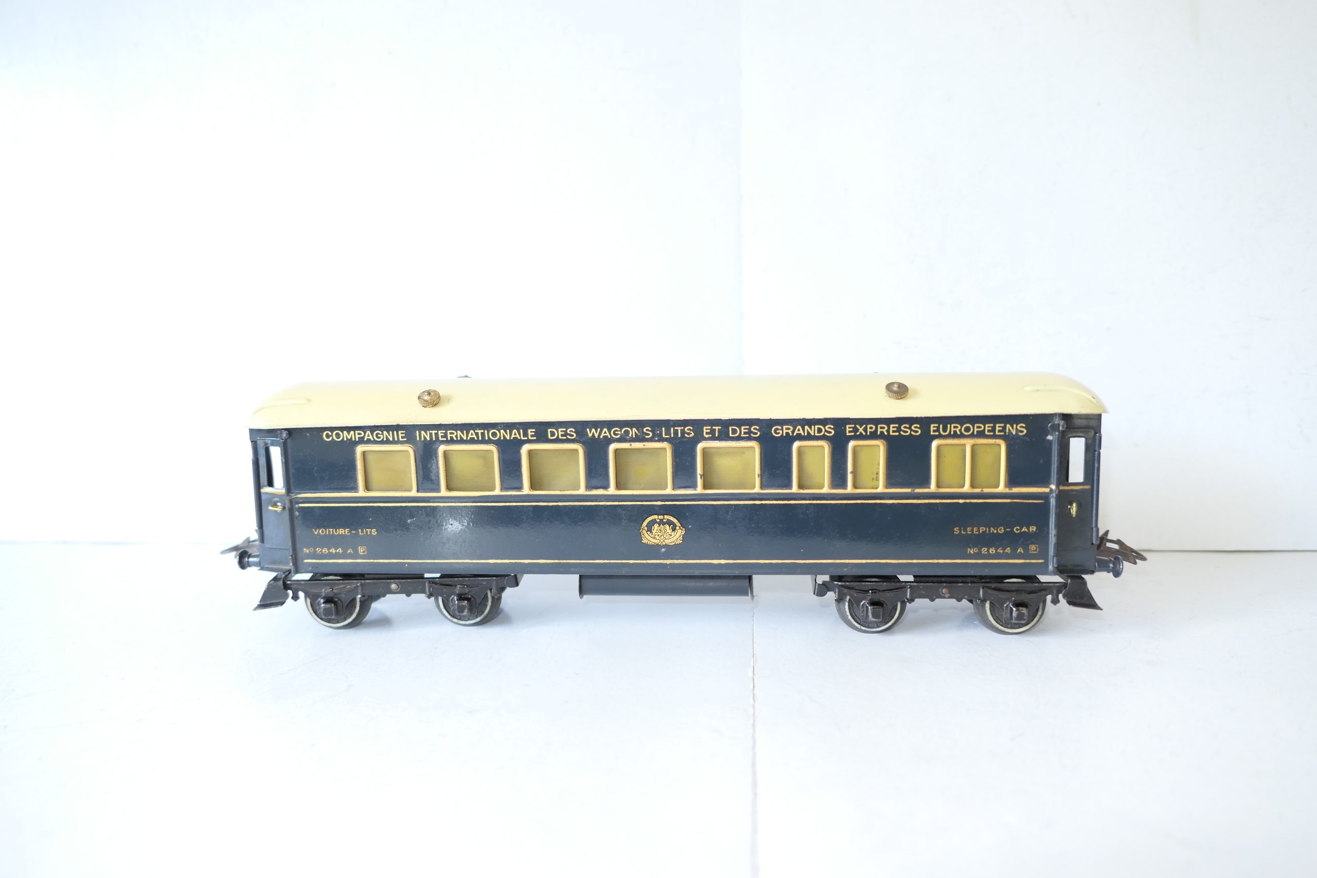 Hornby 0 Gauge Wagon-Lits Grand European Express all Blue Sleeping Car – unboxed – Excellent – Here we have one of a pair Wagon-Lits Grand European Express all Blue Sleeping car. All blue car with gold lettering and lining, sides are Excellent, roof is Good/pluso, unboxed. We have a pair the other being the Dining Car, so have a look they make a nice train.